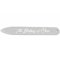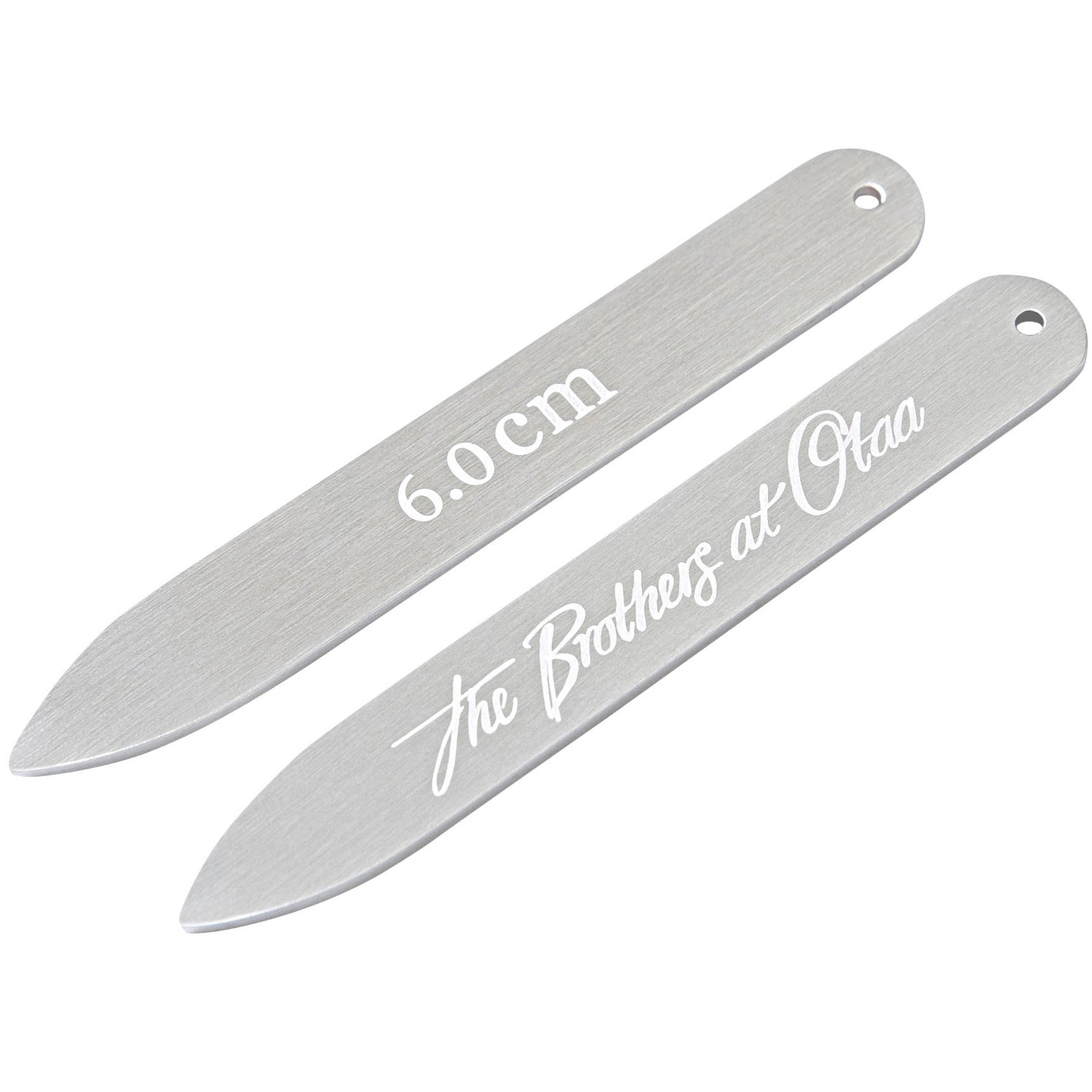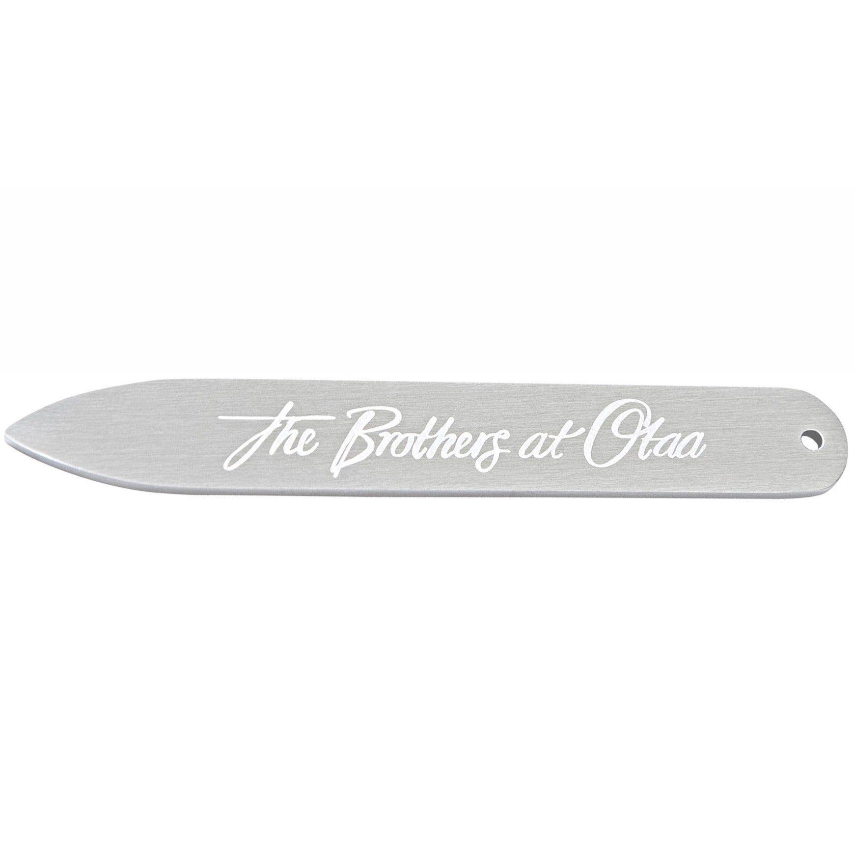 A sleek staple by the Brothers at OTAA, the Brushed Silver Collar Stays marry functionality with sophistication. Collar stays are wardrobe essentials that are designed to keep your shirt collar looking flat and clean-lined throughout the day. OTAA's Brushed Silver Collar Stays offer two thin plates of metal that are to be inserted into the seams of your shirt collar, making it stand flat against your collarbone. A must-have essential to grant you peace of mind throughout the day, these exclusive collar stays are imbued with a brushed silver complexion and an exquisitely engraved signature. It's a gift from us to you.