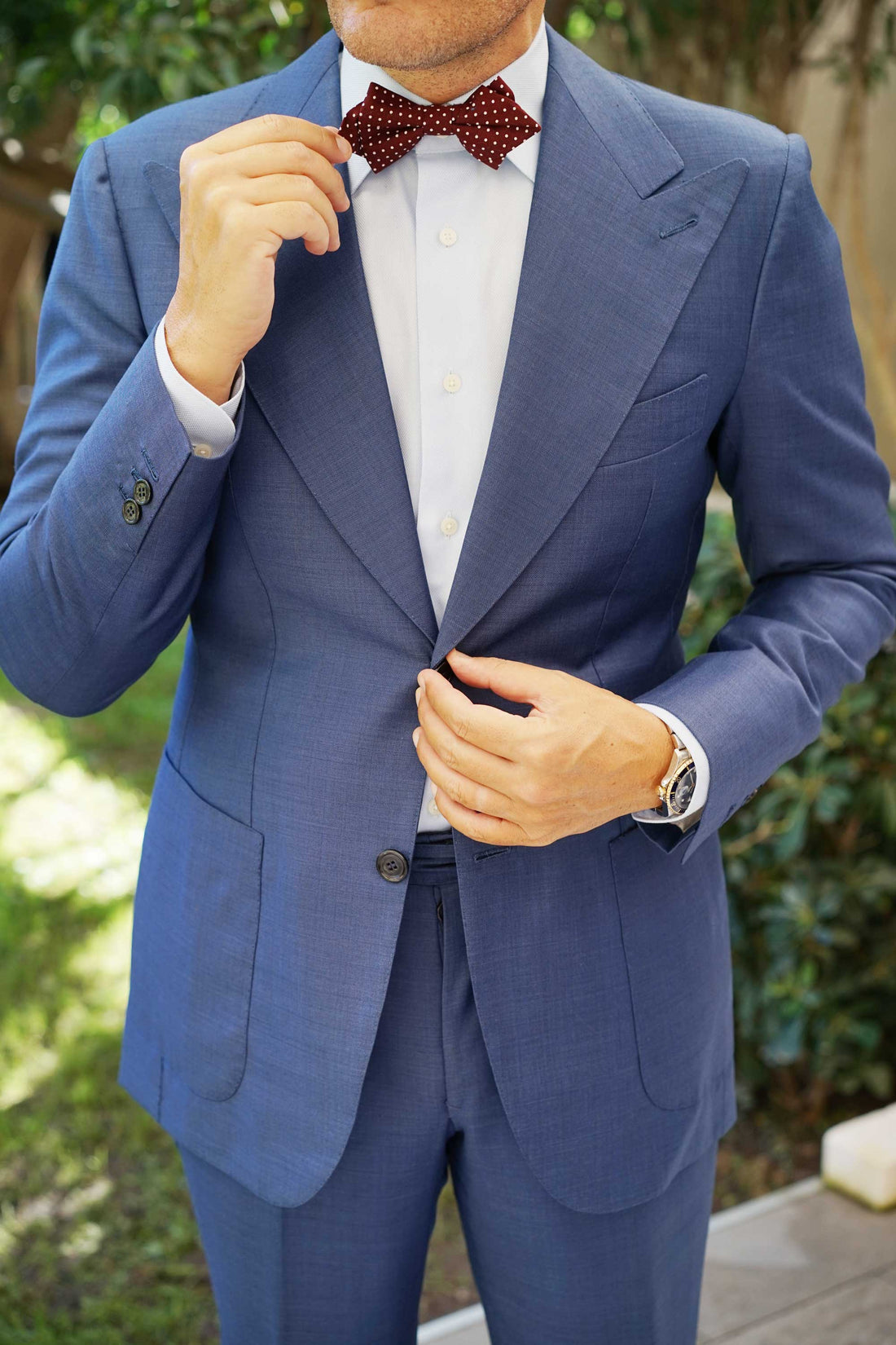 When elaborating on why this Burgundy Cotton Polkadot Diamond Bowtie excels, the elder brother at OTAA explains, “it's a combination of cut, cloth and attention to detail". Elegantly constructed and tailored with a hand-sewn approach, this magnificent diamond pre-tied bowtie emanates a high-quality presence as part of formal ensembles.