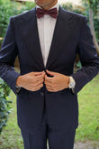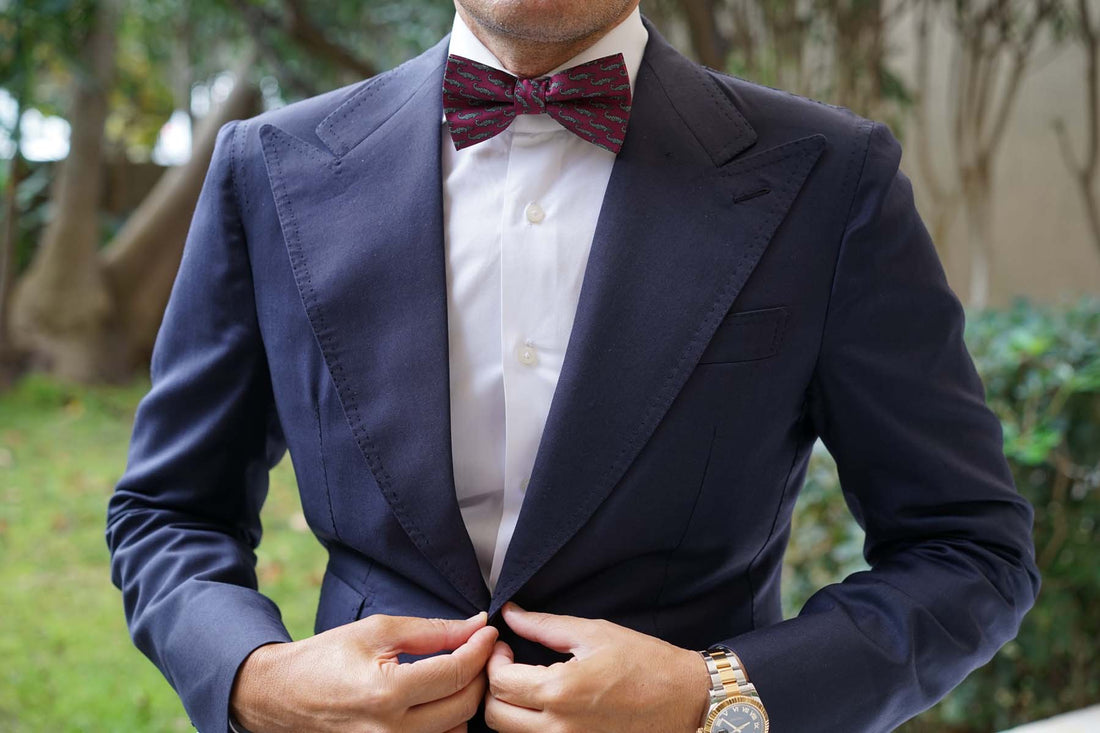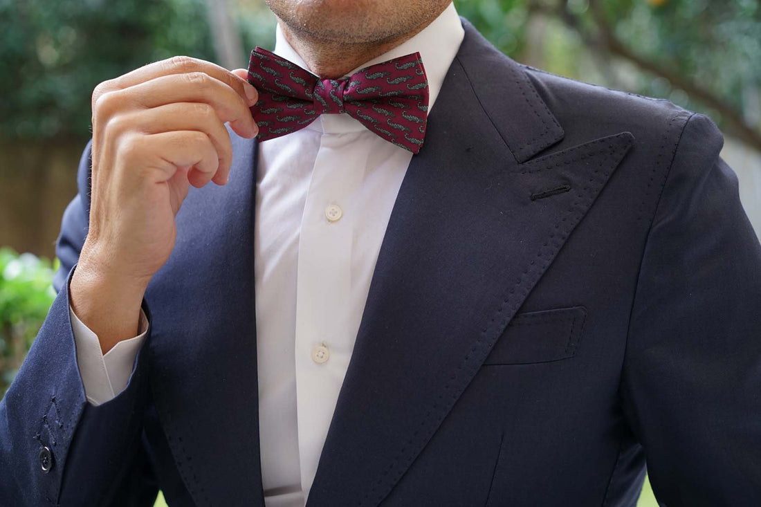 This dashing Burgundy Crocodile Dundee Bow Tie is crafted from a plush fabric and hand-stitched to perfection. The luxurious burgundy and green palette provides a regal accent to your formal and laidback looks. Wear this superb pre-tied bowtie to give a sharp completion to your work-week ensembles. Designed exclusively by the Brothers at OTAA.