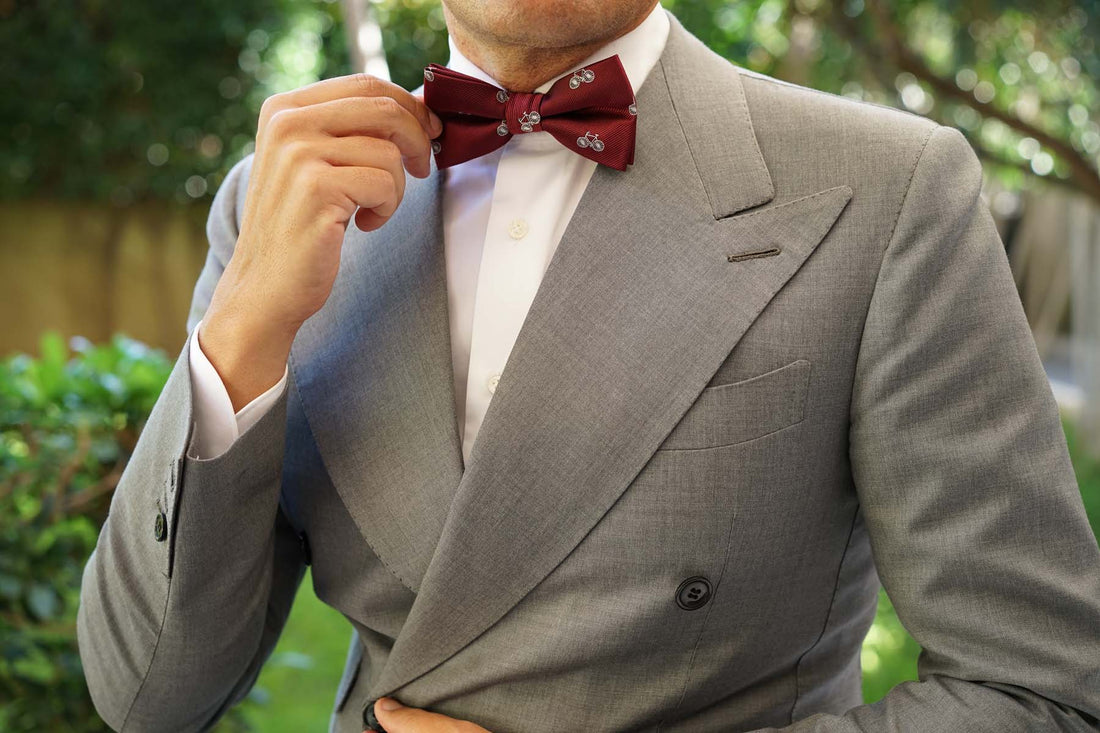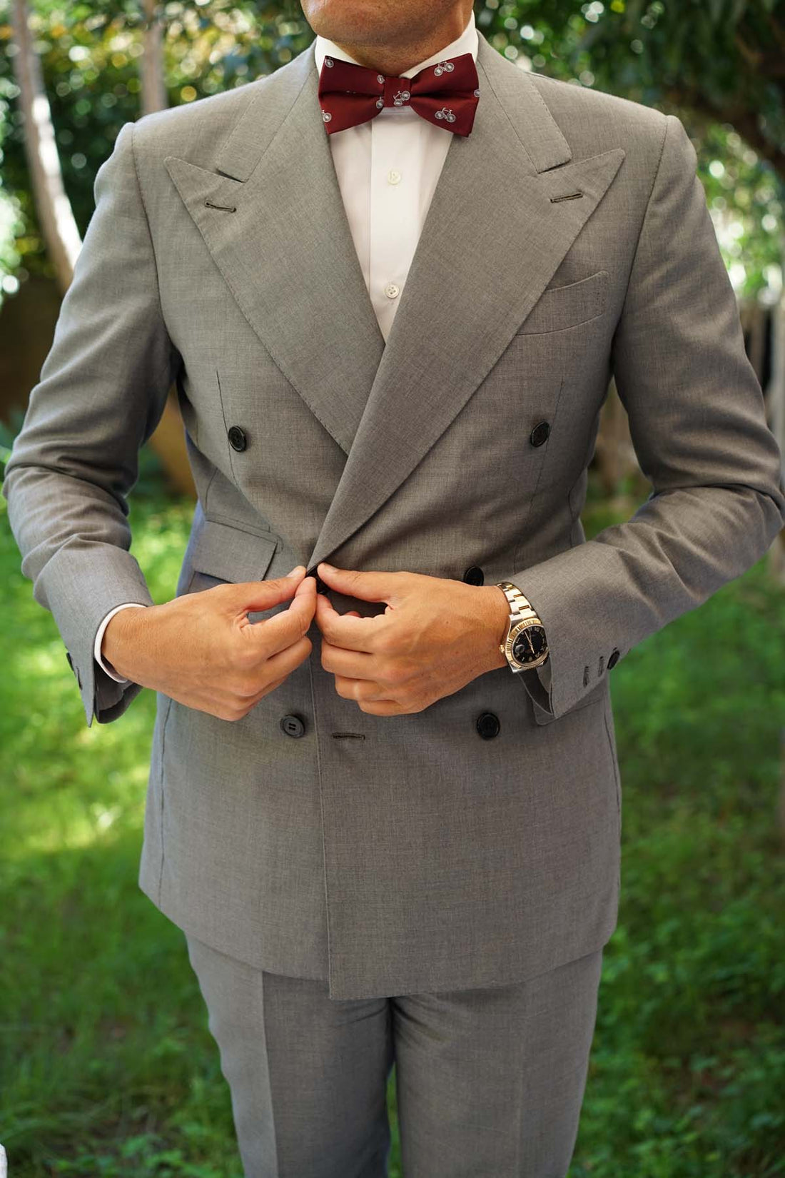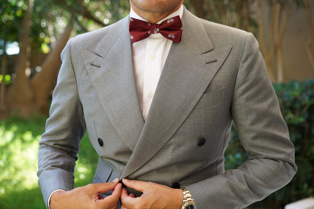 Luxuriously handcrafted from a fine satin cloth, this pre-tied bowtie features a textured surface with lavish bicycle motifs. The rich burgundy palette invokes a decadent appeal that’s superbly complemented by the white bicycle accents. Wear this Burgundy French Bicycle Bow Tie to give a refined completion to formal ensembles. Designed exclusively by the Brothers at OTAA.