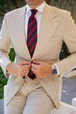 Sewn by hand and constructed with elegance, this necktie showcases OTAA's high-quality signature. The bold navy and burgundy diagonal stripes give this tie an eye-catching appeal. With minimal machine interference and a hand-tailored design, the Burgundy & Navy Blue Stripes Tie exudes luxurious comfort and sleek style. Designed exclusively by the Brothers at OTAA.