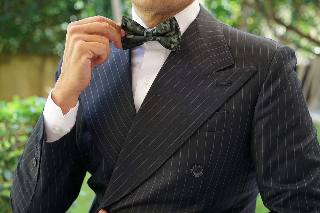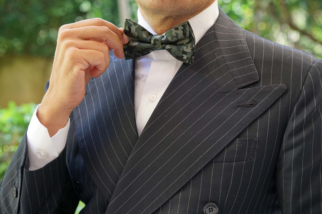 Hand-sewn to perfection using little machine interference, this Camouflage Army Green Bow Tie boasts superior quality. The multi-toned green & black palette is met with a striking camo design that will imbue your tailored ensembles with an intricate feature. This pre-tied bowtie provides the perfect staple to escort you from boardroom meetings in the afternoon to wild jungle adventures in the evening. Designed exclusively by the Brothers at OTAA.