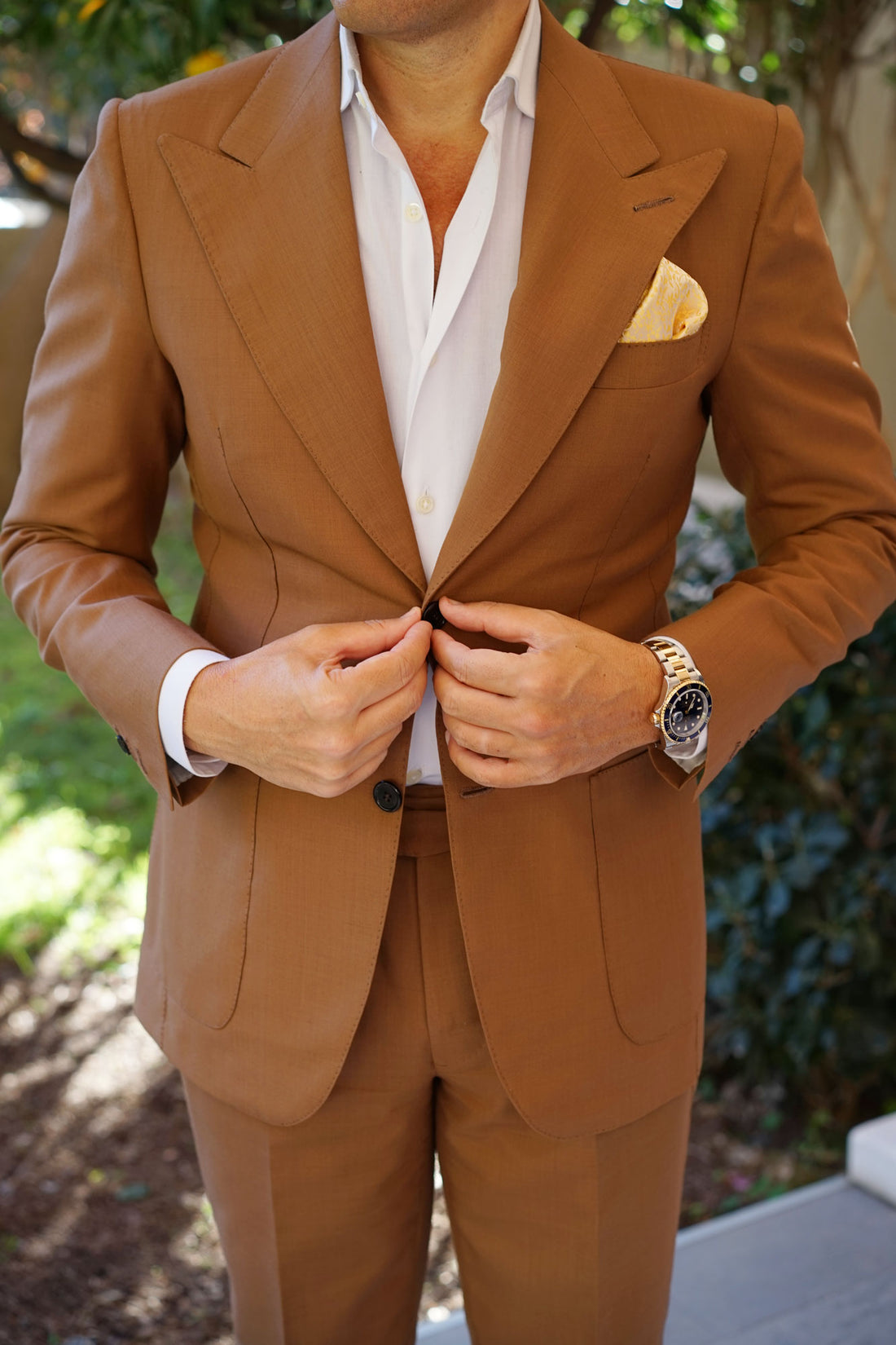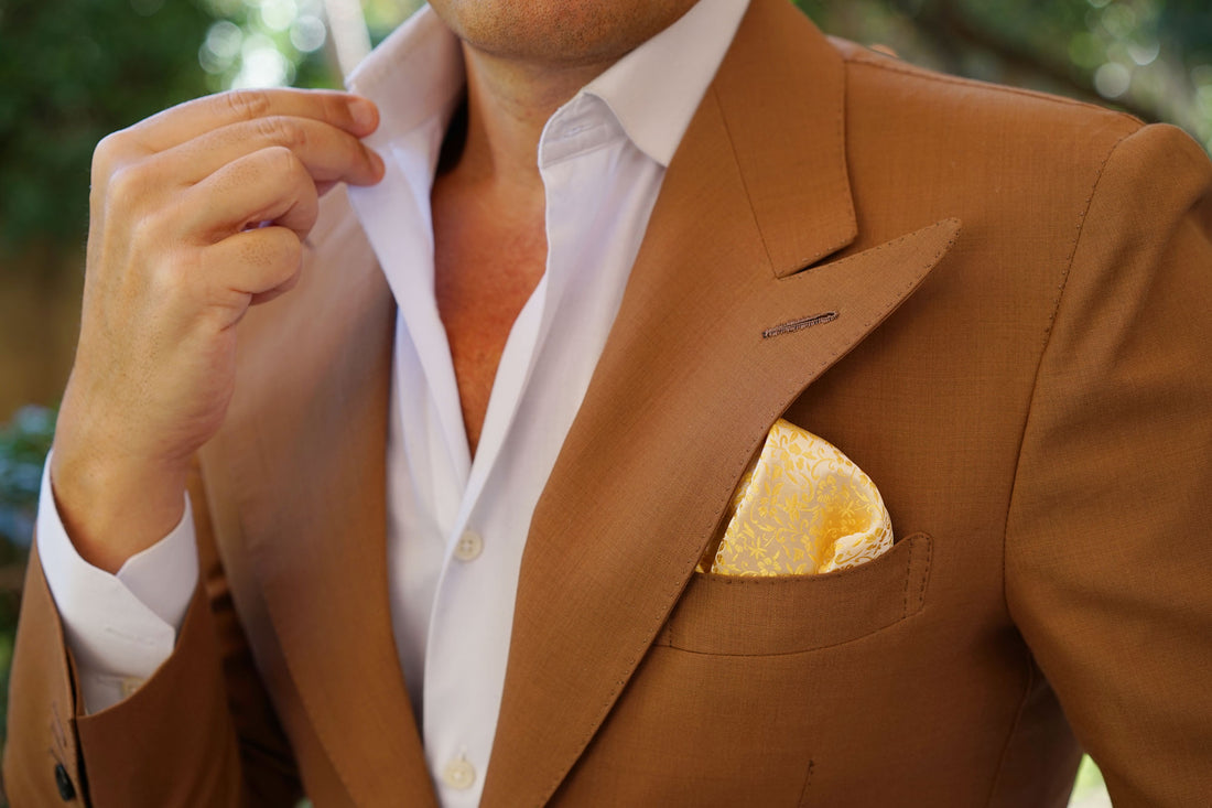 The opulent canary yellow stitch-work of the floral brocade sits perfectly against the lighter shades of the pearl star backdrop as both shimmer in harmony, enriching the Canary Yellow Floral Fields Handkerchief with pure class. The high-fidelity fabric is smooth to the touch, designed exclusively by The Brothers at OTAA.