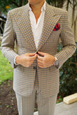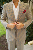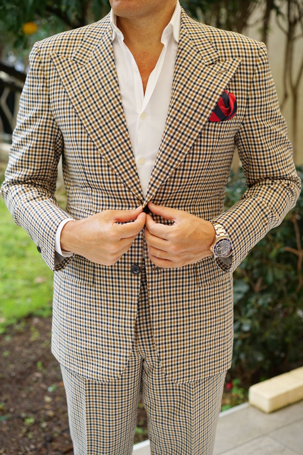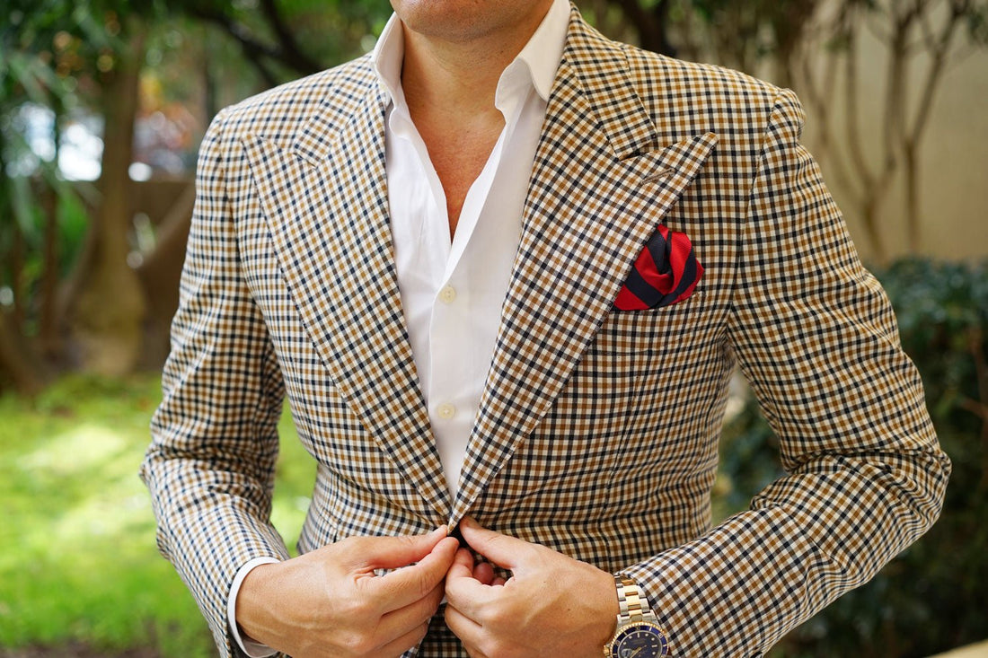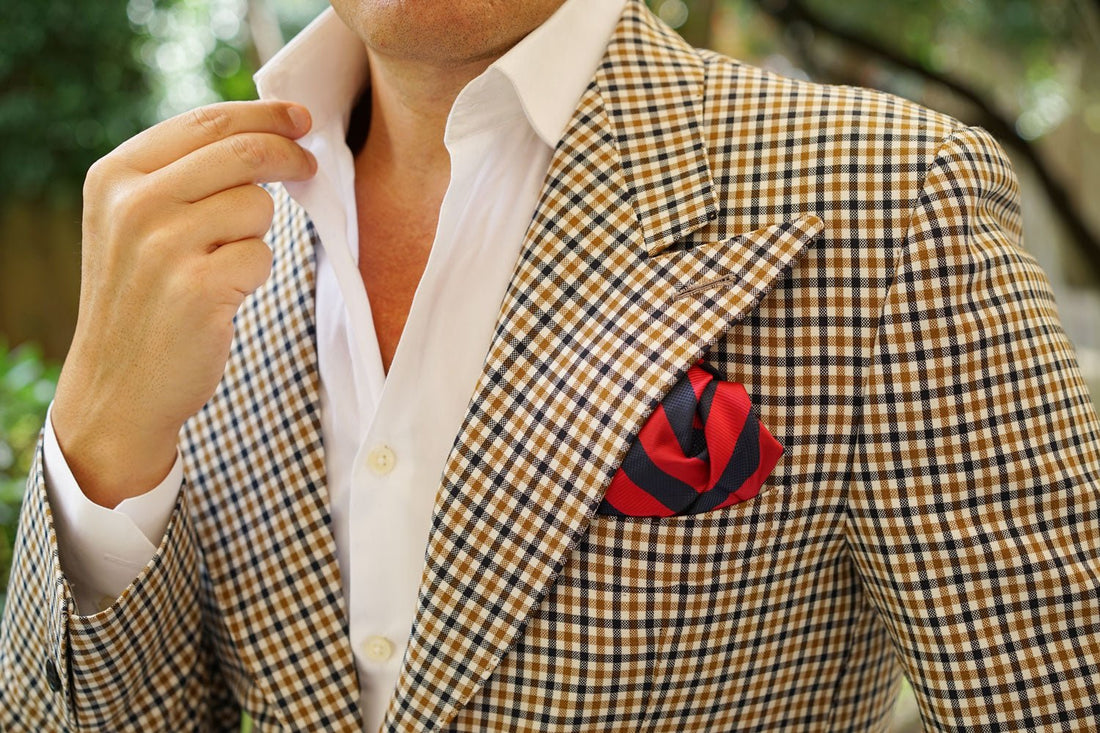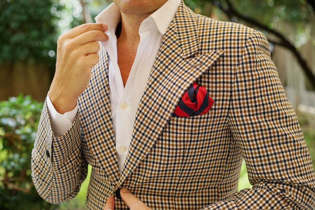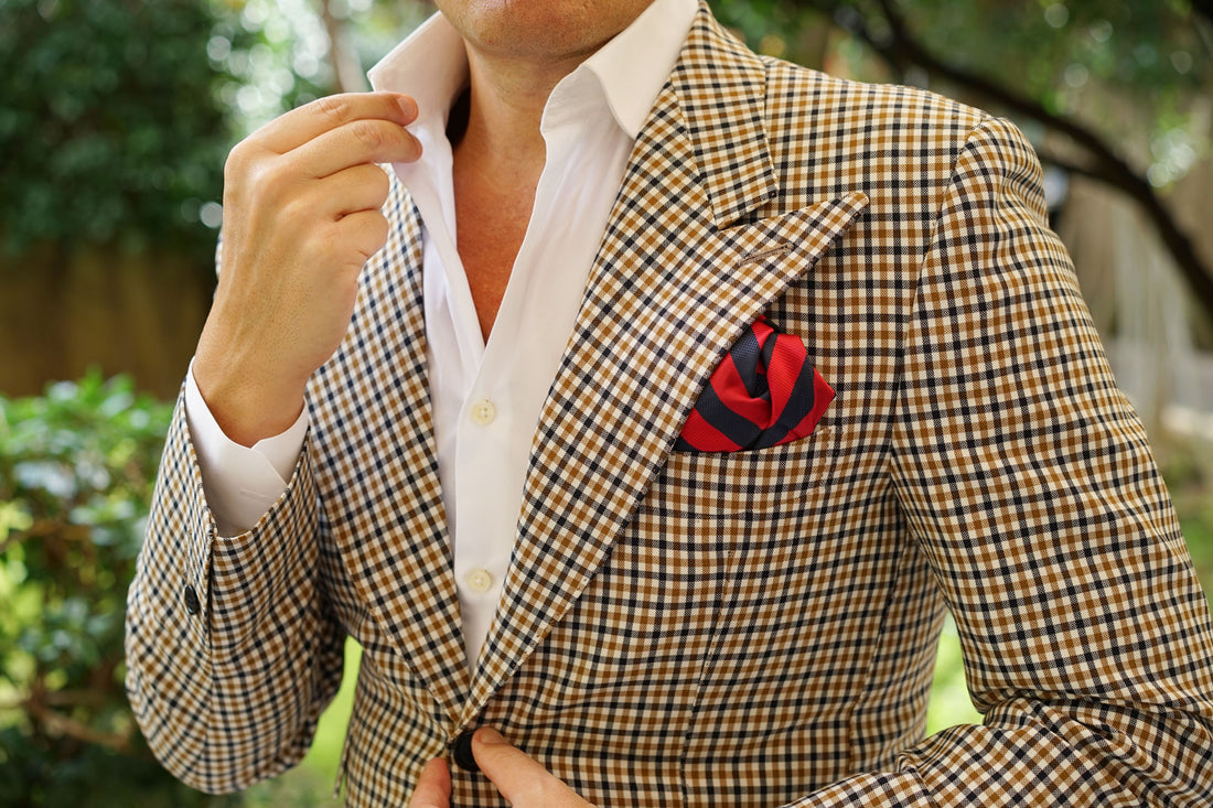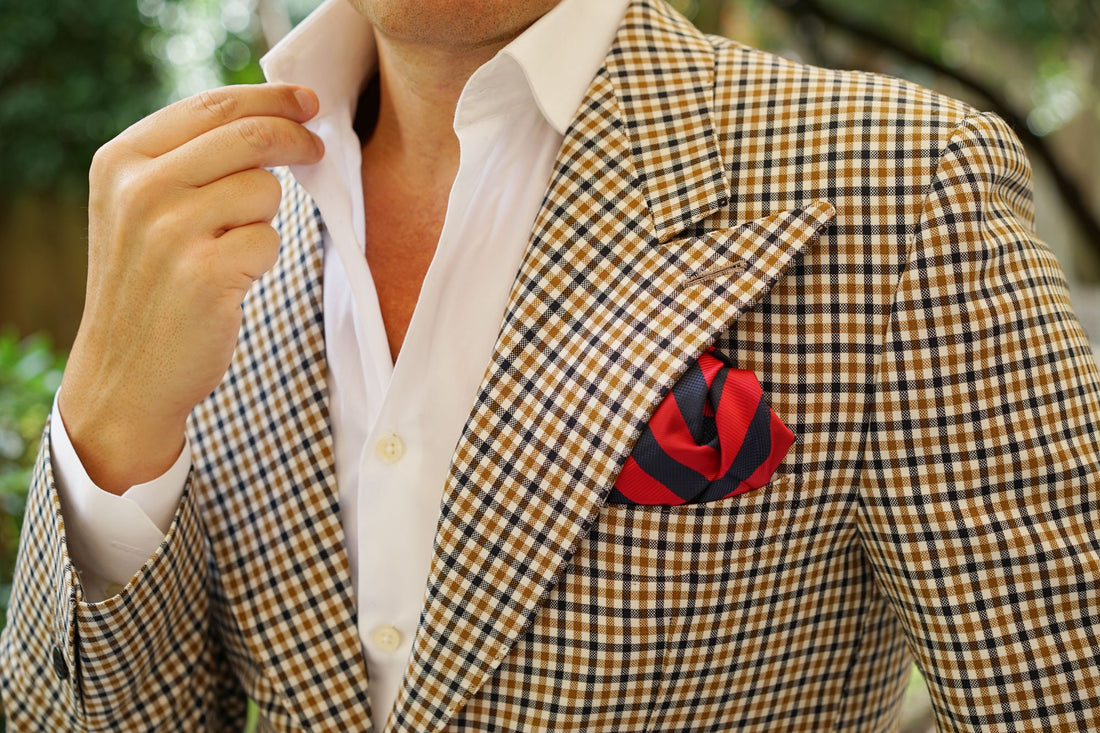 Two thick strokes of satin fabric alternate over the body, one being a gently shimmering rich apple red, stitched diagonally with a variety in the breadth of the weave down the body. The other, a checker stitched flecking of midnight blue on black, accentuated with a slightly glossy admiral navy-blue speckling. This combination of elaborately combined textures is soft to the touch and feels just as good as it looks. The Canterbury Red with Navy Striped Handkerchief is a strong addition to any eye-catching ensemble and will steer the ship of your fashion game into pristine waters.