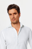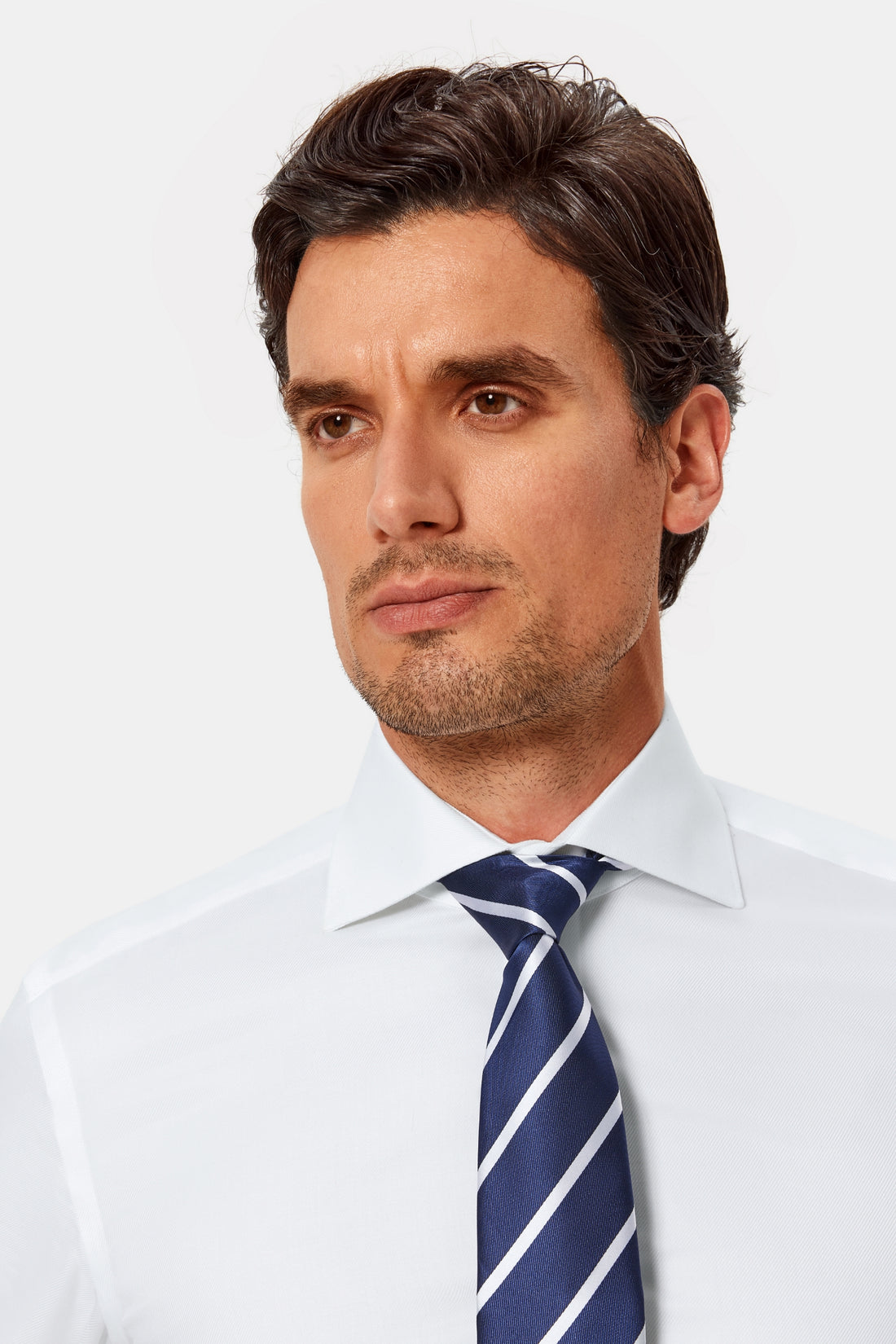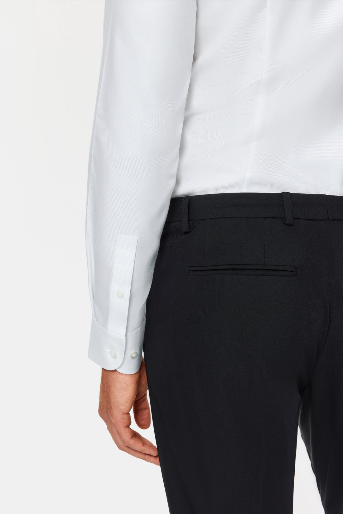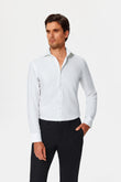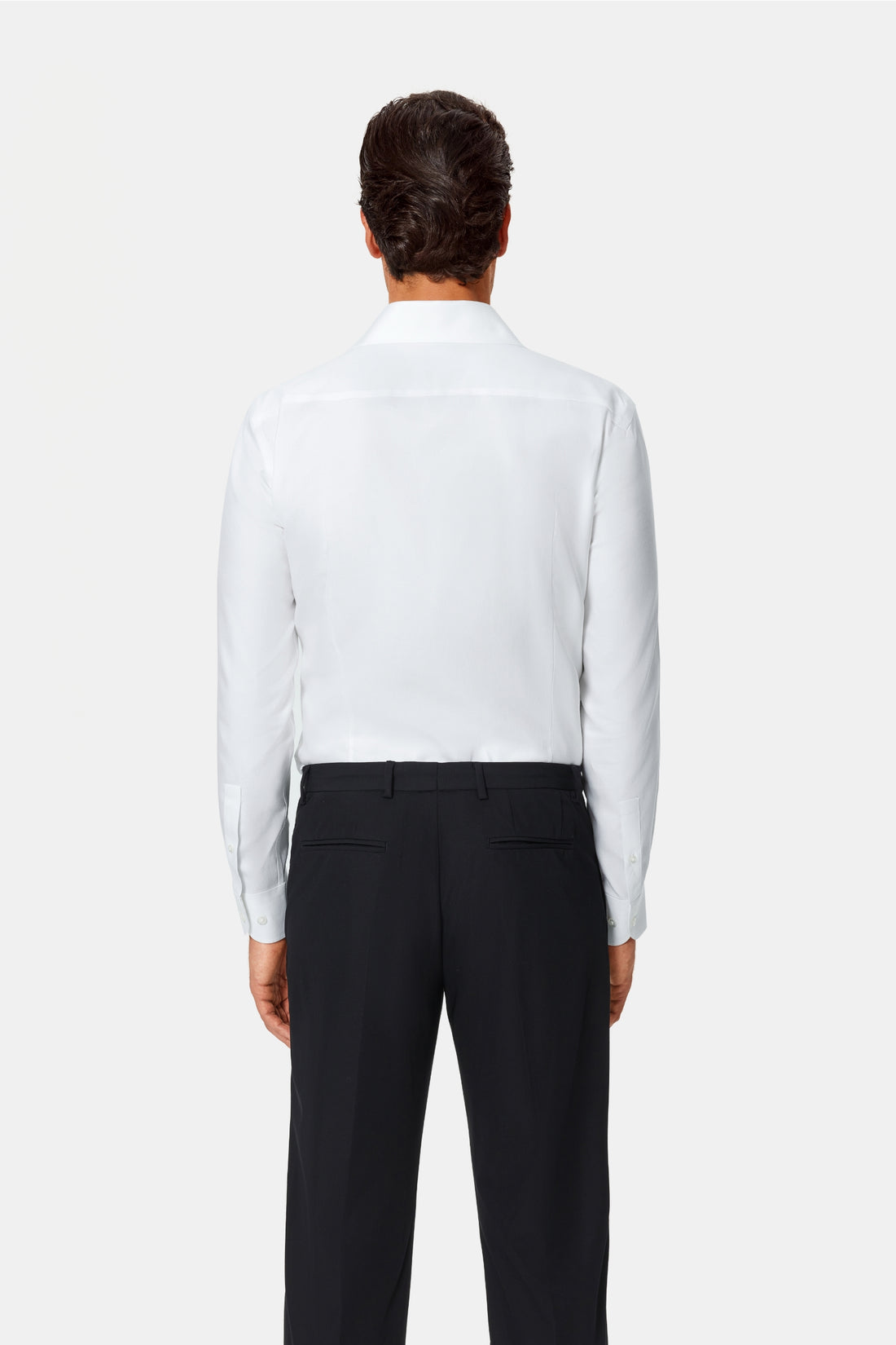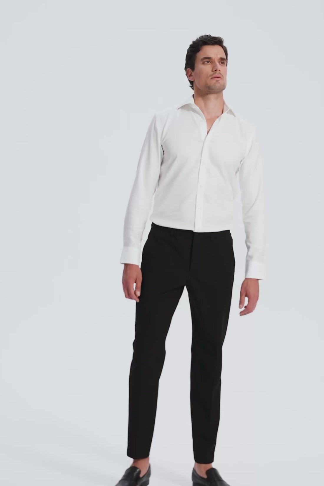 Designed for both style and practicality, this shirt includes an in-built soft collar stay to maintain a sharp, structured collar. The adjustable button cuffs provide a perfect fit, while the clean finish without top stitching adds to its sleek, minimalist appeal. The durable fabric is built to withstand frequent washing, ensuring this shirt remains a reliable and stylish option for years to come. Perfect for any occasion, the Carruthers White Lucious Non-Iron Shirt epitomizes effortless sophistication and comfort.