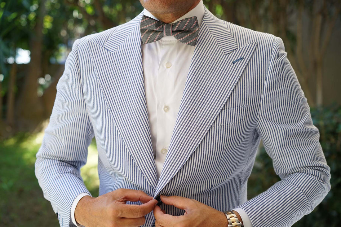 Sweetly decorated with a cherry red pinstripe, this Cherry Red Pinstripe Pre-tied Bowtie makes a dashing addition to your workweek roster. The hand-stitched features and luxuriously tailored body gives this cotton pre-tied bowtie a high-quality edge. Diagonally striped and finessed in grey, this superb pre-tied bowtie is an unmistakable design by the dedicated Brothers at OTAA.