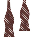 Assembled in-house by hand, the satin fabric is cut, sewn and stitched to perfection. Thin ribbons of chromatic white diagonally lash the gentle sheen of the mocha body. Multi-directional weavings add to the charm, creating a ravishing combination of textures, enticingly balanced with a classic, minimalist design. The Chocolate Brown Double Stripe Untied Bow Tie is worth its weight in golden tickets.