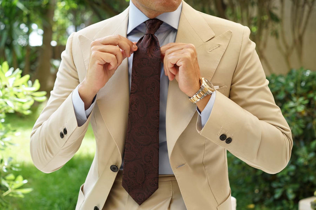 The earthy Cinnamon gleam of the paisley motif against the deep black backing of satin makes for an understated palette. The paisley is a winning combination of intricately varying strokes and shapes in a classic teardrop design, shimmering gently with a finely textured feel to the touch. The Cinnamon Brown Paisley Tie will imbue your formal ensemble with stellar charm.