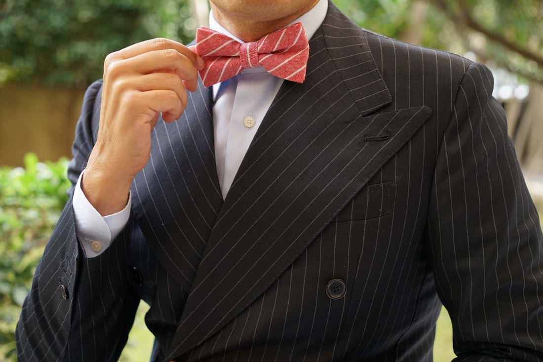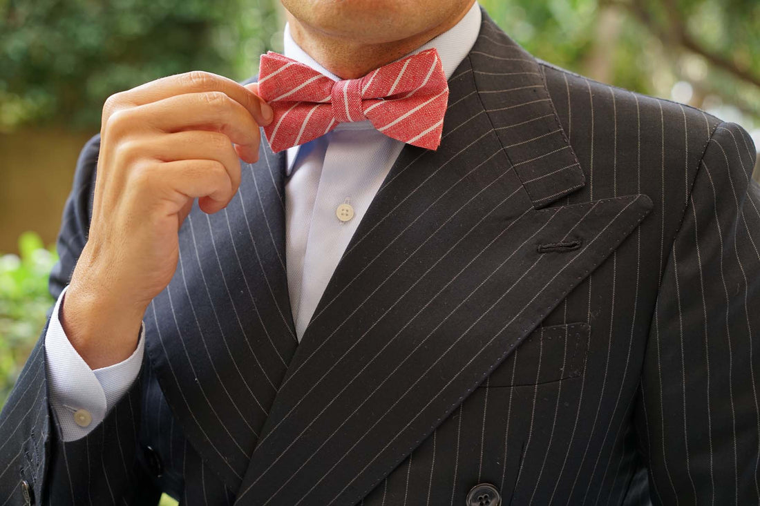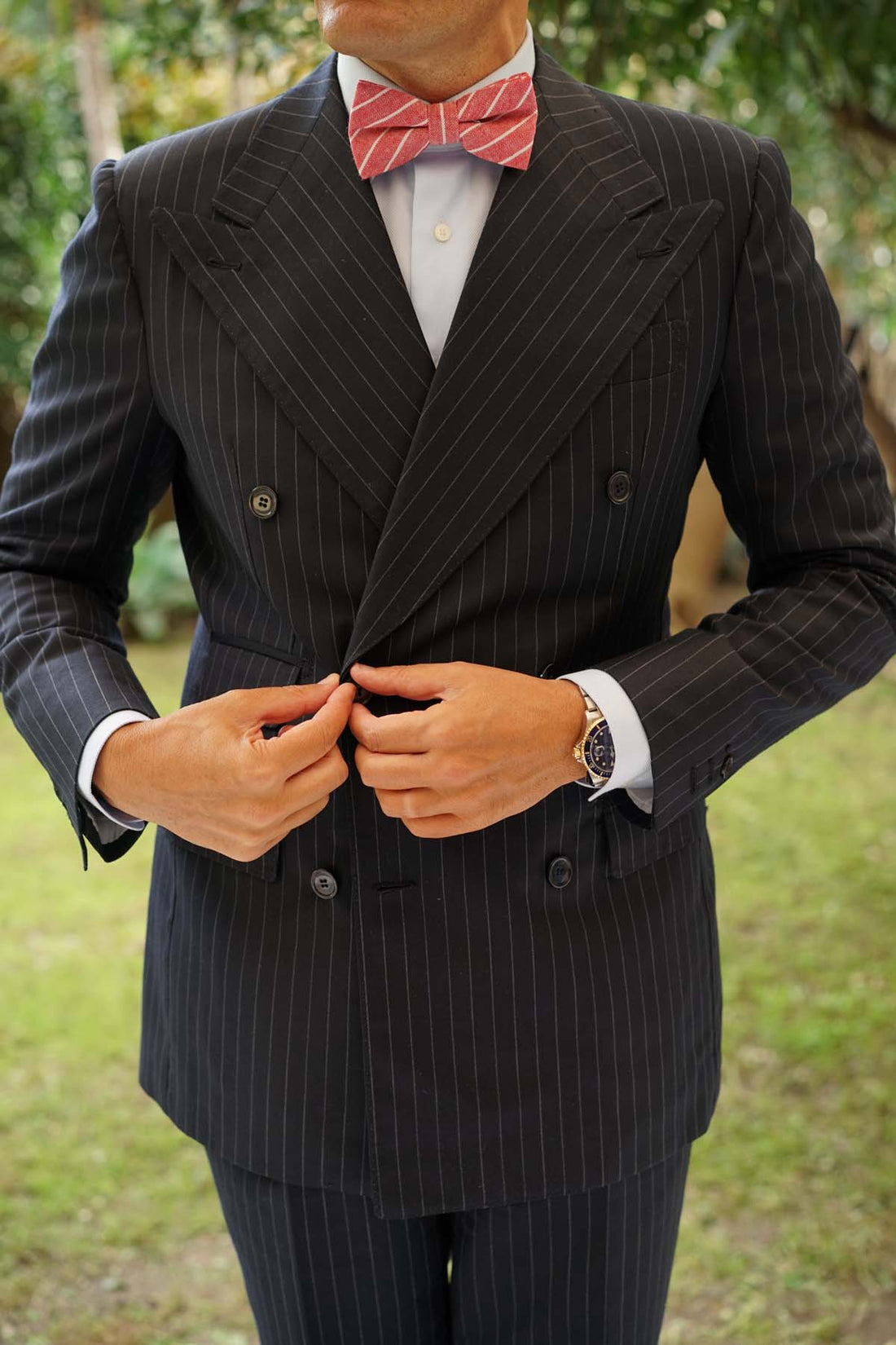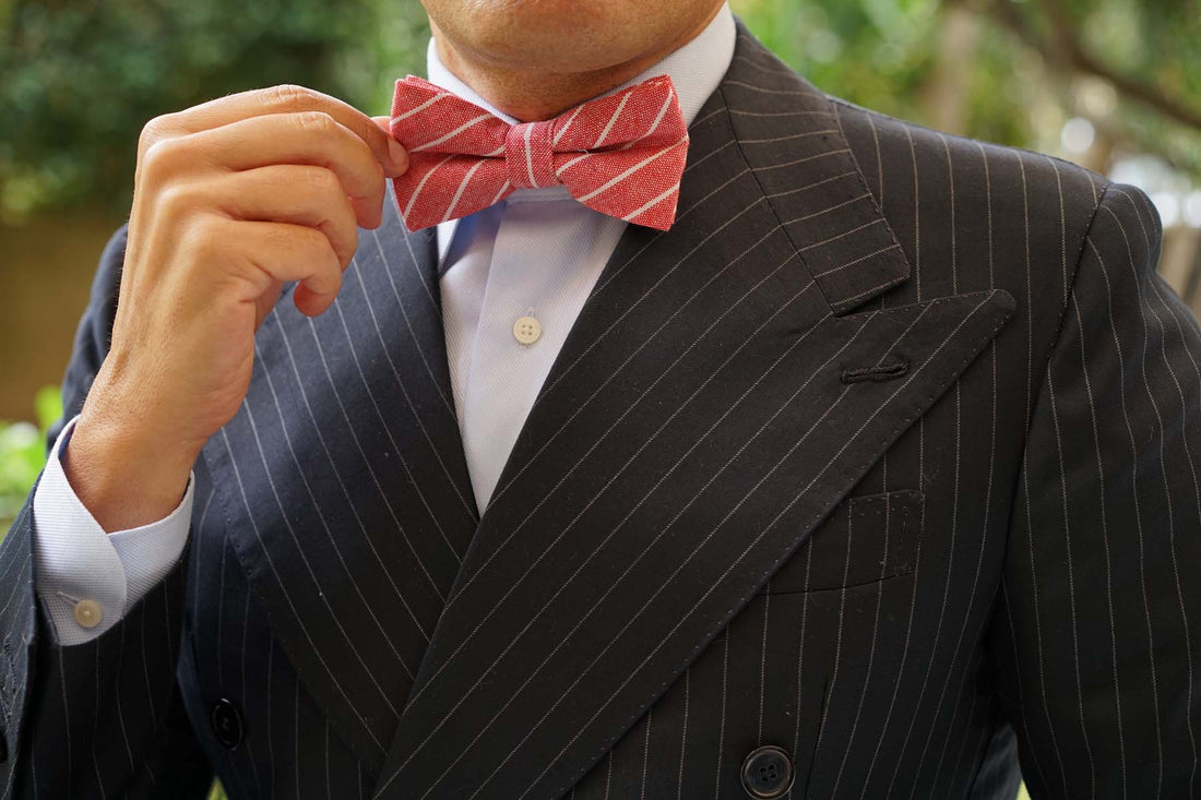 Luxurious details are part of OTAA’s rich philosophy, and this Crimson Red Linen Pinstripe Bow Tie boasts plenty. Designed to add a vivacious tone to your everyday tailoring, this superb pre-tied bowtie boasts an ebullient red palette with hand-stitched detailing. Exclusively designed by the Brothers at OTAA, this pre-tied bowtie is finessed with a refined pinstripe pattern and a classic diamond-cut finish; exemplifying the label’s dedication to superior quality. An eye-catching detail to your formal assemblage, this Crimson Red Linen Pinstripe Bow Tie provides a knock-out staple.