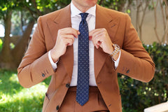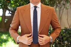 Menswear style is all about the details, and this simple polka dot print is sure to do the trick. Made by hand, this Dark Midnight Blue with White Polka Dots Thin Tie gives an updated spin on a classic print.