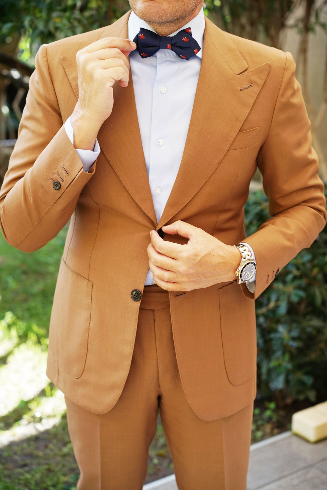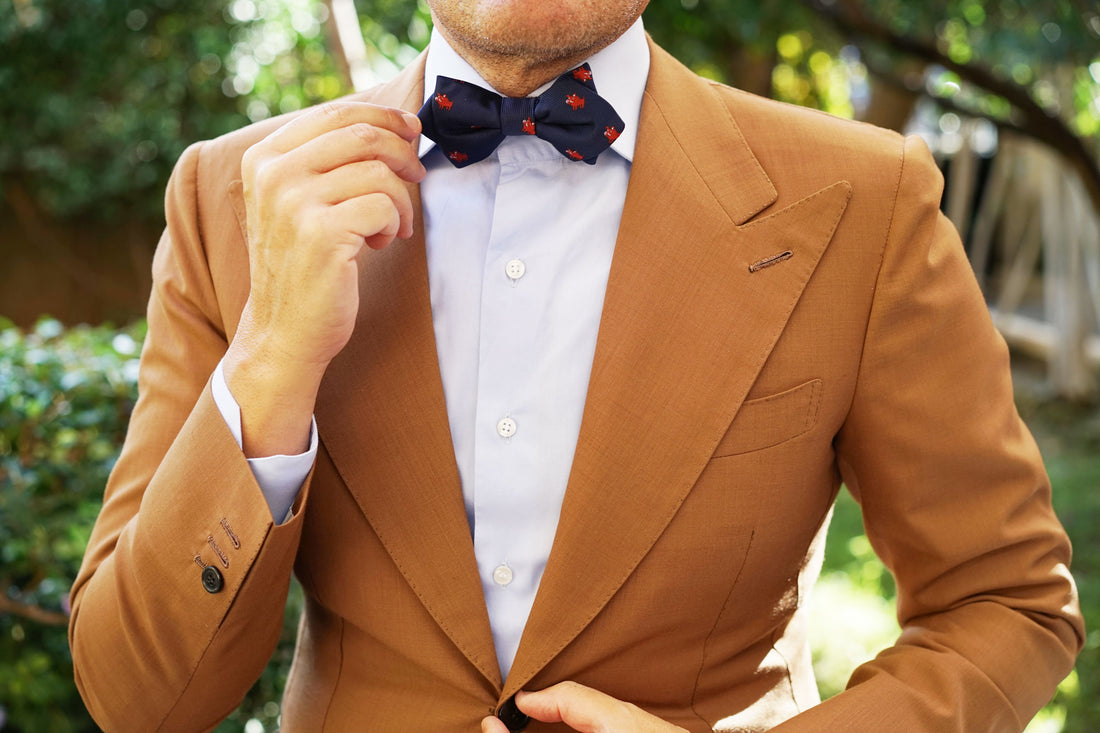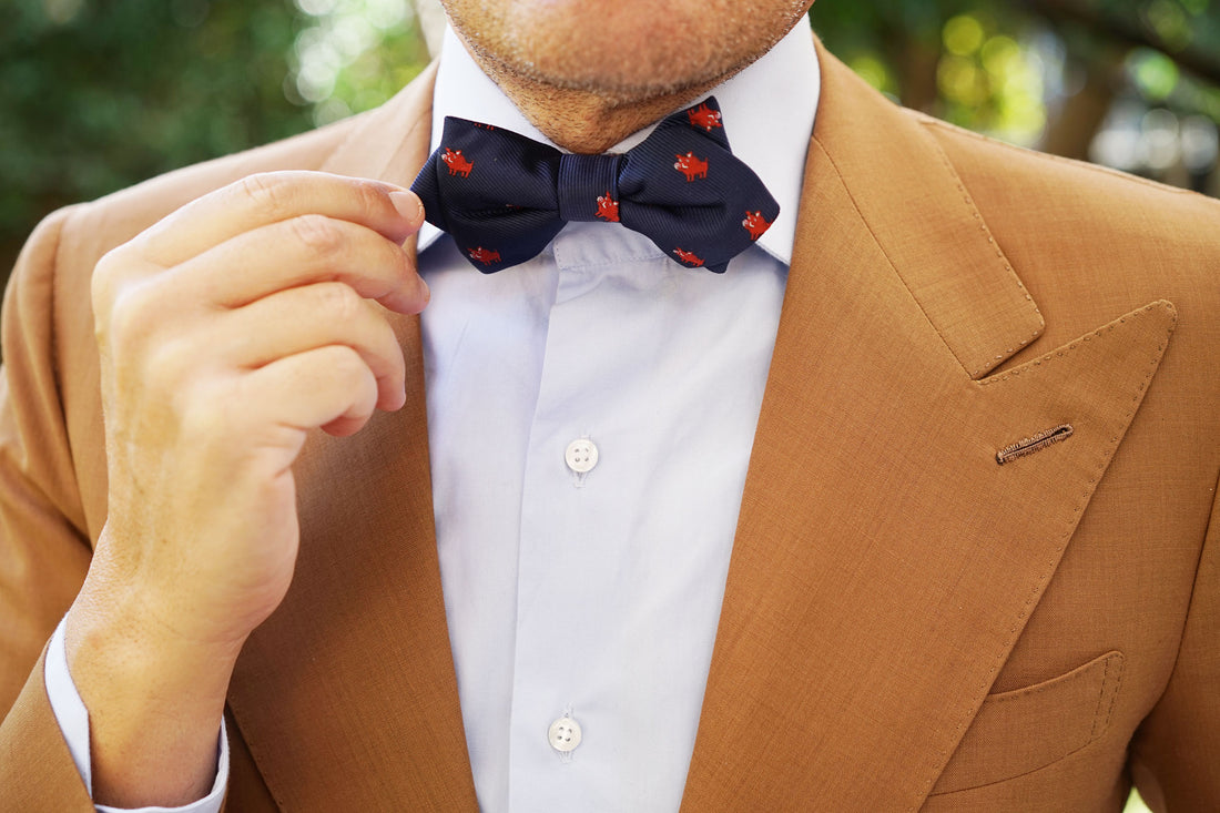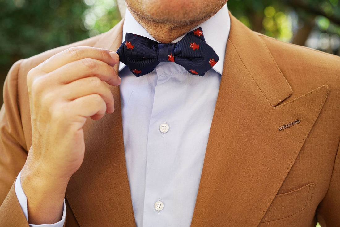This Desert Warthog Diamond Bow Tie is a knock-out. Crafted by hand and designed in Melbourne, it has been cut for a sharp, neat fit and finished with a handsome Prince of Wales navy blue backing to add a stylish point of difference. Residing in mainland Africa, when alarmed, the warthog grunts or snorts, lowers its mane, flattens its ears and bolts for underground cover. The reason for this specific behaviour is not fully known. Inspired by the warthog that is vaguely understood, we bring you the Desert Warthog Pre tied Diamond Bowtie. Designed exclusively by The Brothers at OTAA.