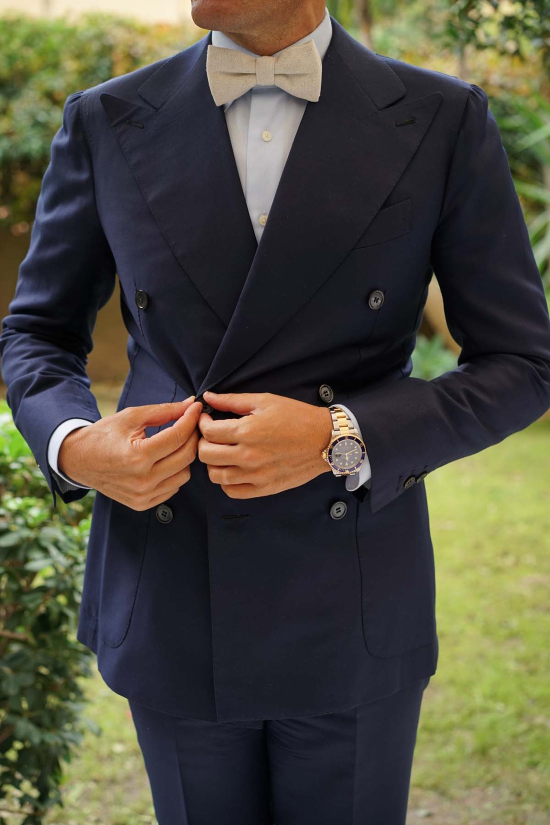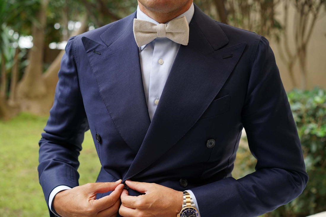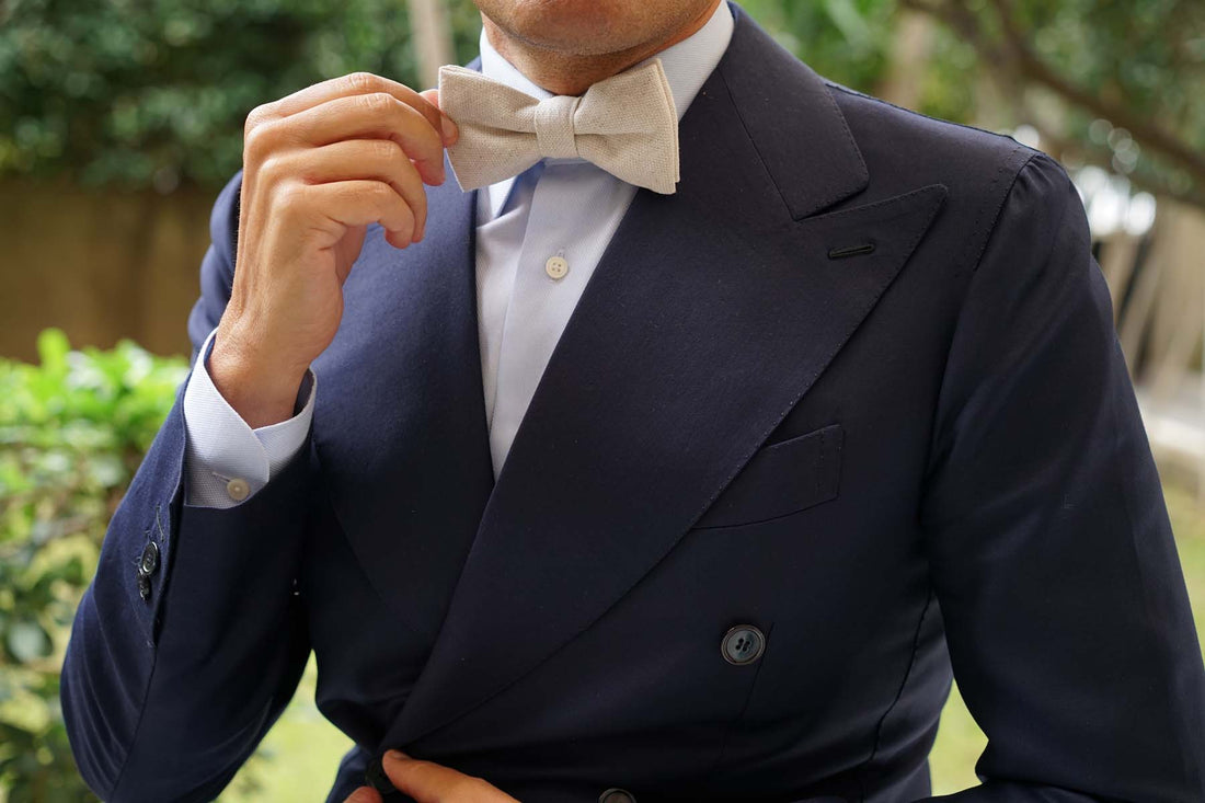 This elegant Dry Khaki White Linen Pre-tied Bowtie offers a lightly textured fabric that’s luxuriously soft on the skin. Adorned with a slightly off-white palette, this linen pre-tied bowtie brings a laidback outlook to your everyday ensembles. The soft white complexion is intercepted by subtle hints of multi-toned stitching to make this Dry Khaki White Linen Bow Tie a multifaceted staple. Designed exclusively by the Brothers at OTAA.