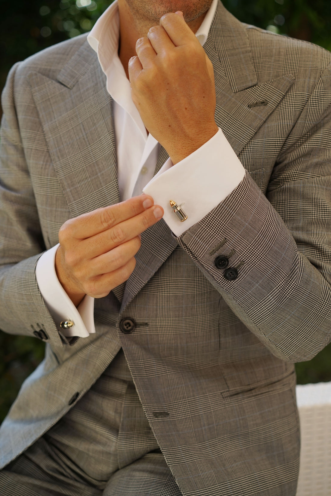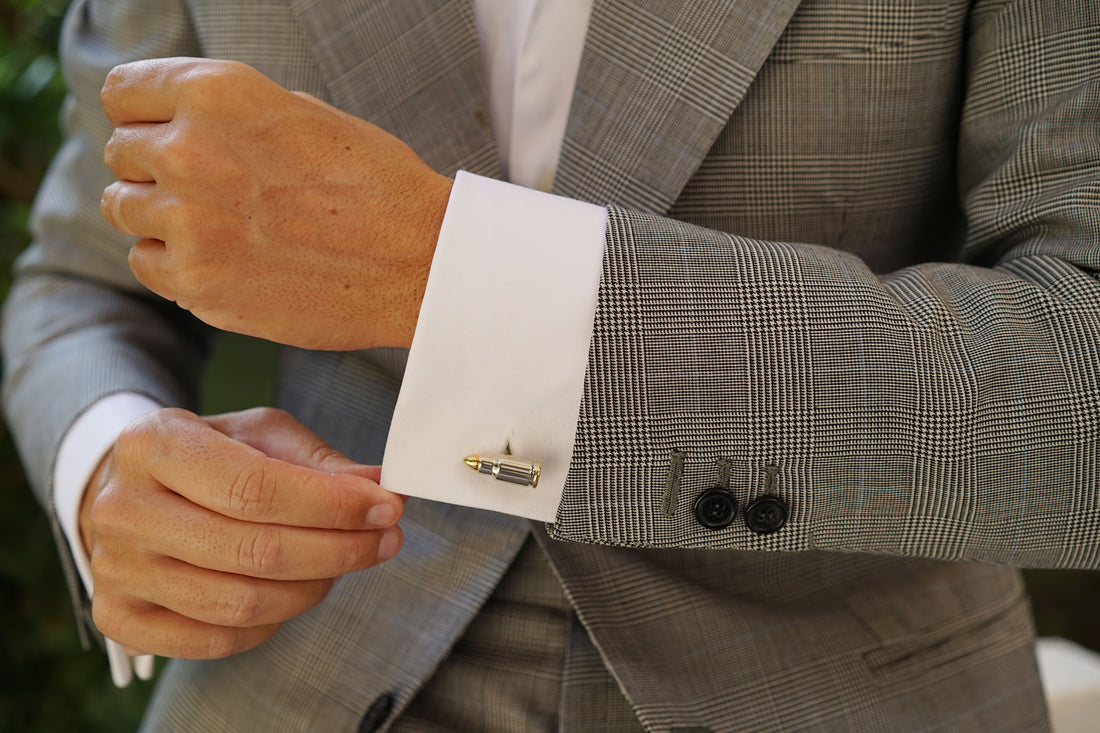 Impeccably hand-chiselled from rhodium and finessed with a luxurious gloss silver coating, these Eastwood Bullet Cufflinks will have your suit brimming with cool sophistication. These cufflinks feature flawless gold highlights that exquisitely accent the sharp bullet design. Paired with any ensemble for utmost refinement, these Eastwood Bullet Cufflinks will put a lethal detail in your stride.