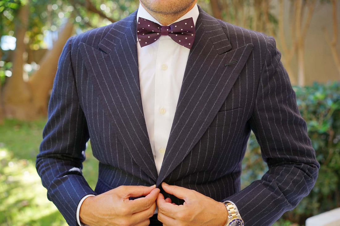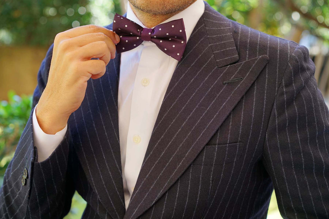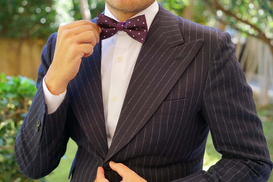 Menswear style is all about the details, and this Eggplant Plum Purple with White Polka Dots Bow Tie is sure to do the trick. Made by hand, this Eggplant Plum Purple with White Polka Dots Pre-tied bowtie gives an updated spin on a classic print.