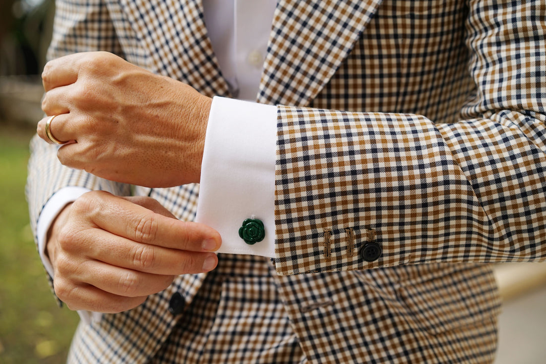 Add a tone of distinction to your attire with OTAA’s Emerald Green Rose Metal Cufflinks. The rose is a symbol of love and passion and you will love the way these stellar cuff links ties your whole ensemble together perfectly with its classic style and striking colour.