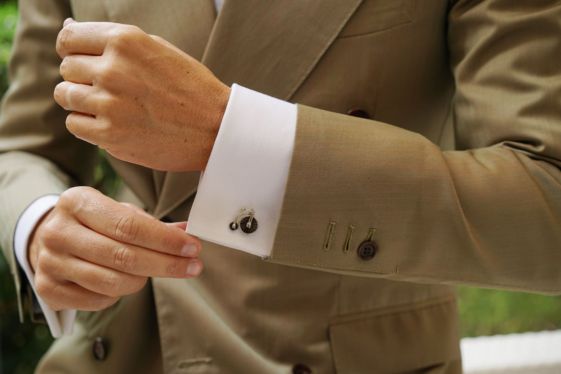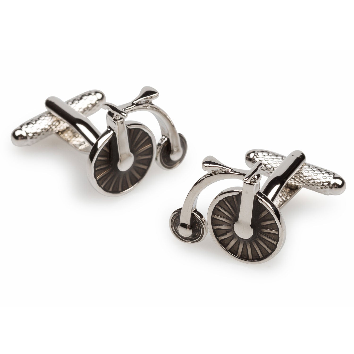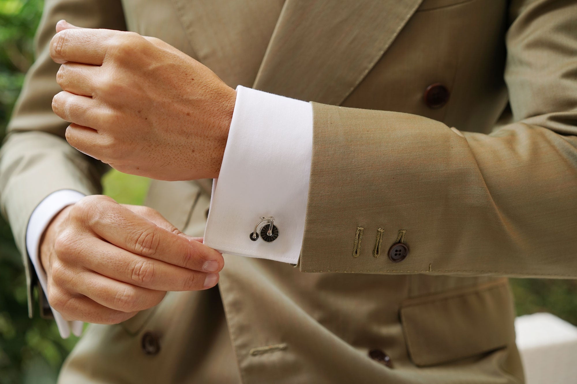 OTAA's immaculate English High Wheel Bicycle Cufflinks will finesse an ensemble with connotations of elegance and class. Traditionally only purchased by wealthy young men, the penny farthing was the first invented machine to be classified as a bicycle. A quintessential symbol of the Victorian era, these OTAA cufflinks will add an elegant detail to your look. These English High Wheel Bicycle Cufflinks are a fine addition to the OTAA assemblage as they boast flawless hand-chiselled details and a luxurious gloss finish. These penny farthings boast a dual colour palette that features a silver structure and gun coloured highlights on the wheels. Inciting a flair of old-fashioned charm, these English High Wheel Bicycle Cufflinks will have you rolling with style.