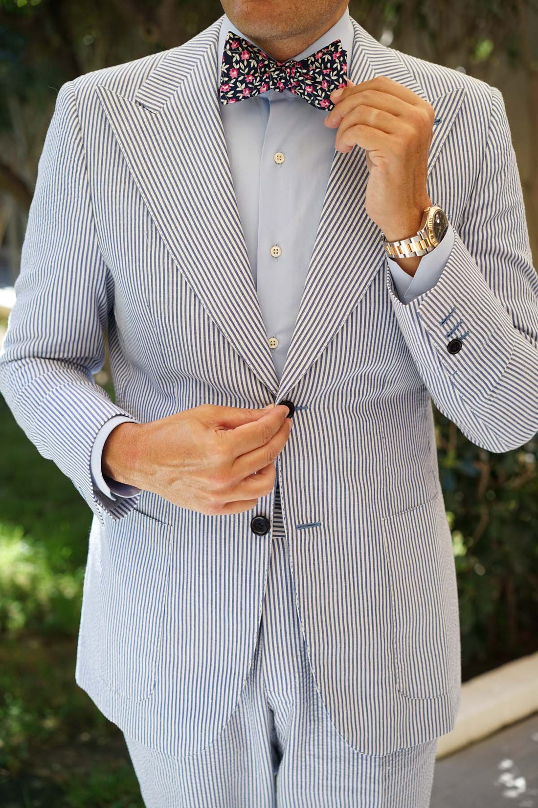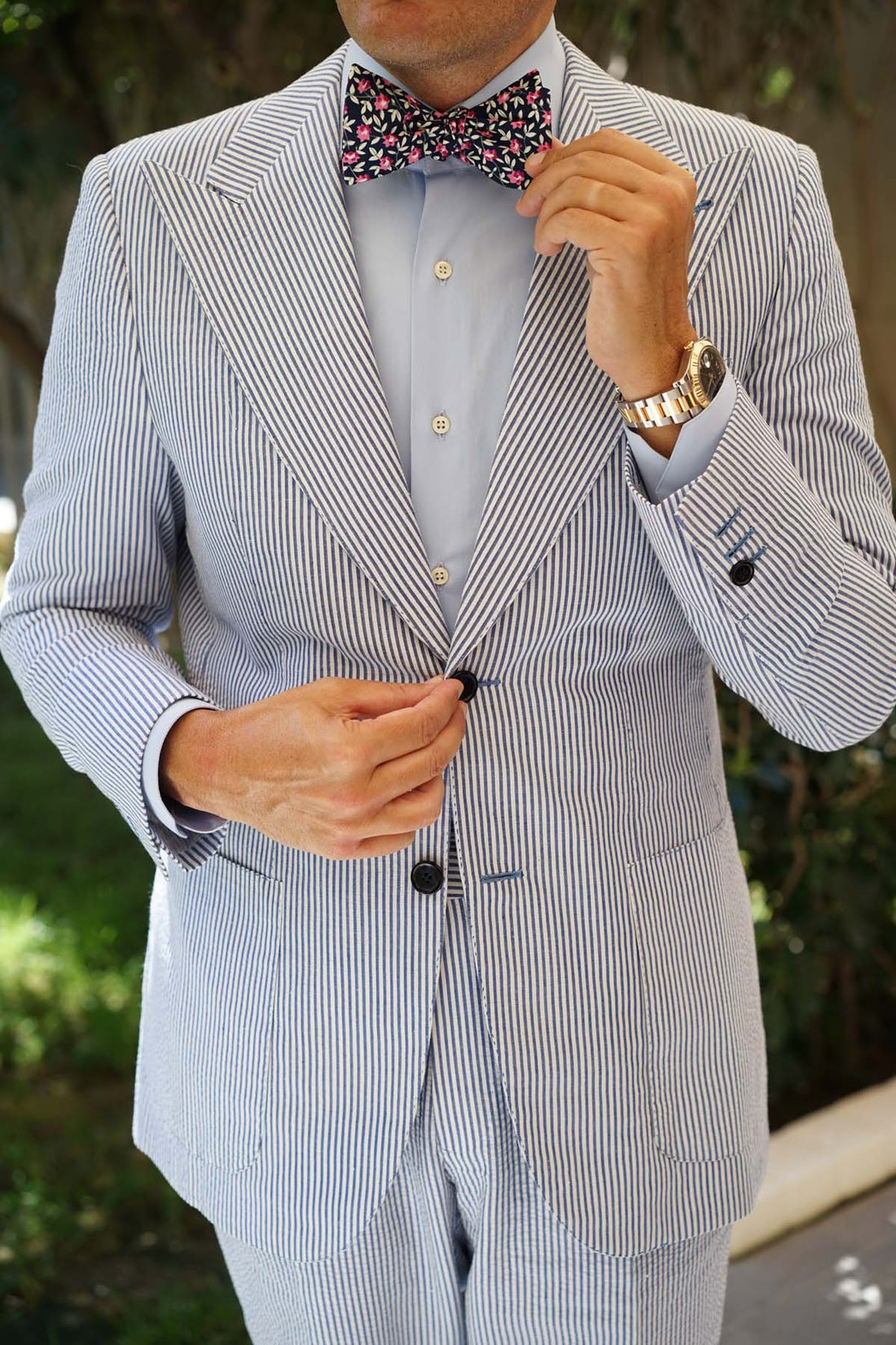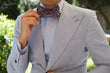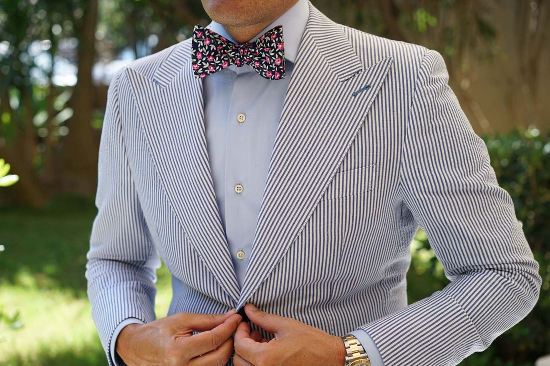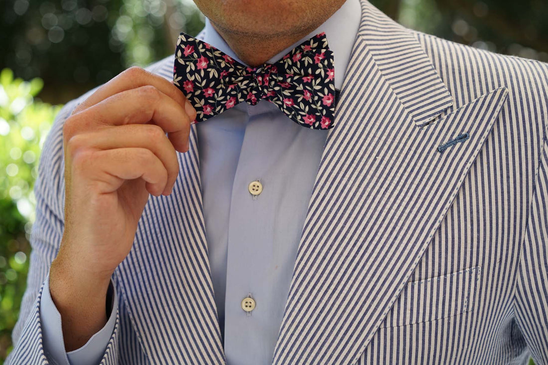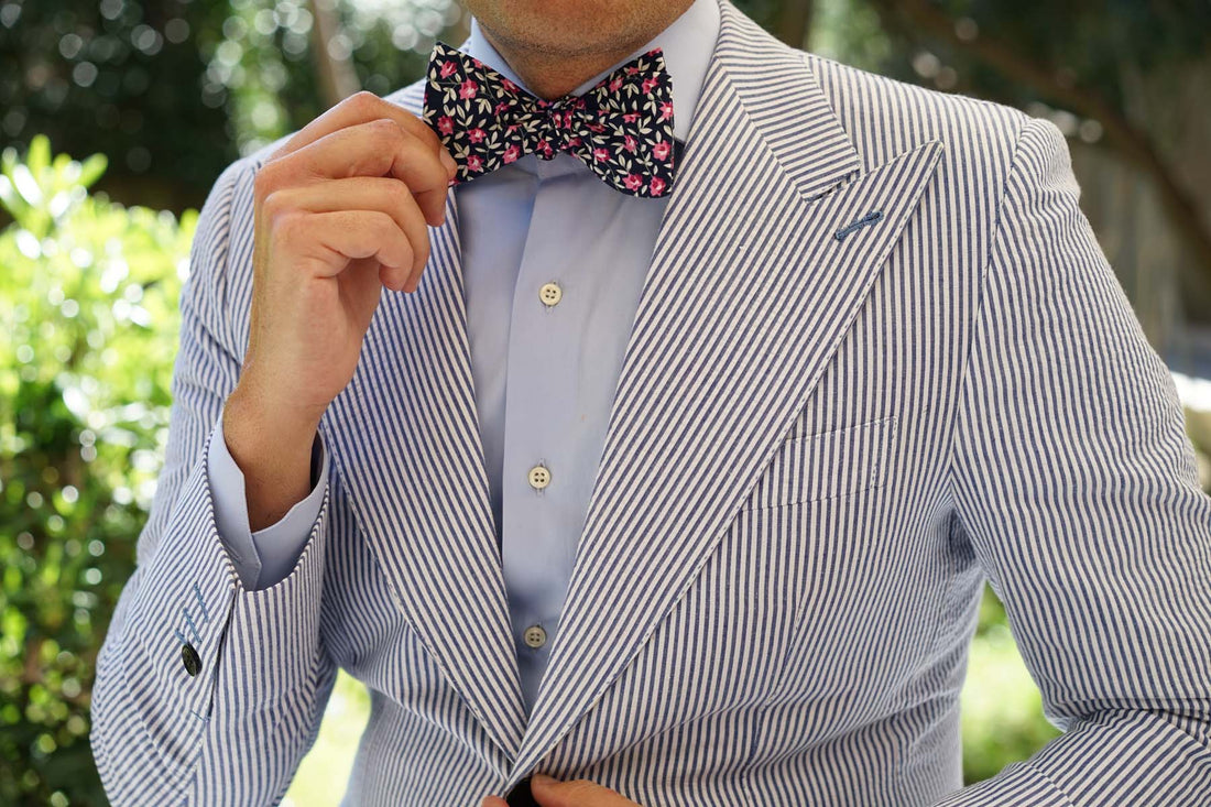 The elegant multi-toned features of this self tie bow tie are encased in a striking floral design. The navy blue base is superbly complemented by pink and green accents for a sophisticated outlook. Handcrafted from cotton and tailored with excellence, this untied bow tie magnificently exemplifies OTAA’s dedication to superior quality. Designed exclusively by the Brothers at OTAA.