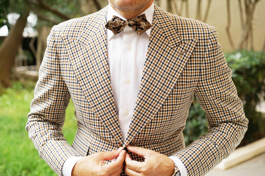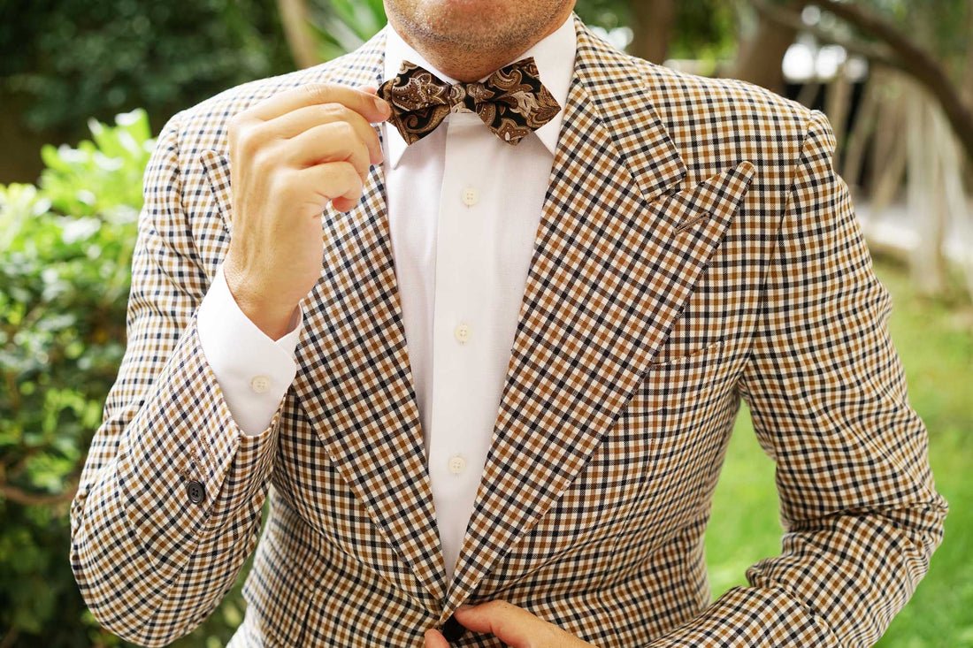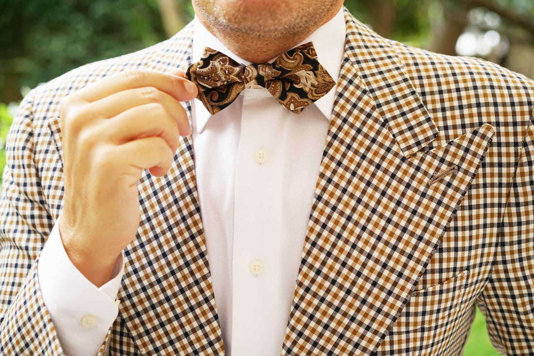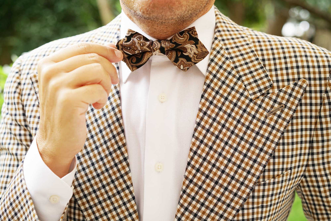 Paisley patterns have long held regal associations; they were reserved for noble regalia in Ancient Persia, and in Europe, they were high in-demand during the 17th century. Finessed with an intricate floral paisley design, this diamond bowtie features various tones of brown and beige atop an indulgent black background. Stitched by hand and tailored with elegance, the Filicudi Brown Paisley Diamond Pre-Tied Bowtie showcases the label's dedication to world class quality. Designed exclusively by the Brothers at OTAA.