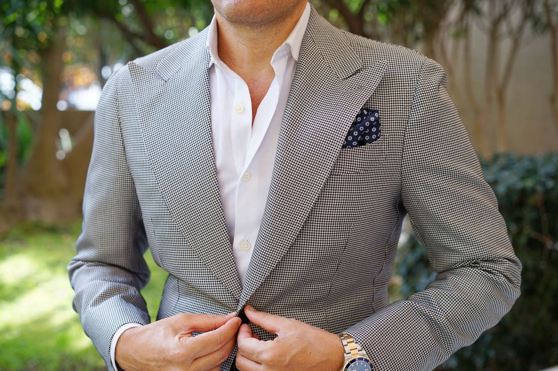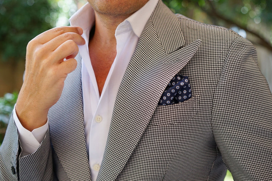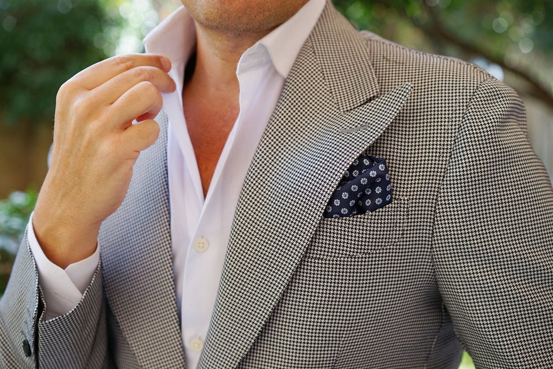 The glossy grey steel petals of the floral brocade are enhanced by the dark sheen of the smooth midnight blue satin backing, ensuring the finely woven thread is smooth to the touch as you run your fingers over the intricate motif. The Fiori Blue Floral Handkerchief will imbue your formal ensemble with floral sophistication and breathe new life into your outfit.
