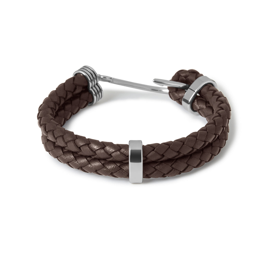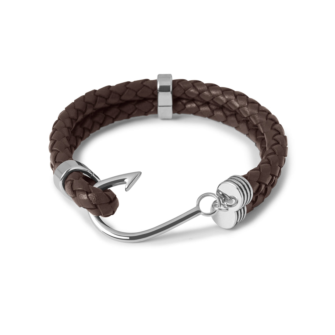 A classic feature for a considered ensemble, OTAA's Fish Hook Brown Bracelet is ebullient with a nautical feel. The exclusivity of a suit is determined in the attention to its fine details, and the impeccable leather features of this Fish Hook Brown Bracelet will ensure that your attire exudes excellence from the seams. Made from leather and accented with a hand-chiselled silver rhodium fish hook, this bracelet is unparalleled in design and quality. The folded double band is clasped together by the fish hook and offers textural intricacy through its weaved design. The brown complexion incites a warm-toned palette that's richly contrasted by the gloss silver features. Designed exclusively by The Brothers at OTAA.