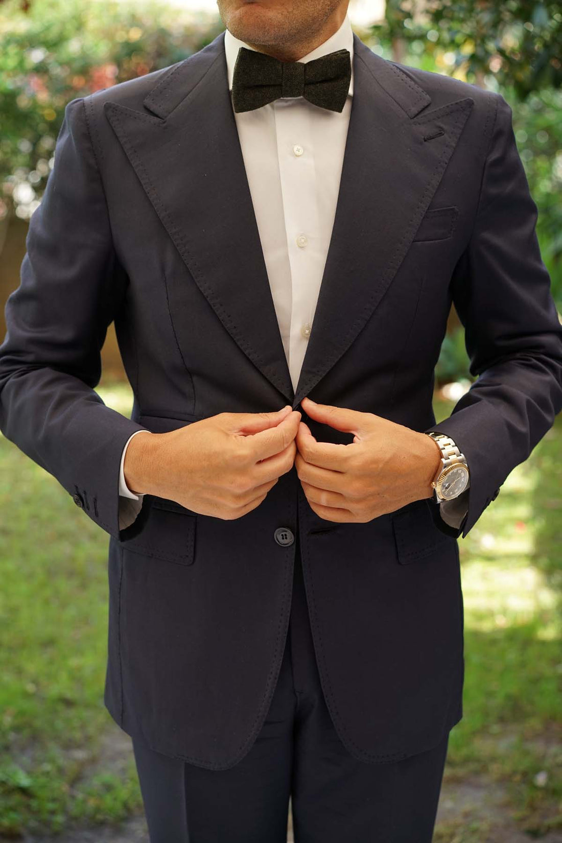 Luxurious details are part of OTAA's rich history, and this Forest Romney Sharkskin Wool Bow Tie boasts plenty. Stitched by hand and tailored with elegance; the attention to detail in this pre-tied bowtie is unmistakable. The decadent dark green palette is met with hints of light green stitches to emanate a distinguished multi-toned complexion. The lightly tufted wool fabric is luxuriously soft and offers a thick fabric to have you covered for year’s cooler seasons. Designed exclusively by the Brothers at OTAA, this Forest Romney Sharksin Wool Bow Tie offers an accomplished tone to your weekly roster.