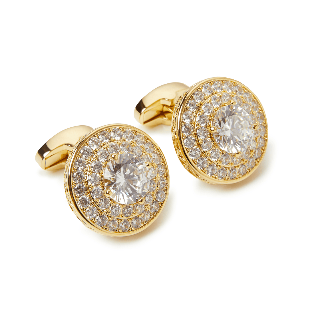 Introducing the Geneva Crystal Halo Cufflinks, a masterpiece of opulence and refinement. These dazzling cufflinks feature a central, brilliant-cut crystal surrounded by a halo of smaller, intricately set stones, all encased in a luxurious gold-plated frame. The circular design reflects light from every angle, adding a mesmerizing sparkle to your formal ensemble. Perfect for those who appreciate timeless elegance with a touch of glamour.