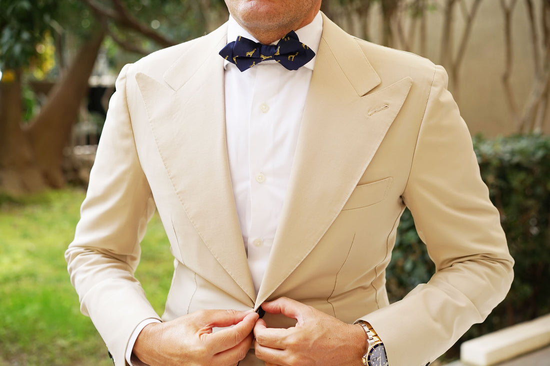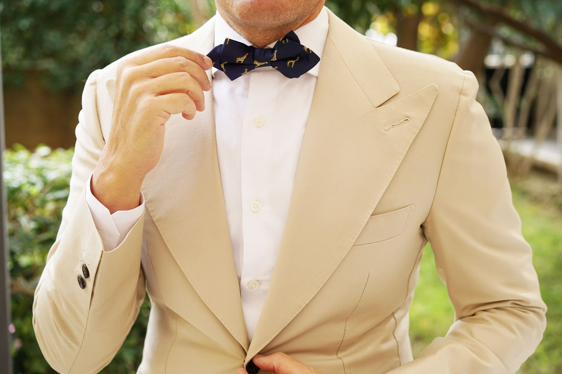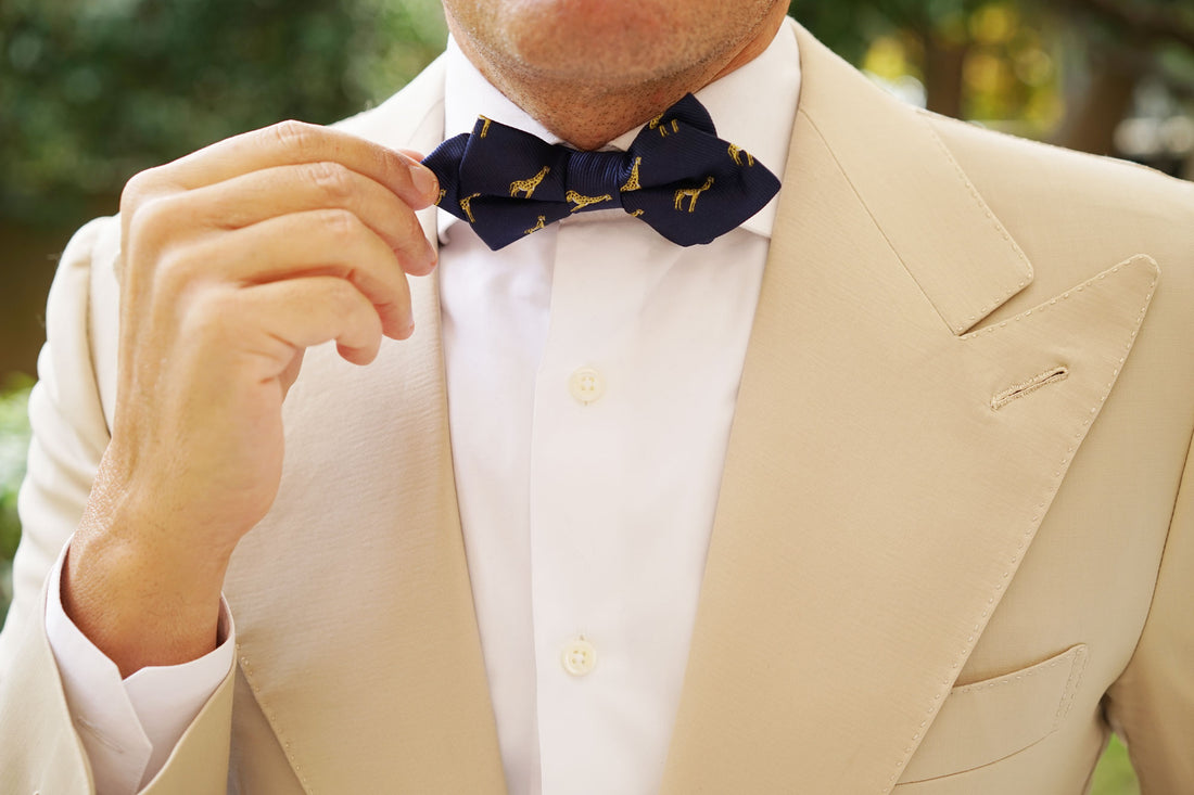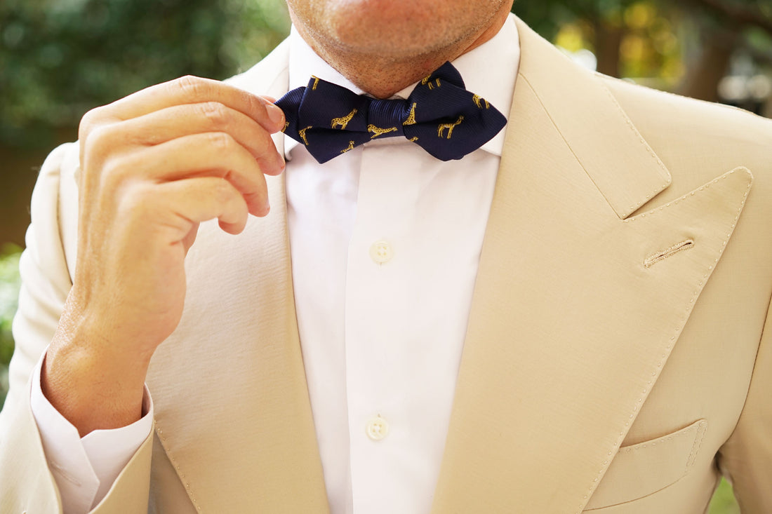 Our hand-sewn method allows the Giraffe Pre tied Diamond Bowtie to show extraordinary detail as there is little machinery used in the crafting of this tie. Touches such as these make all the difference. Besides, at least next time when we go on a Safari, we will have covered the whole jungle. Inspired by this lovable Giraffe that we saw in the flesh, our Giraffe Diamond Bow Tie exudes sophistication and is hand cut and sewn on a classic navy backing. Designed exclusively by The Brothers at OTAA.