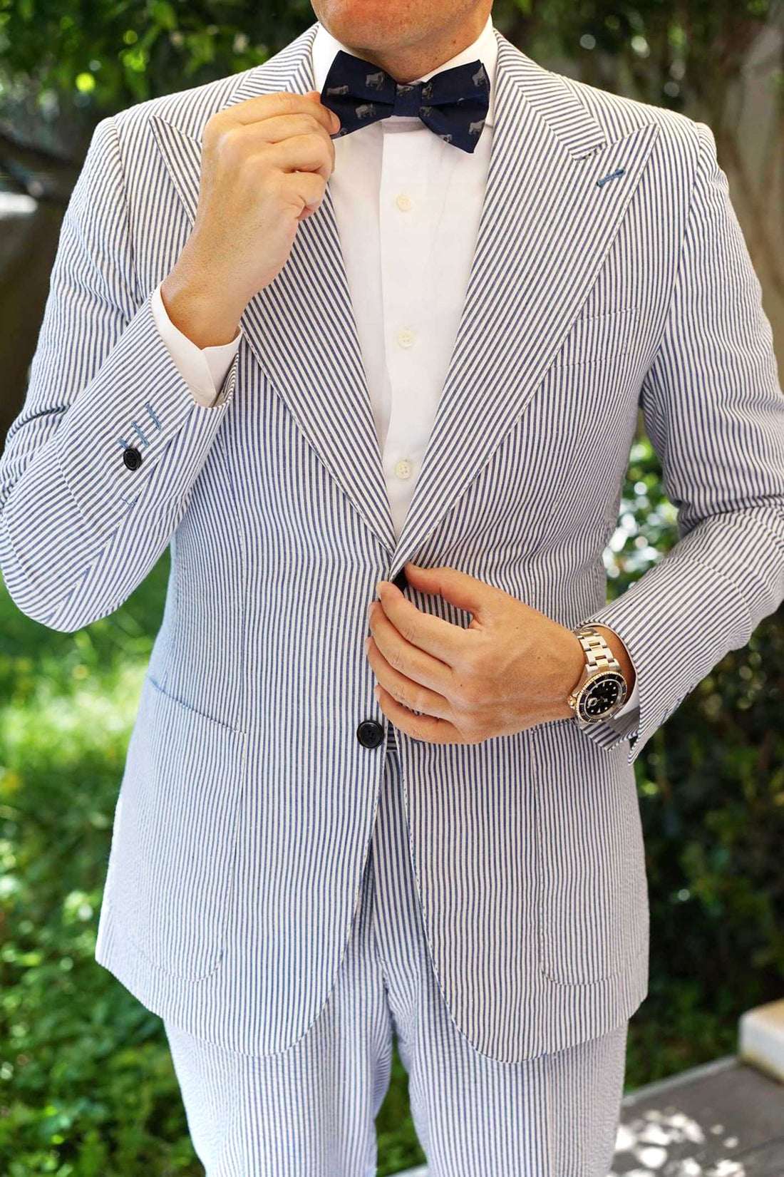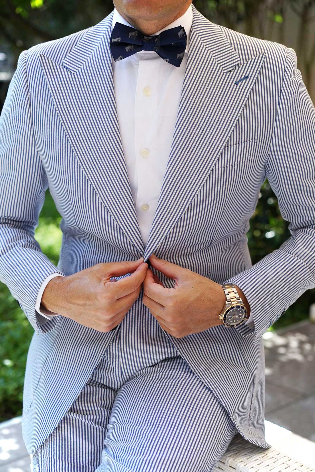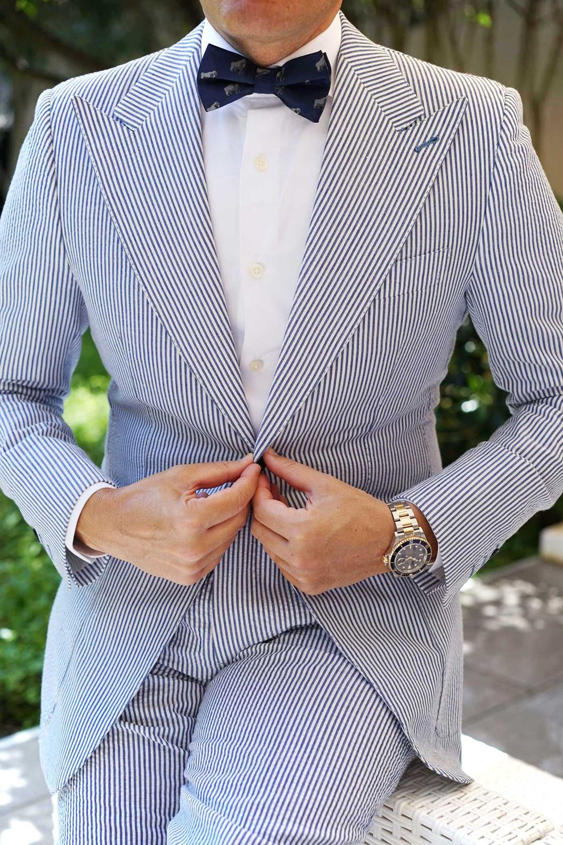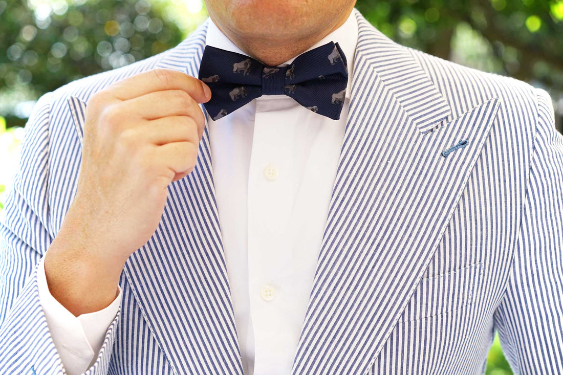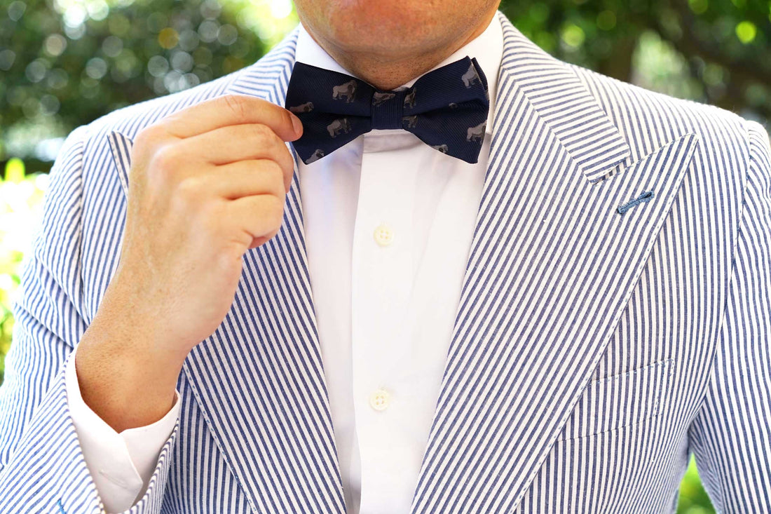 Our hand-sewn method allows the Gorilla Pre tied Bowtie to capture extraordinary detail as there is little machinery used in the crafting of this tie. Touches such as these make all the difference. Gorillas live in troops, which are made of one adult male, multiple adult females and their offspring. The male is the mediator who makes the decisions and resolves conflict. Inspired by the intelligent species, our Gorilla Bow Tie exudes sophistication and is hand cut and sewn on a classic navy backing. Designed exclusively by The Brothers at OTAA.