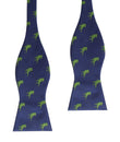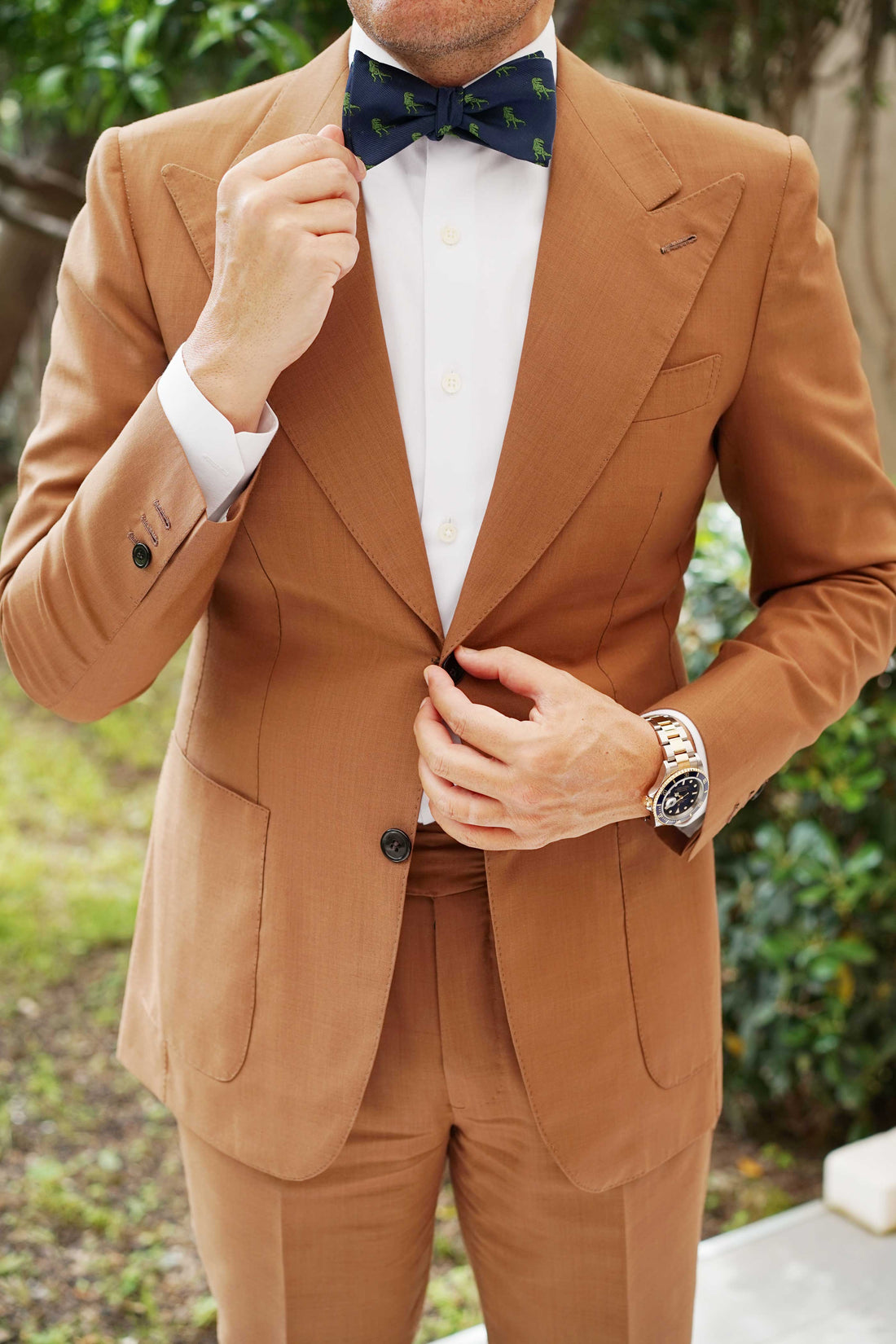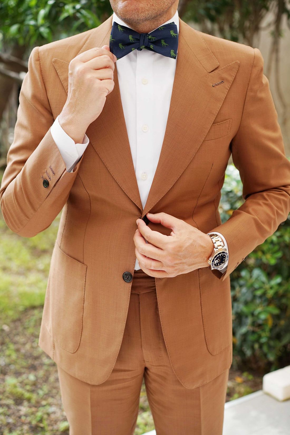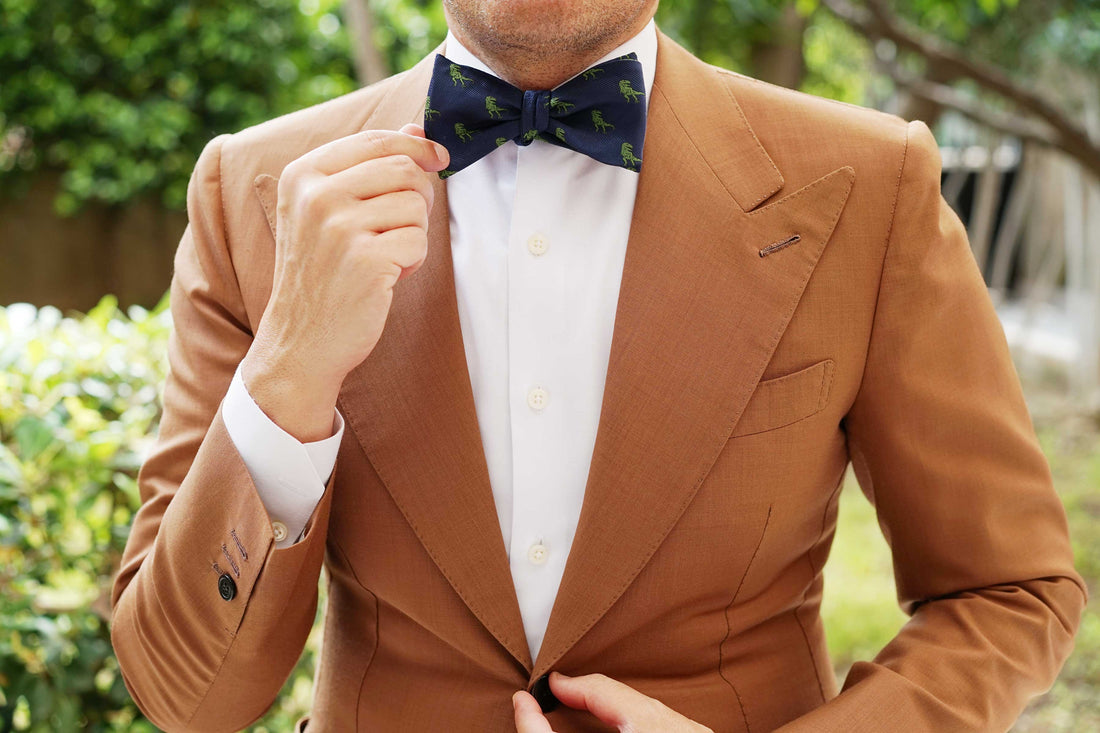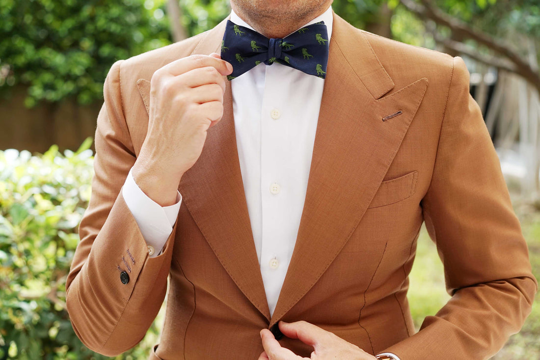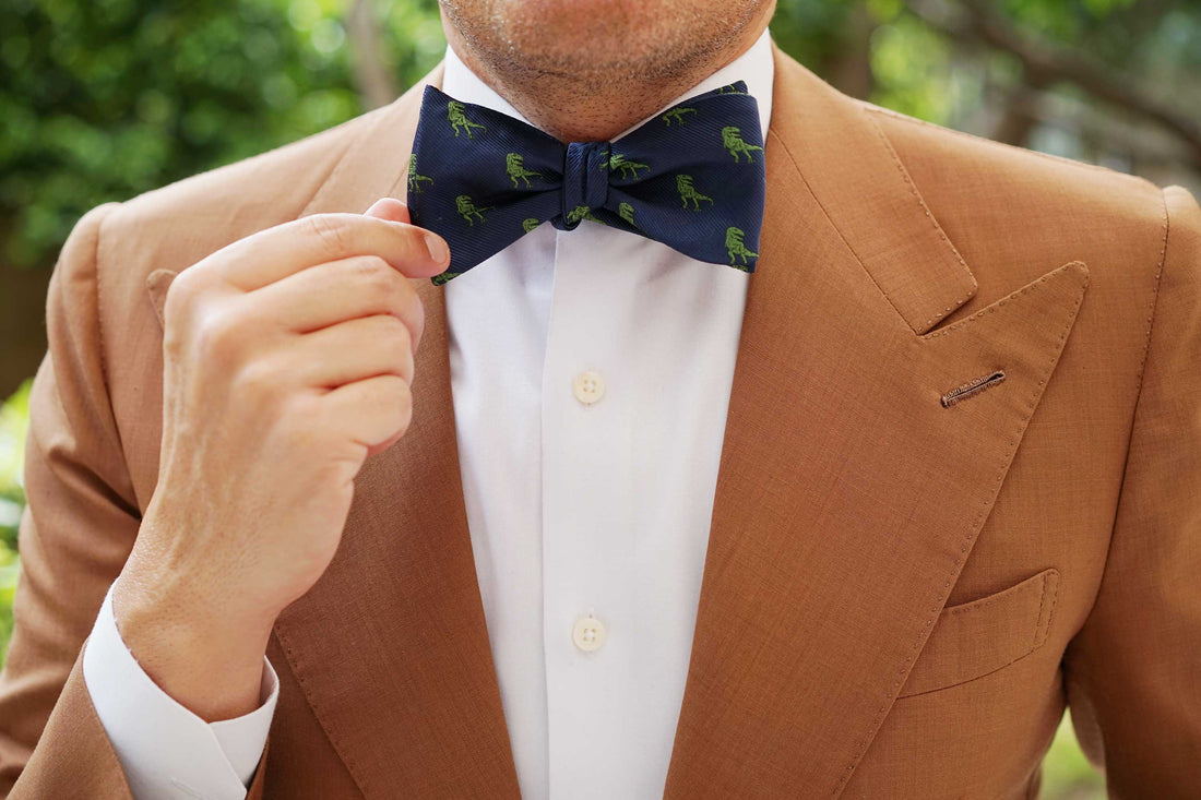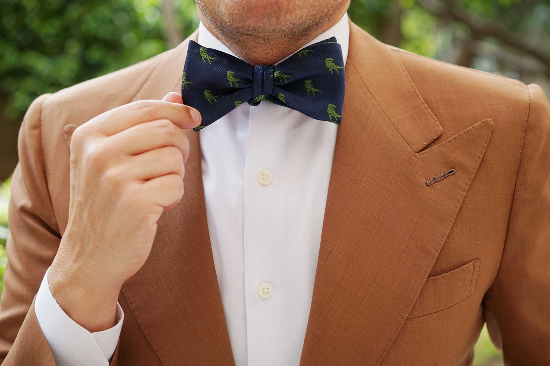Luxurious details are part of The Brothers at OTAA's rich history, and this Green T-Rex Dinosaur Self Bow Tie boasts plenty. There is strong debate about whether the Tyrannosaurus Rex was a predator or scavenger. It had small arms which would have made it hard to grip prey, suggesting it may have been a scavenger. On the other hand, evidence in favour of it being a predator includes its forward pointing eyes that would’ve allowed for greater depth perception to capture prey. Inspired by the T-Rex that could’ve either been a hunter or hunted, this Green T-Rex Dinosaur Self Tie Bowtie is trimmed with a navy blue satin backing and finished with a dark green T-Rex pattern.