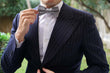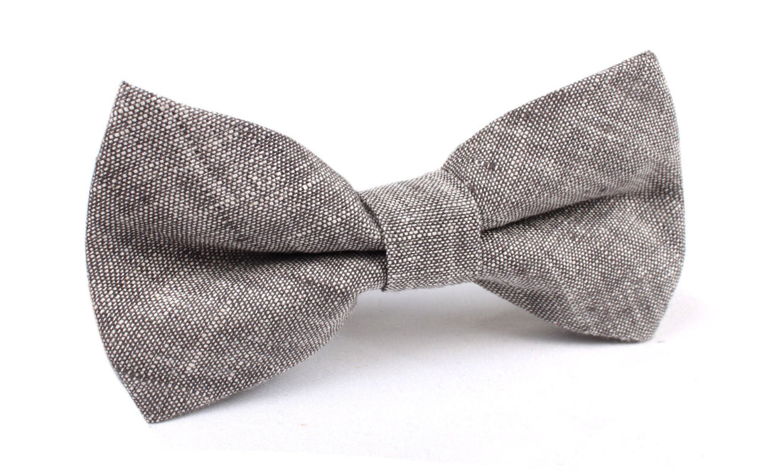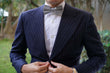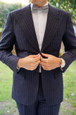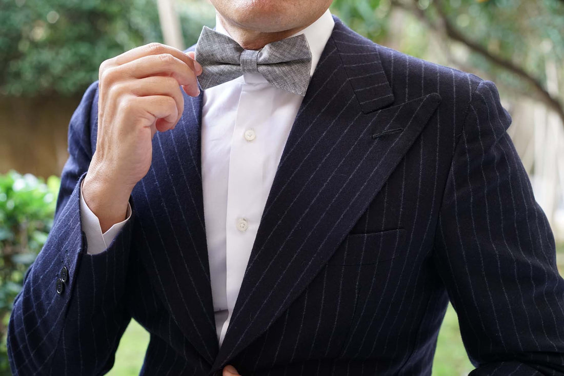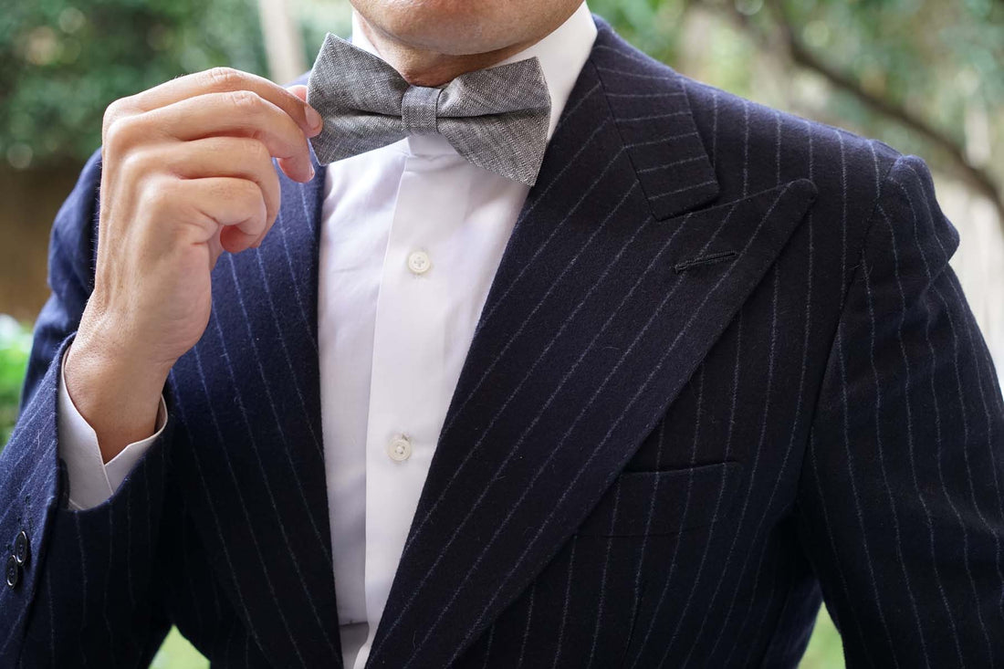 Take a break from solid-coloured pre-tied bow ties with OTAA's Linen Chambray Bow Tie. Woven by hand with contrasting light grey and broken stripes, it's visually interesting without being distracting.