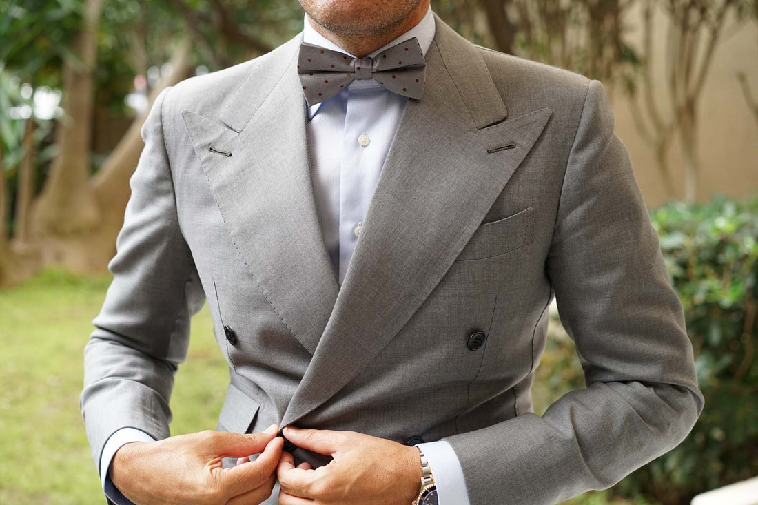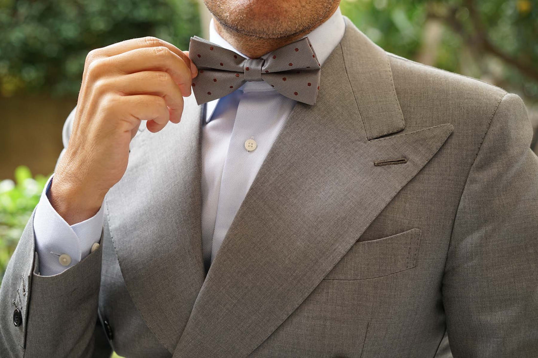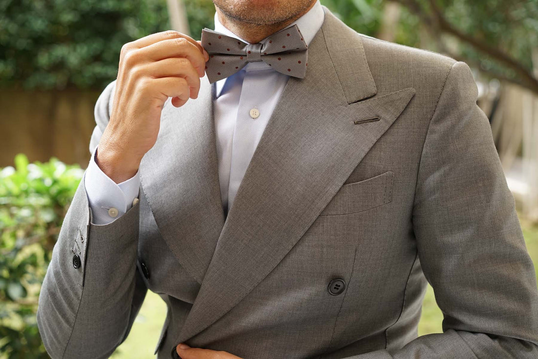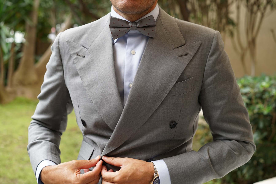 This OTAA Grey with Brown Polka Dots Bow Tie exudes sophistication, is cut for a classic slim fit and finished with a classic brown polka dot pattern. Keep it formal with a shirt, OTAA socks and suave shoes.