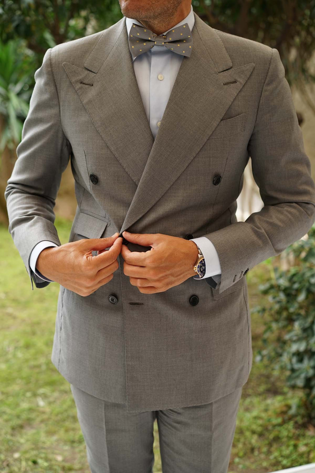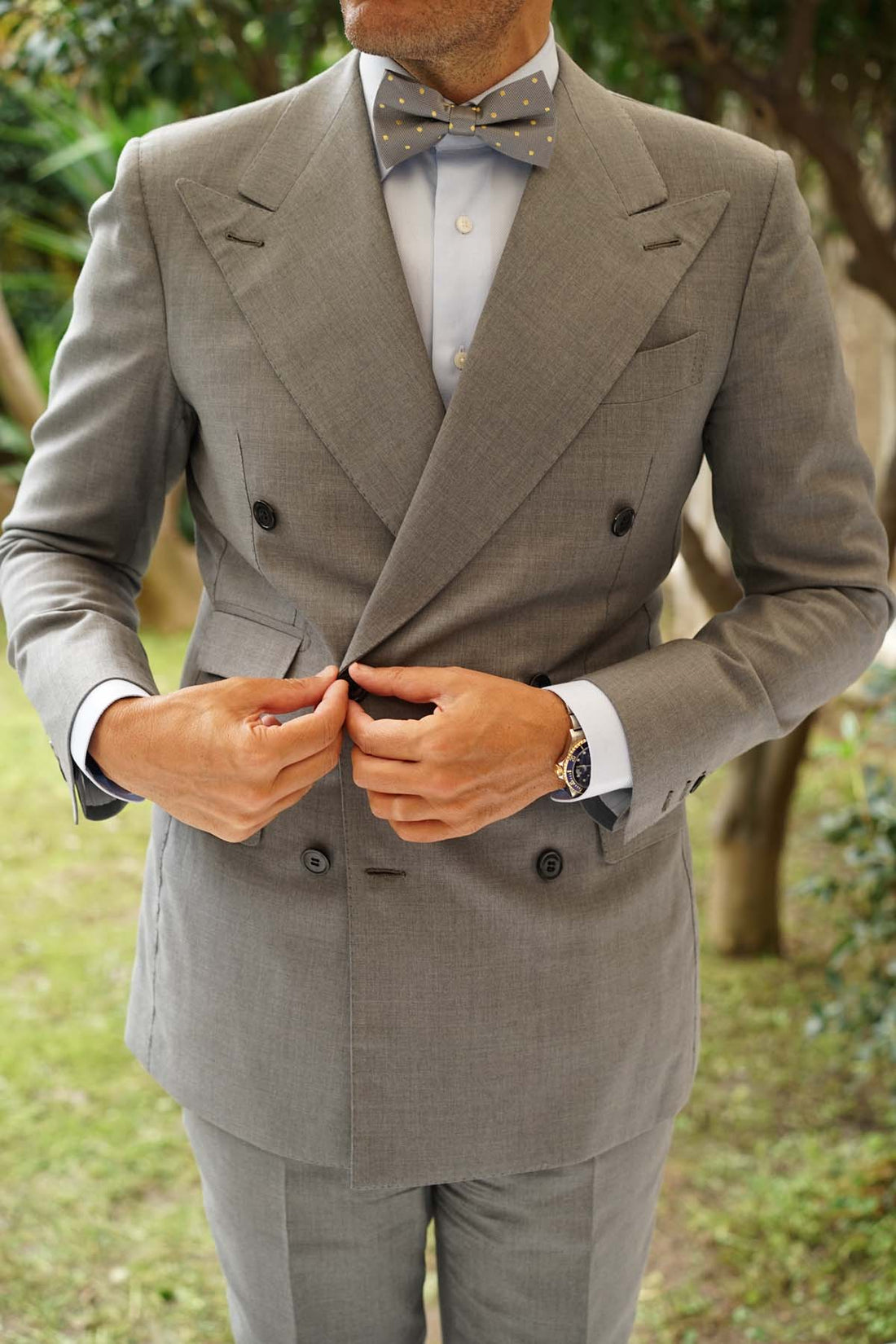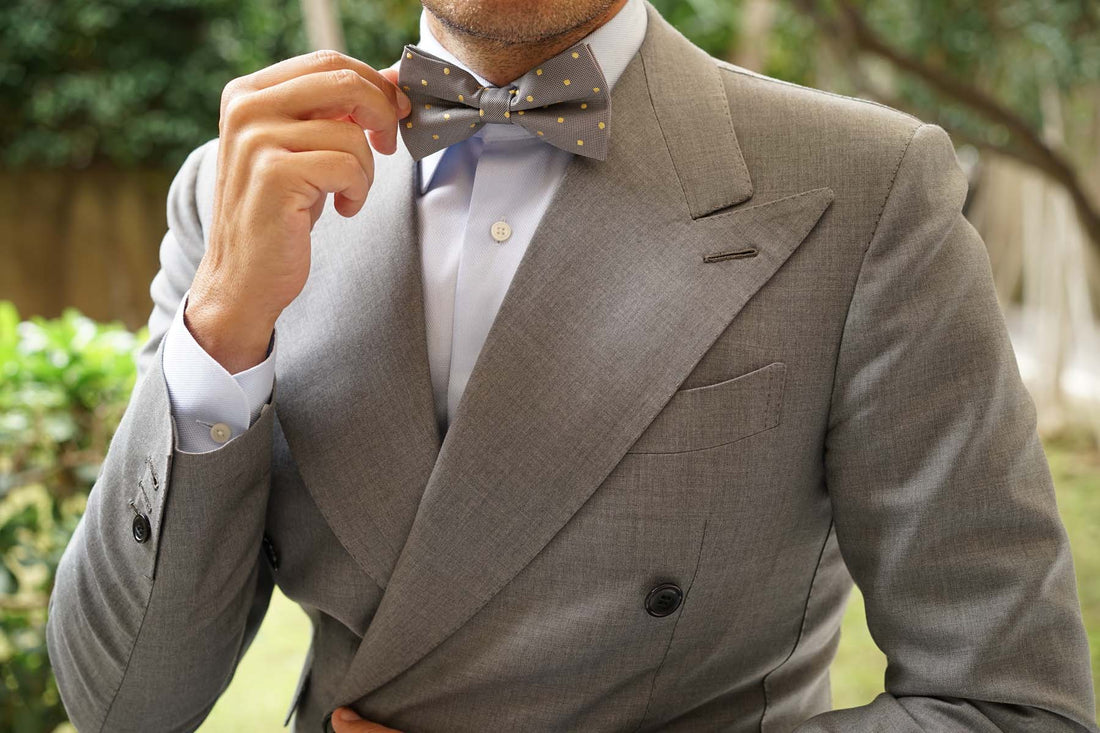 This unsuspecting Grey with Yellow Polka Dots Pre-tied bowtie will give your wardrobe the lift that you've been seeking. This Bow Tie features a playfully scattered array of yellow dots on a grey background. The lightweight material makes it a great option for every day of the year.