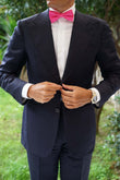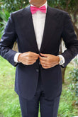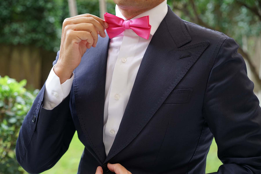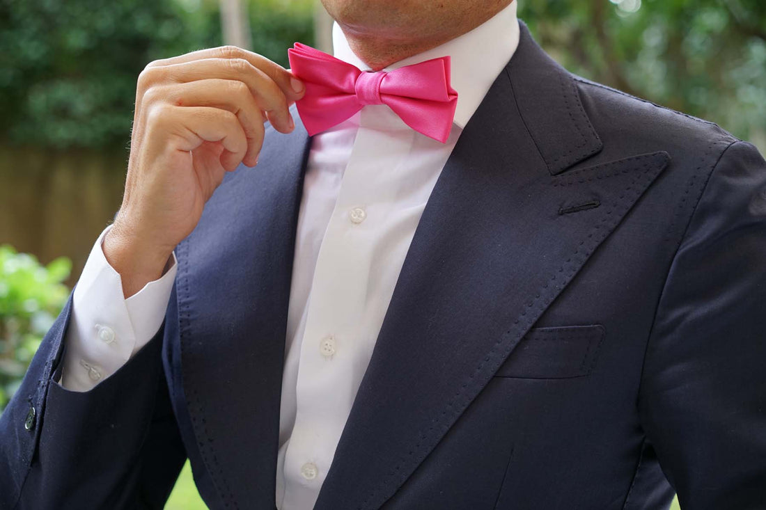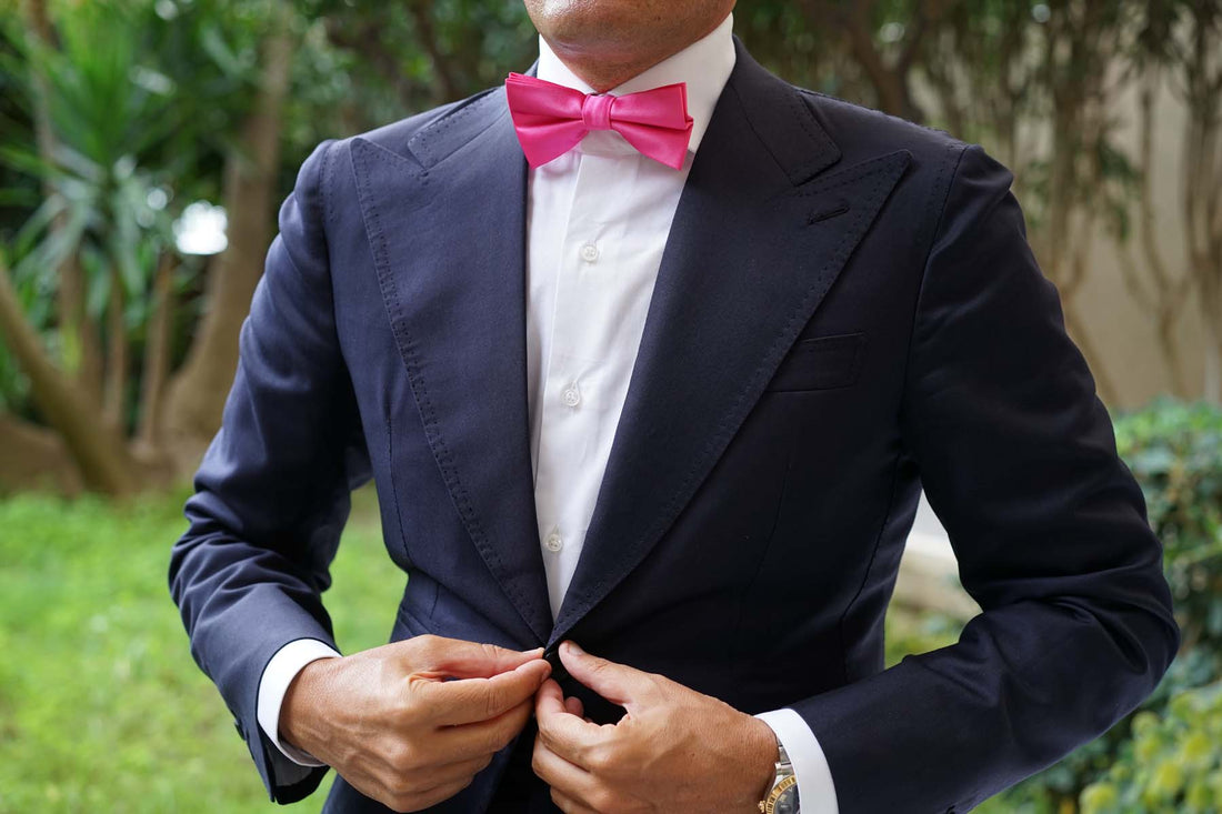 The Hot Pink Bow Tie for men is a thin pre-tied bow tie which would be best complemented with a pink pocket square worn on a patterned shirt. We also recommend our signature Paisley Pink Pocket Square with this Bow Tie.