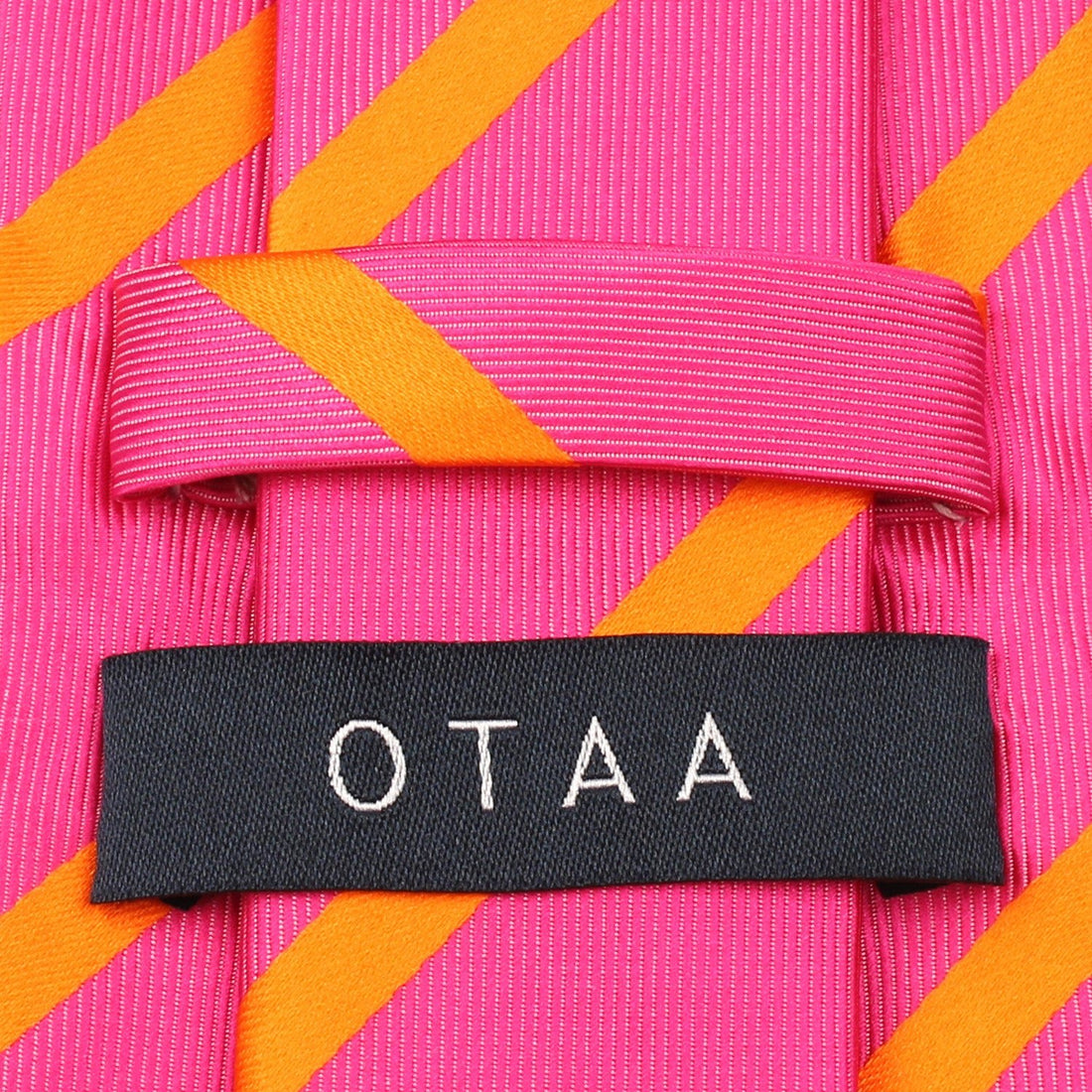True to OTAA's classic flamboyant aesthetic, the multi-coloured stripe of this Hot Pink with Orange Diagonal Necktie exudes a preppy polish. Vibrant pops of pink and yellow are the perfect way to bring a cheerful tone to laid-back looks. Don't worry about it feeling too bold - dress it down with a slim fit button-down collared shirt for added elegance.