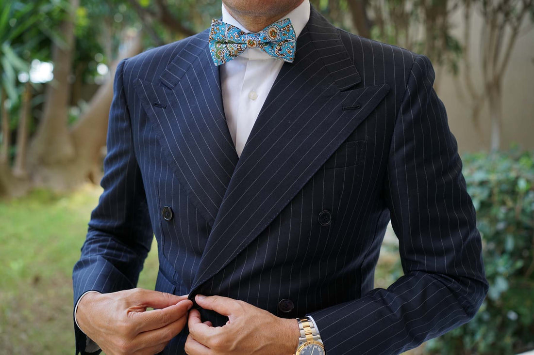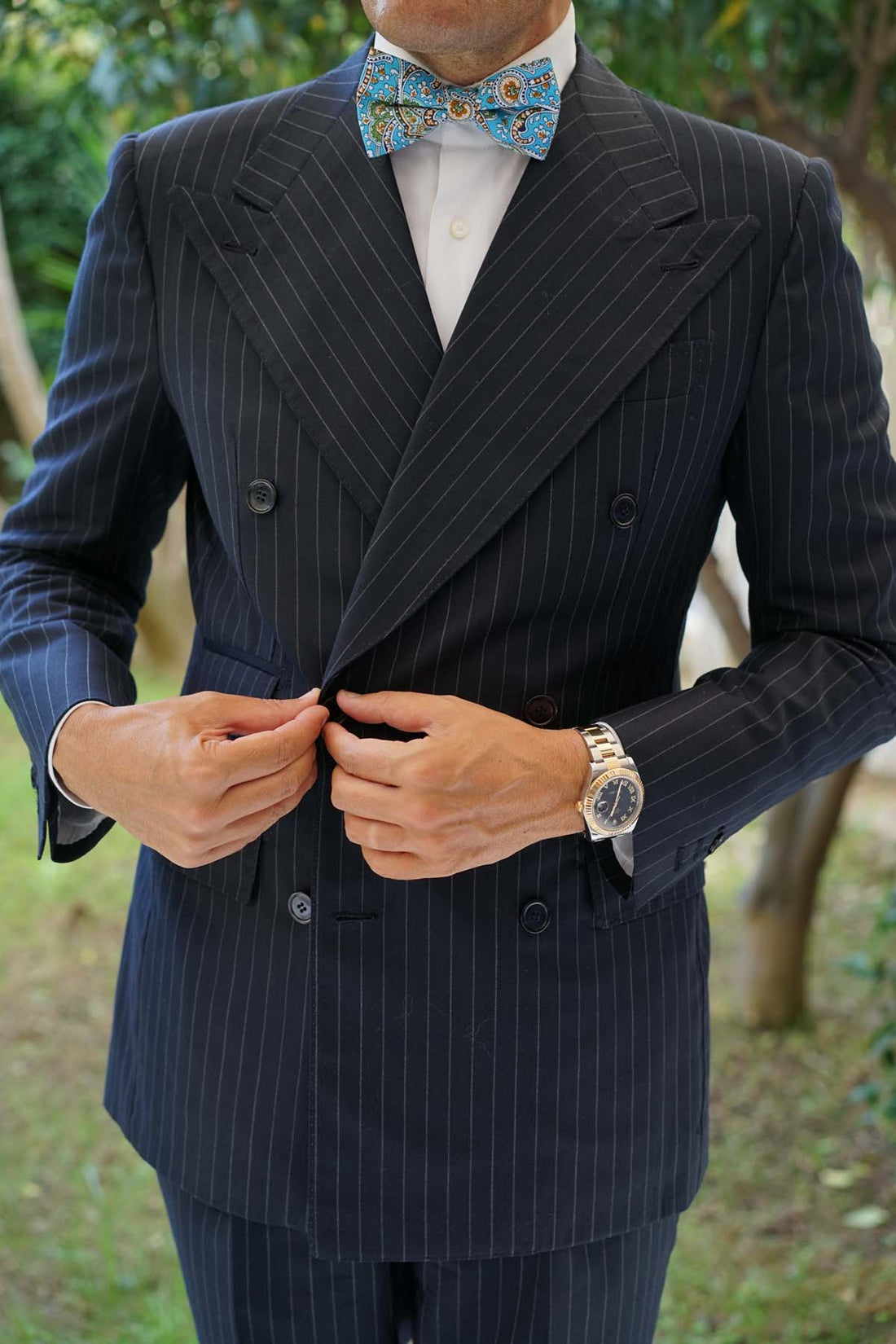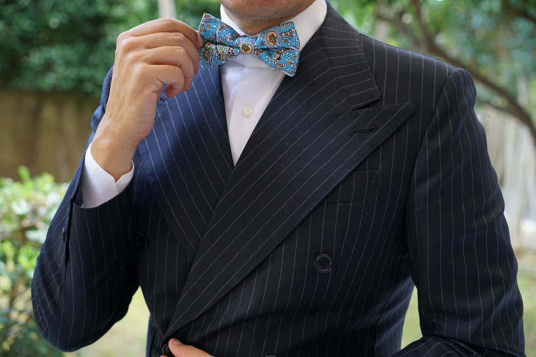 Paisley patterns have long held regal associations; they were reserved for noble regalia in Ancient Persia. Patterned with an intricate floral paisley design, this impeccable Isola Comacina Blue Paisley Bow Tie will accent your suits with finesse. Hand-stitched and constructed with elegance, this pre-tied bowtie is smooth to the touch and makes a high-quality statement. The vivacious light blue palette is met with green, orange, white and dark blue features for an artistic outlook.