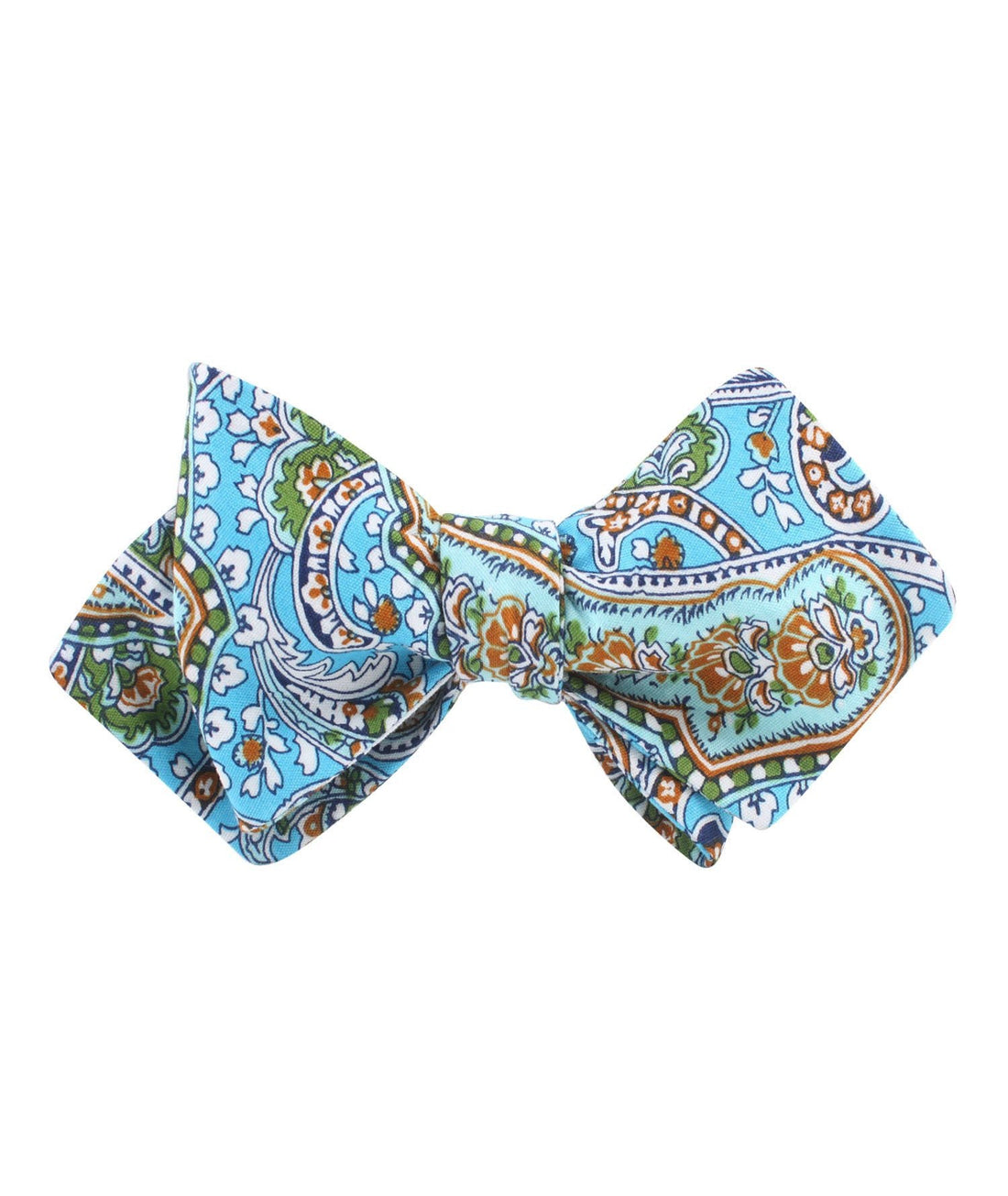 Paisley patterns have long held regal associations; they were reserved for noble regalia in Ancient Persia. Patterned with an intricate floral paisley design, this impeccable Isola Comacina Blue Paisley Diamond Self-Tie Bow Tie will accent your suits with finesse. Hand-stitched and constructed with elegance, this diamond untied bowtie is smooth to the touch and makes a high-quality statement. The vivacious light blue palette is met with green, orange, white and dark blue features for an artistic outlook.