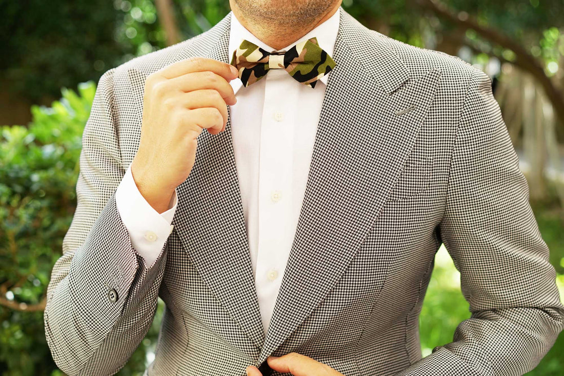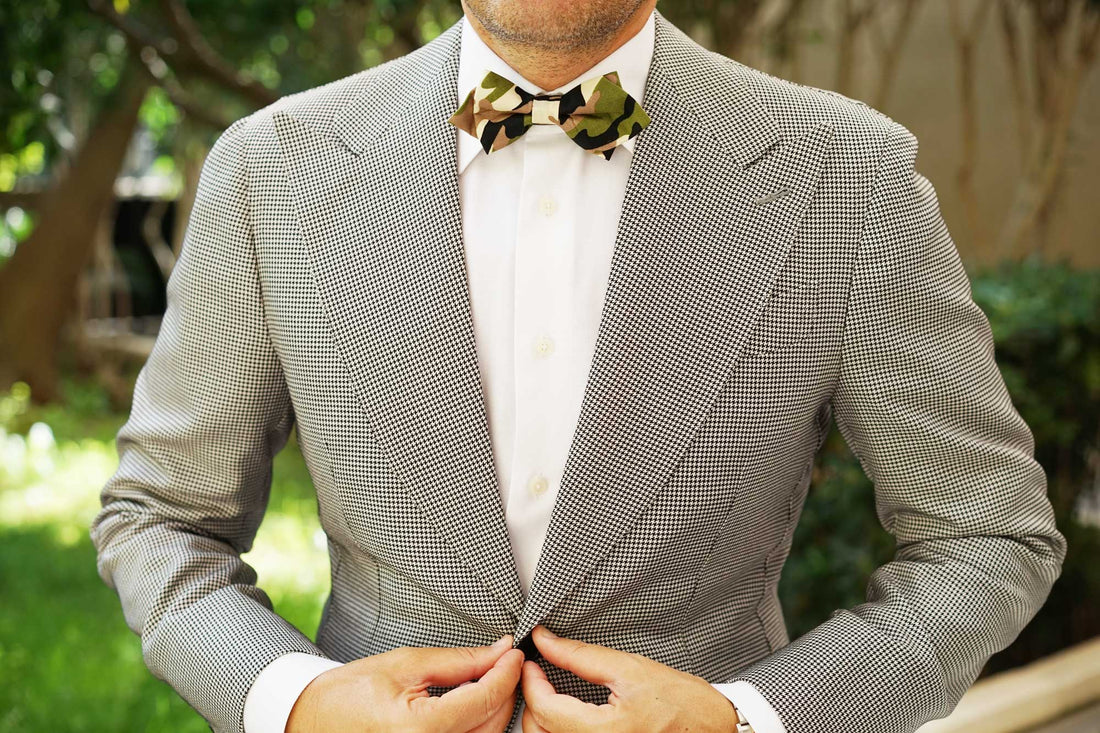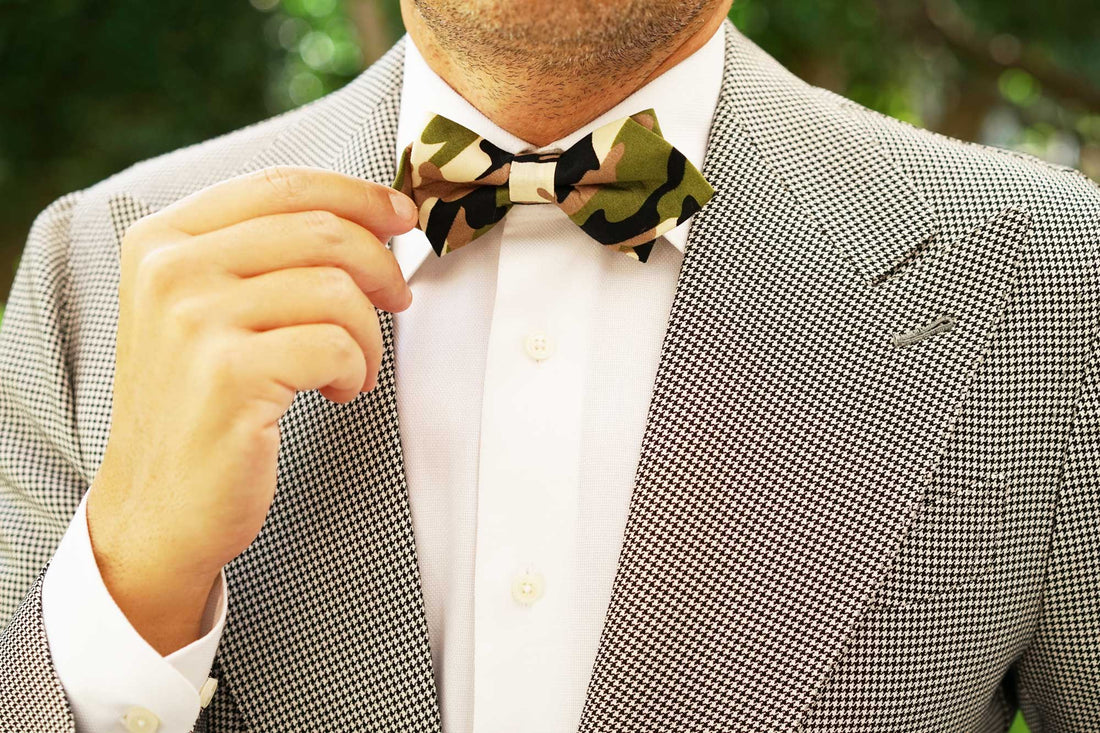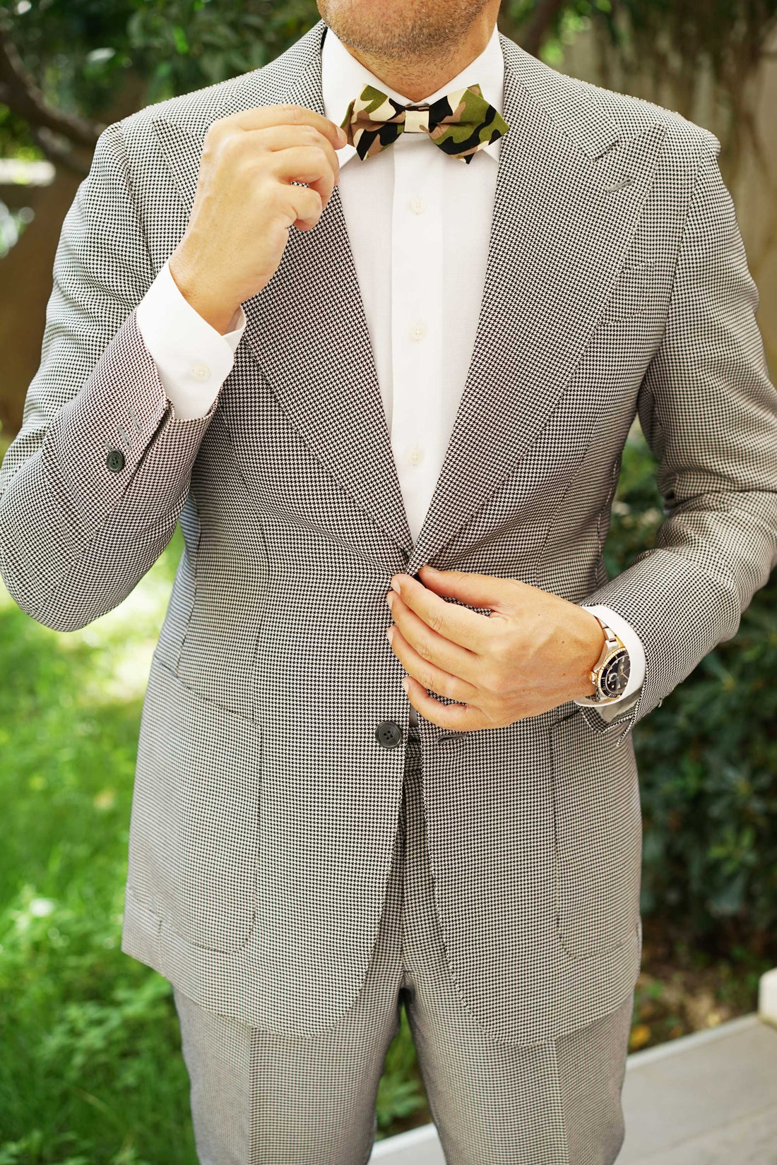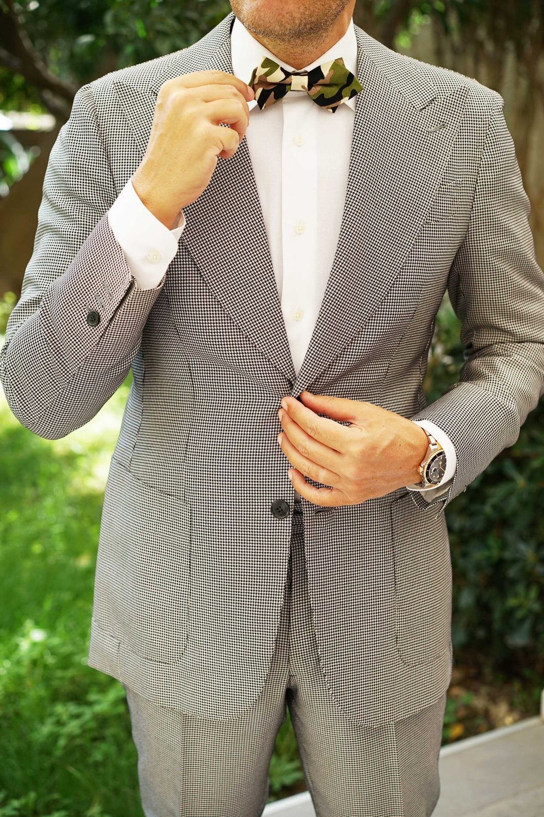 This Jungle Green Camo Diamond Bowtie offers unmistakable quality through its hand-stitched design and superbly tailored body. Adorned with green, black, cream and brown hues, this Jungle Green Camo Diamond Pre-Tied Bowtie offers a striking addition to your everyday assemblage. Wear it for a sophisticated presence in the boardroom, or to channel Tarzan in the wilderness. Designed exclusively by the Brothers at OTAA.