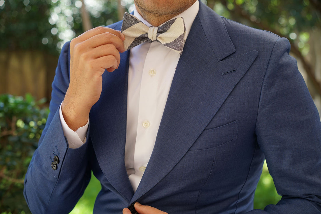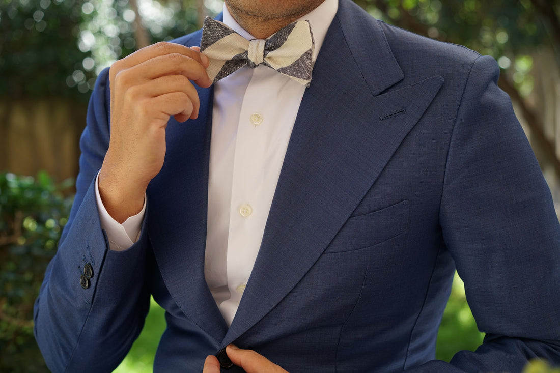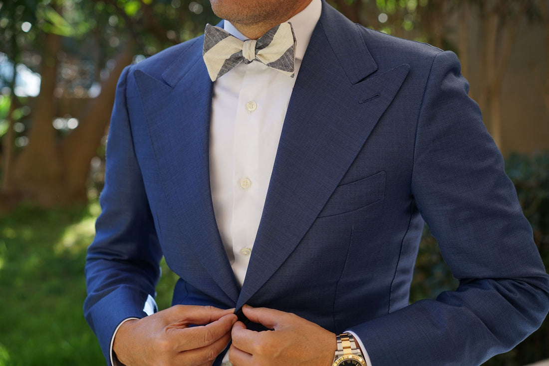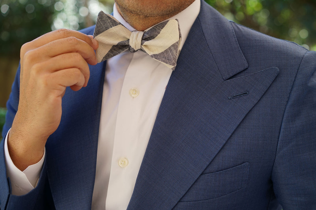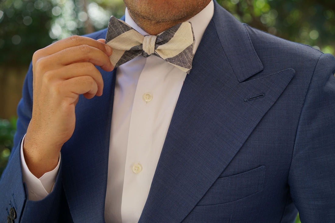 This Kekova Blue Striped Linen Self Tie Bow Tie provides a breathable fabric that’s lightly textured to the touch. Adorned with a subtly faded palette, this linen untied bow tie brings a laid-back outlook to your everyday ensembles. The striking diagonal pattern is paired with ebullient white and blue hues to make it a stand-out option for flamboyant style. Sewn by hand and tailored with elegance, this Kekova Blue Striped Linen Self Tie Bow Tie marries quality with sophistication. Designed exclusively by the Brothers at OTAA.