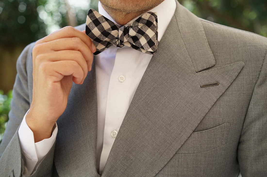 Khaki & Black Gingham Linen Fabric Self Bowtie