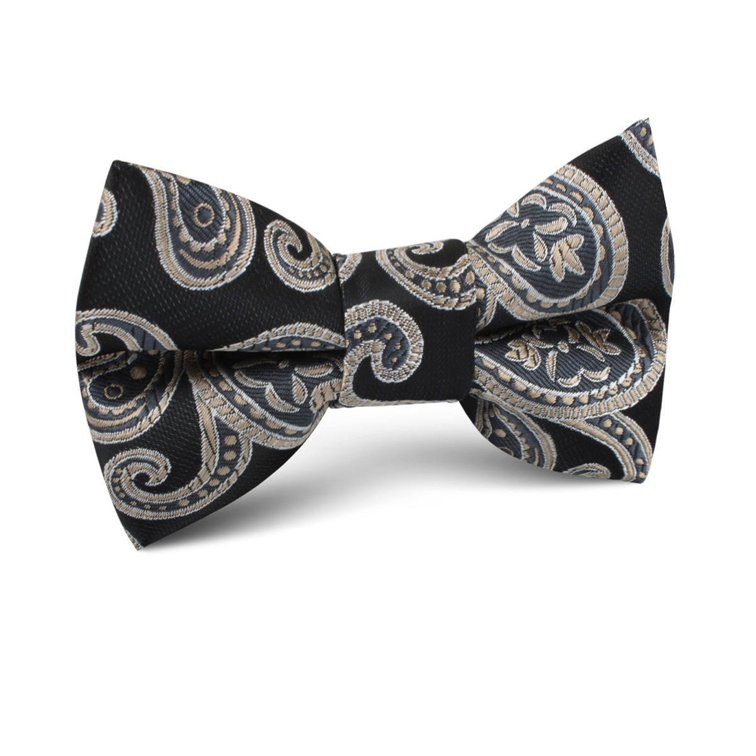 Inspect the well-defined weave of the white, beige, and midnight blue paisley ensemble, see for yourself the decorative craftsmanship of this hand-made Kids Bow Tie, set against a rippling satin background of shimmering black. The King of Persia Black Paisley Children's Bow Tie can be yours if you dare claim it.