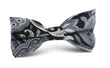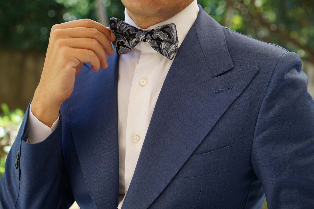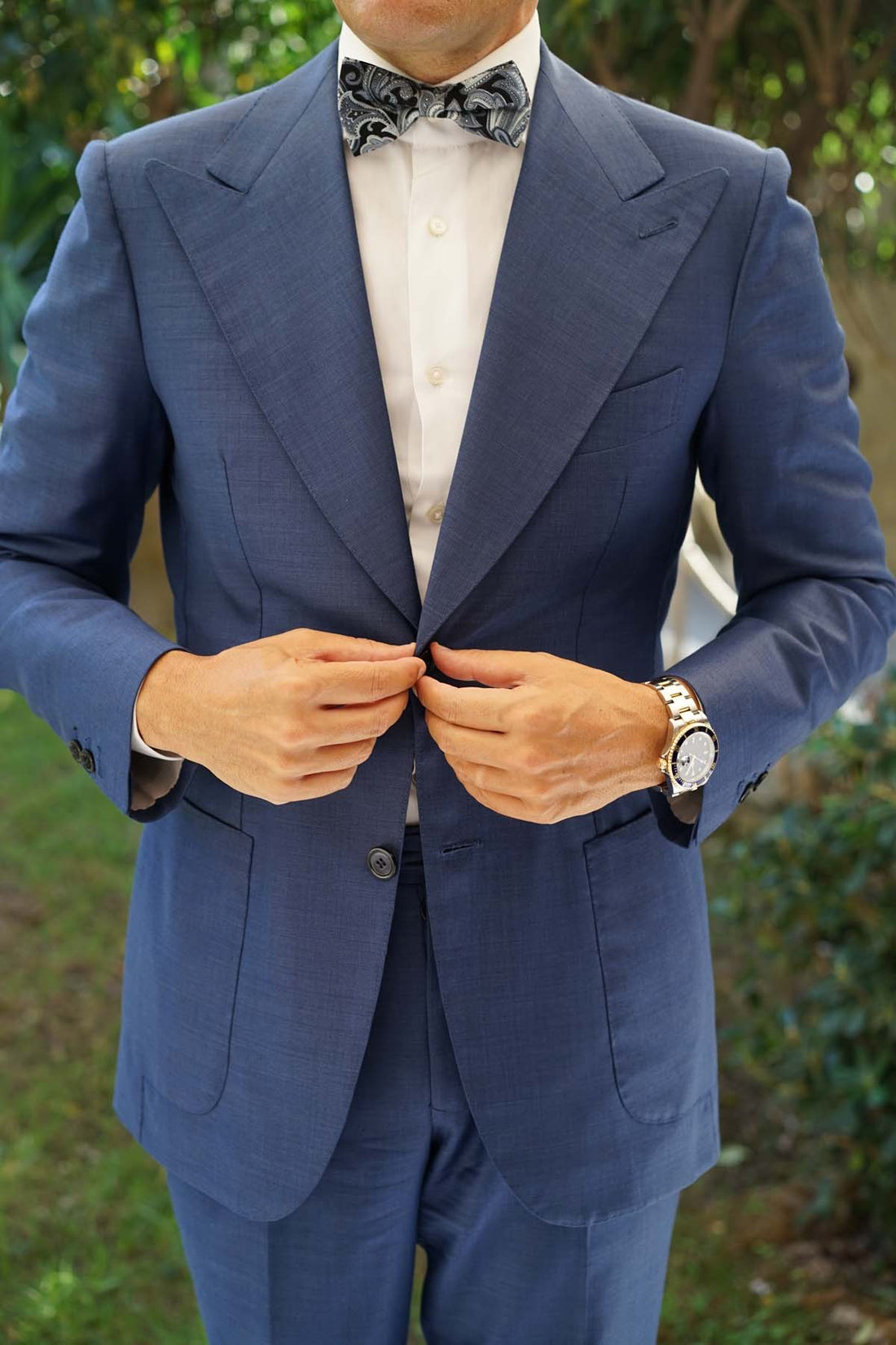 Paisley patterns have long held regal associations; they were reserved for noble regalia in Ancient Persia. Adorned with an indulgent black palette, this pre-tied bowtie features an intricate grey-toned floral paisley design with muted blue highlights. OTAA’s hand-stitched approach to tailoring means this bow tie is smooth to the touch and makes a high-quality statement. Designed exclusively by the Brothers at OTAA.