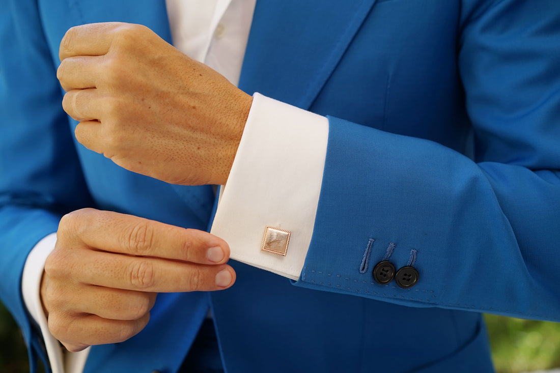 Visionary design and cutting edge execution are encased in the fruition of these OTAA Leonardo da Vinci Rose Gold Cufflinks. Born in 1452, da Vinci was an Italian renaissance polymath revered for his technological ingenuity. A master of many pursuits, he is regarded as the father of architecture, palaeontology, ichnology and one of the greatest painters of all time. Inspired by a man ahead of his time, the sharp hand-chiselled execution of these Leonardo da Vinci Rose Gold Cufflinks consolidate them too as ahead of their class. These cufflinks are flawlessly hand-chiselled from rhodium and coated in a luxurious gloss rose gold finish. Executed with immaculate precision, they boast an angular cut with intricate rope-line embellishments on the perimeter. The rose gold finish incites a warm palette that will add a blushing detail to your attire.