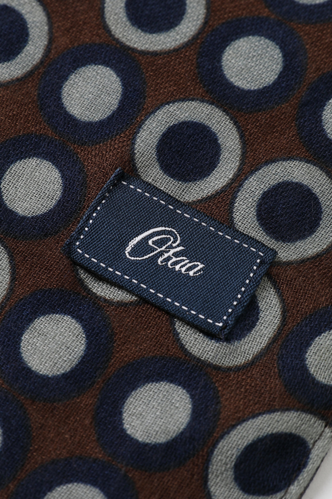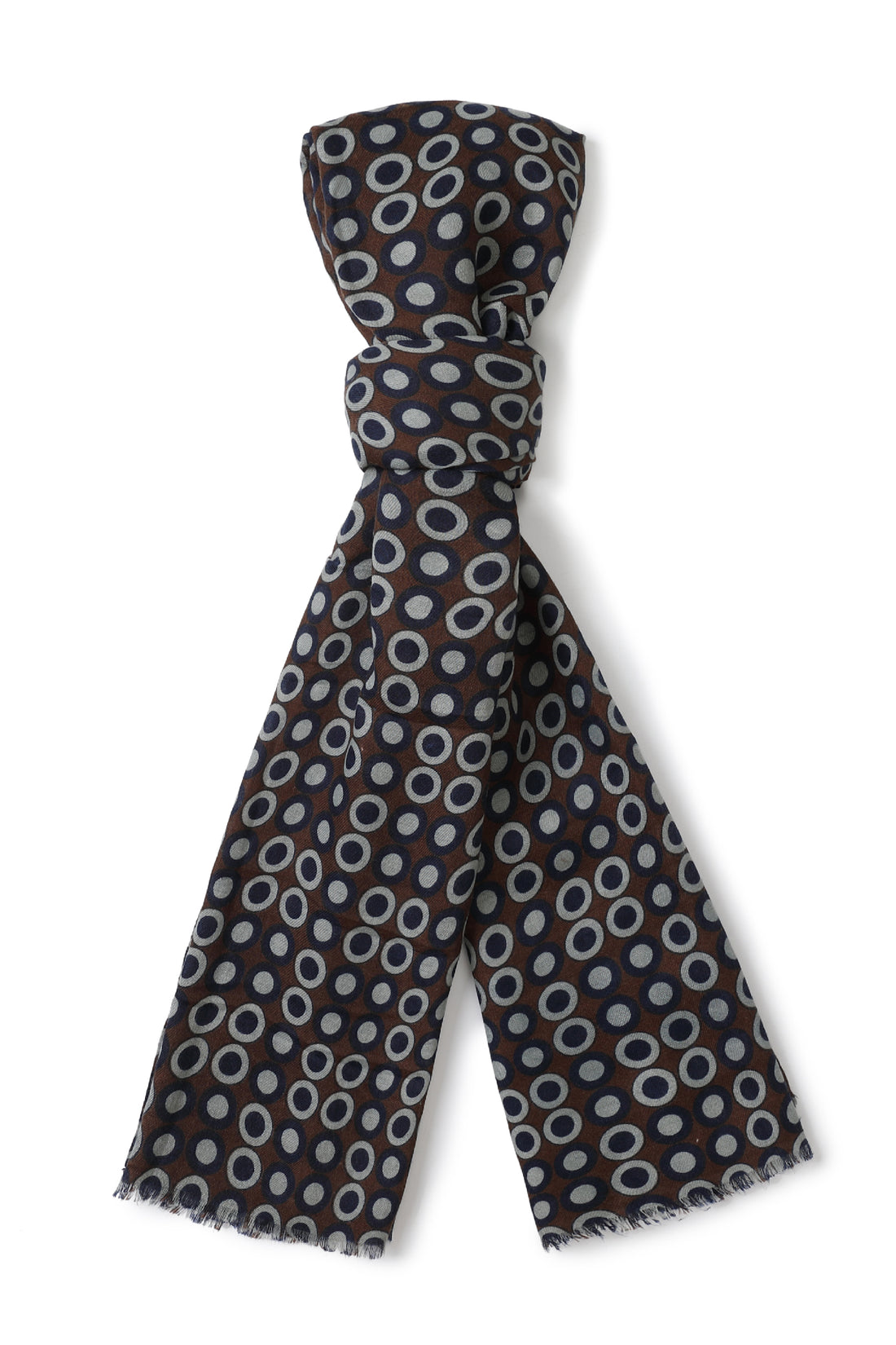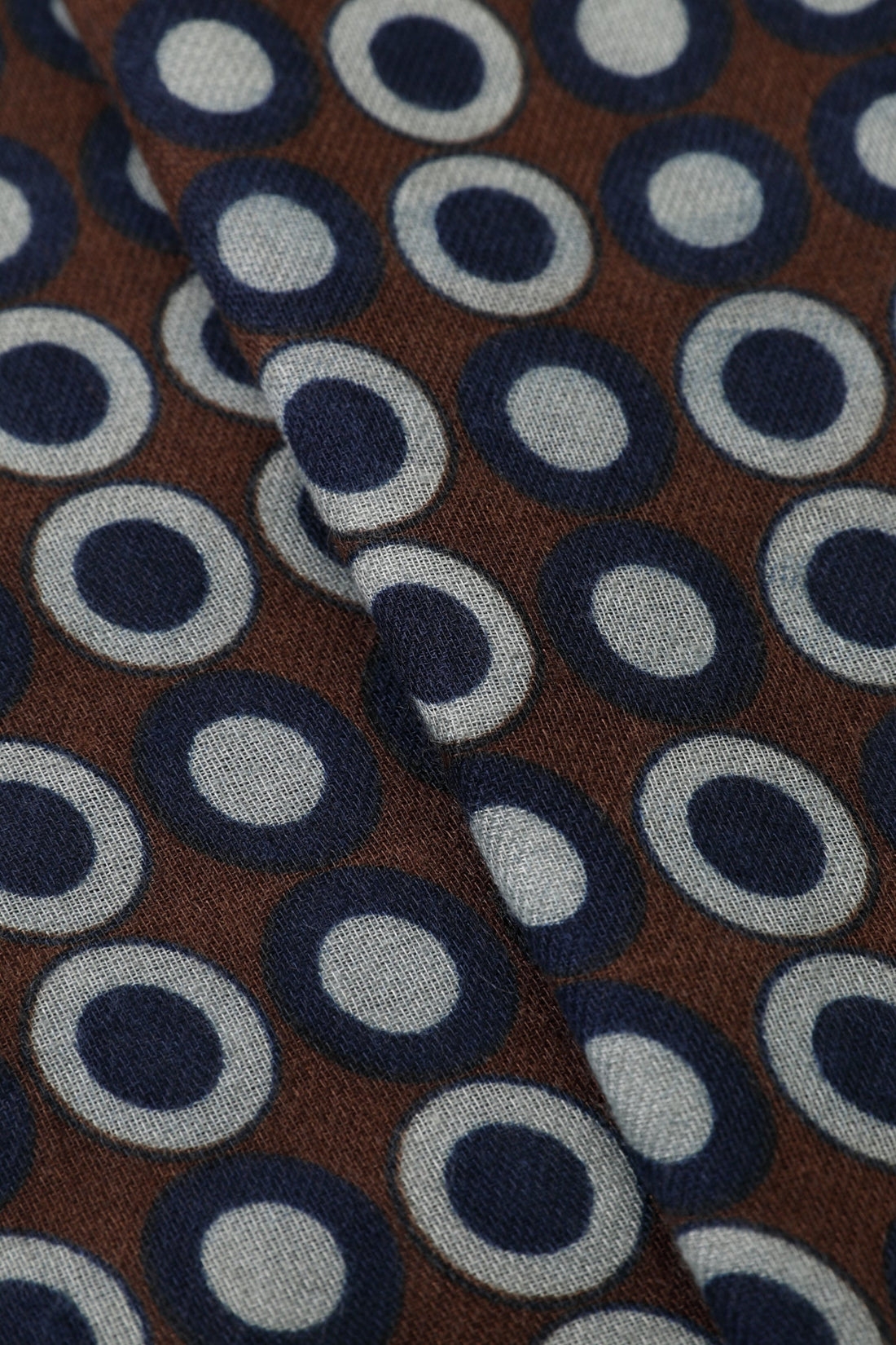 Introducing the Málaga Circlet Scarf, where timeless design meets contemporary comfort. This scarf is crafted from luxurious fabric that feels sumptuously soft to the touch, offering both warmth and comfort. Its elegant pattern of concentric circles in navy and white set against a rich brown background makes a stylish statement, reflecting a perfect balance of classic charm and modern sophistication.