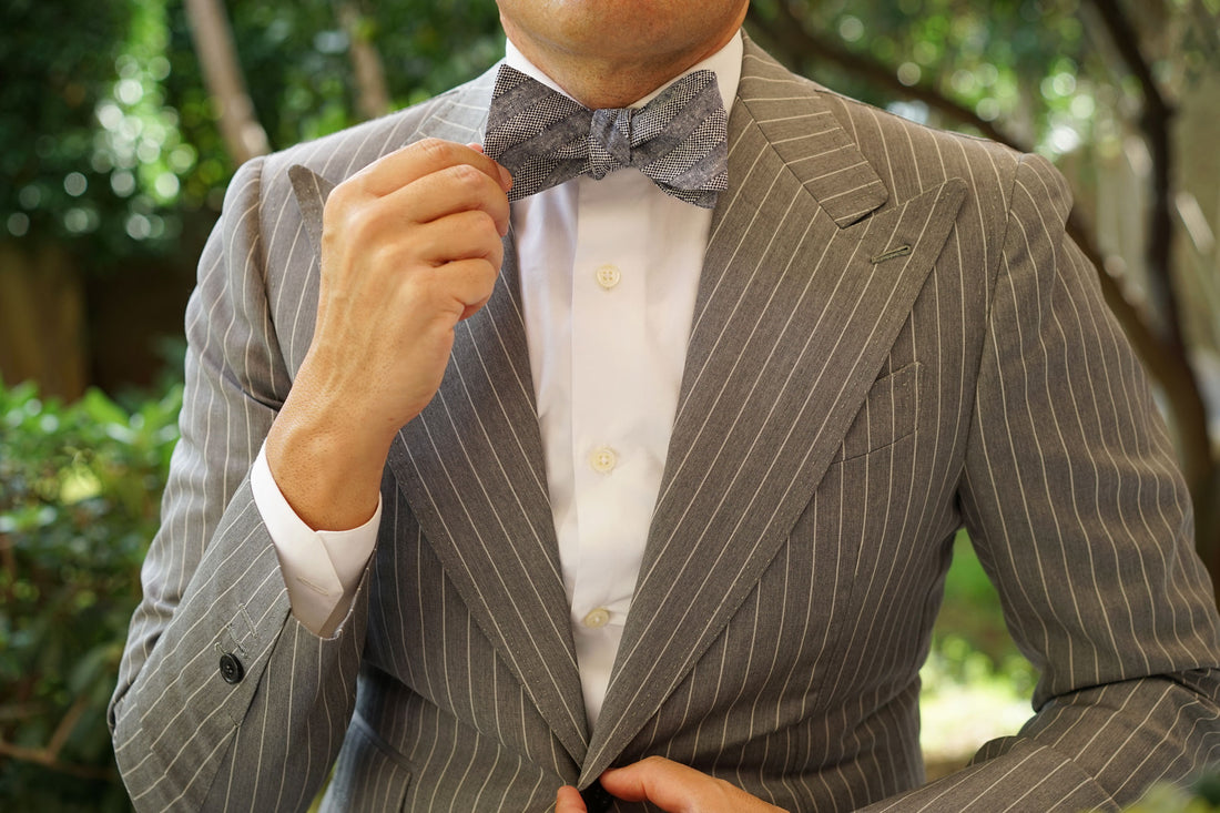 Rigorously prepared, the fabric has been cut, sewn and finished to have an enticing combination of coarse and soft texture to the touch, complimenting the alternating size of the black and white checkered stitching that diagonally lines the body of the Untied Bow Tie. Released exclusively by the Melbourne based Brothers at OTAA, the Manarola Navy Tweed Striped Linen Untied Bow Tie will elevate your formal stylings higher than a 15th-century flying machine.