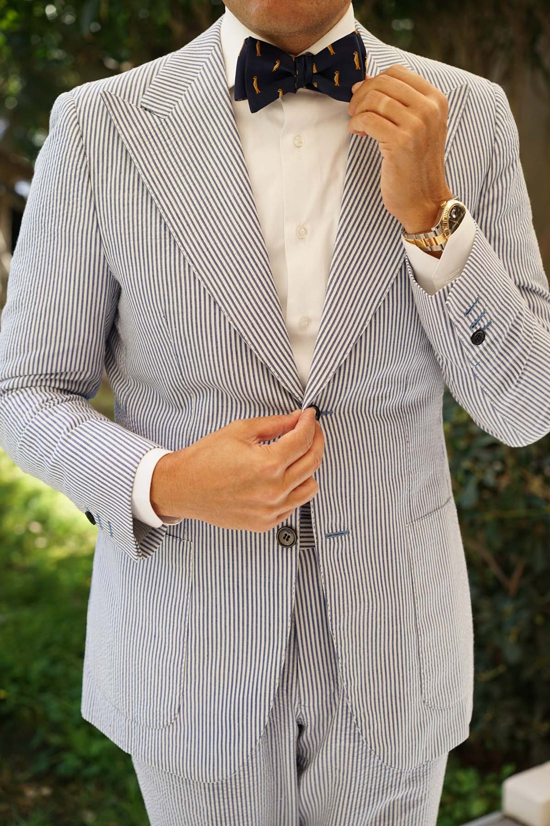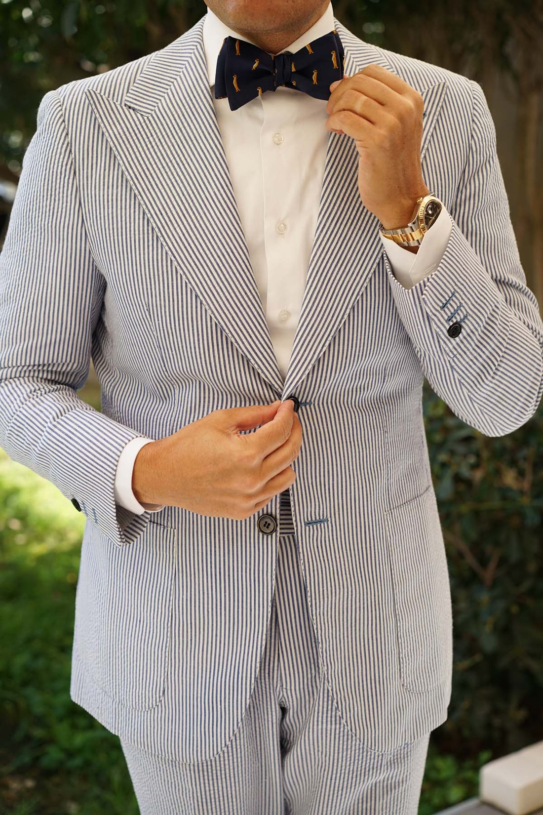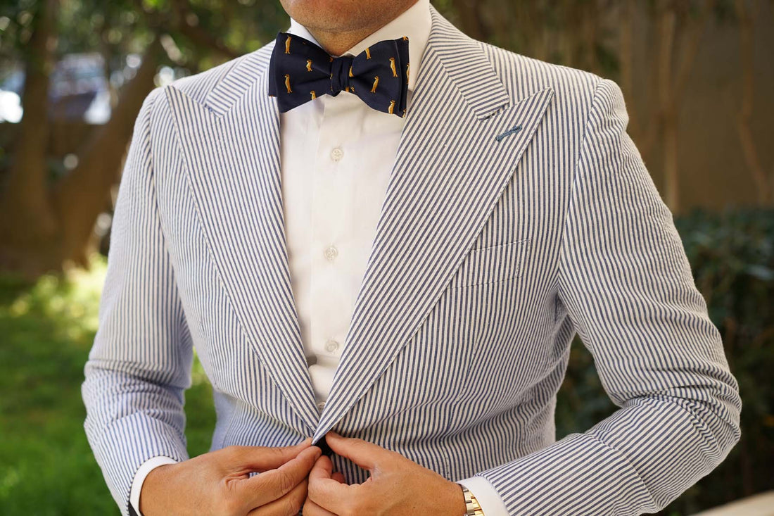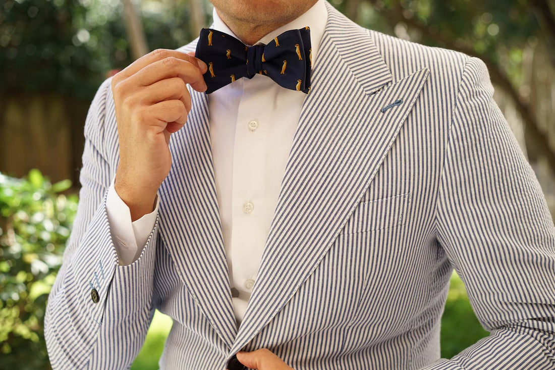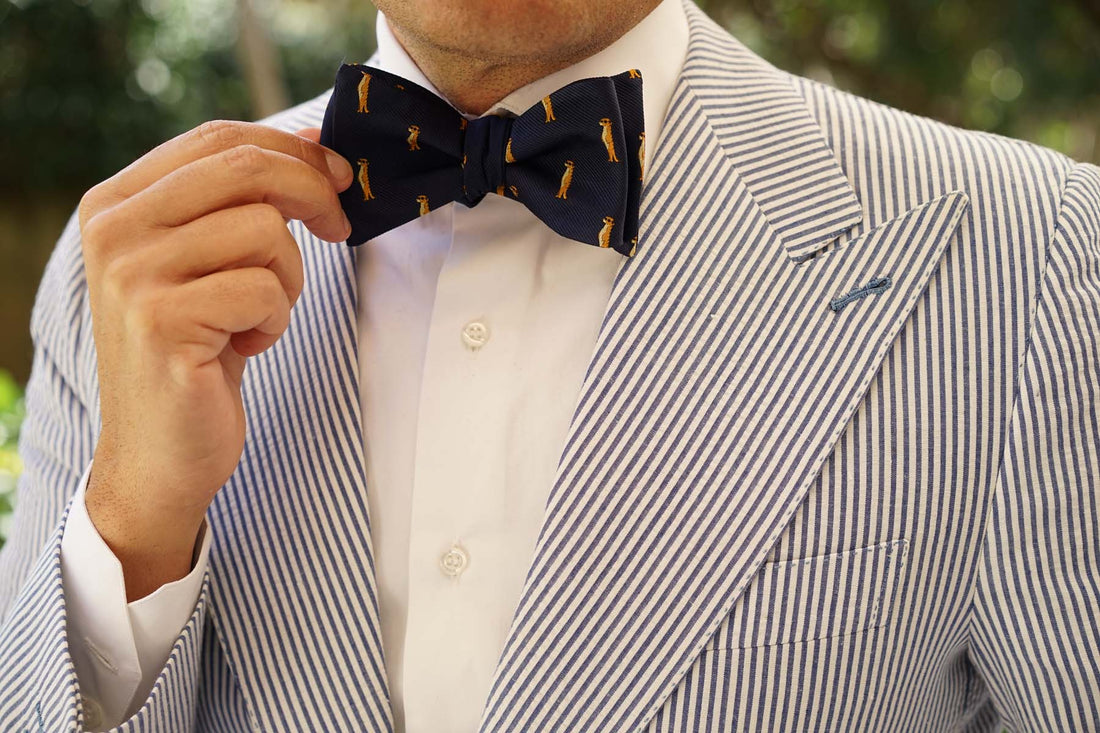 The elder brother at OTAA justifies the Meerkat Self Bow Tie – “If we’re going to do the Animal Kingdom, we’re going to cover every animal, especially the meerkats." The hand-sewn method allows the Meerkat Self Tie Bowtie to exhibit extraordinary detail as there is little machinery used in the crafting of this tie. Touches such as these make all the difference. Meerkats live in areas of clumpy grassland and deserts in the southern area of the African continent, including the Kalahari Desert in Botswana, the Namib Desert in Namibia and south-western Angola in South Africa. Inspired by the loveable mongoose, this Meerkat Self Bow Tie exudes sophistication and is hand cut and sewn on a classic navy backing. Designed exclusively by The Brothers at OTAA.