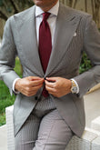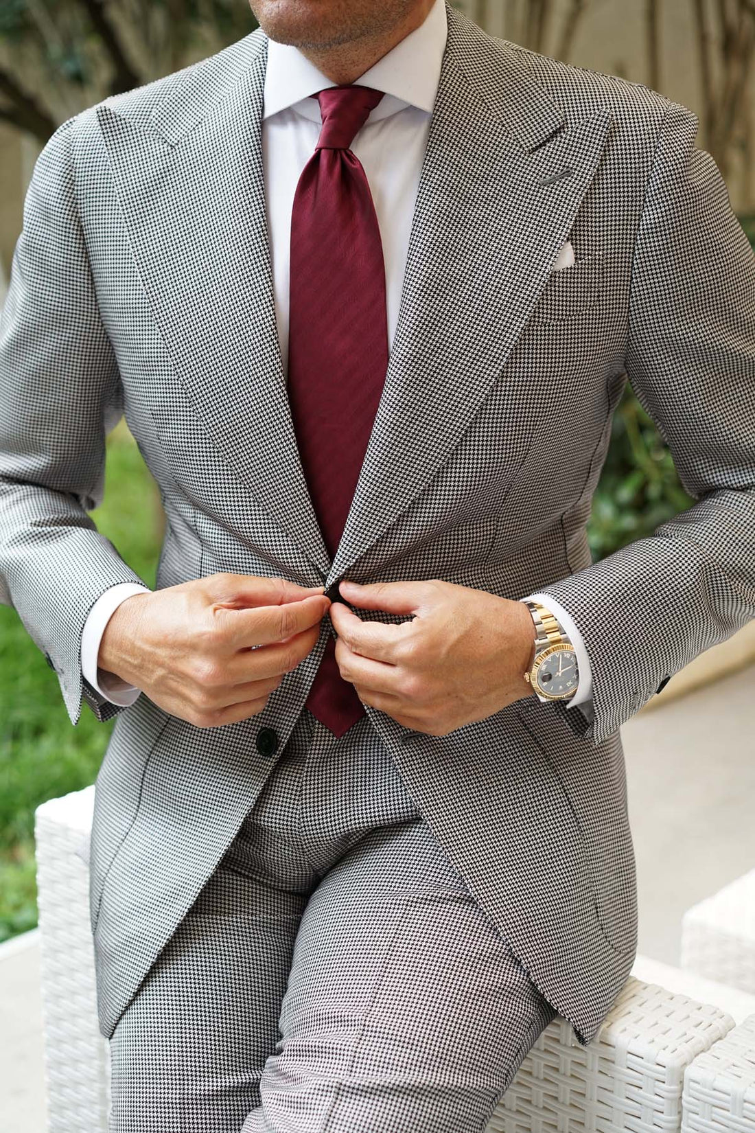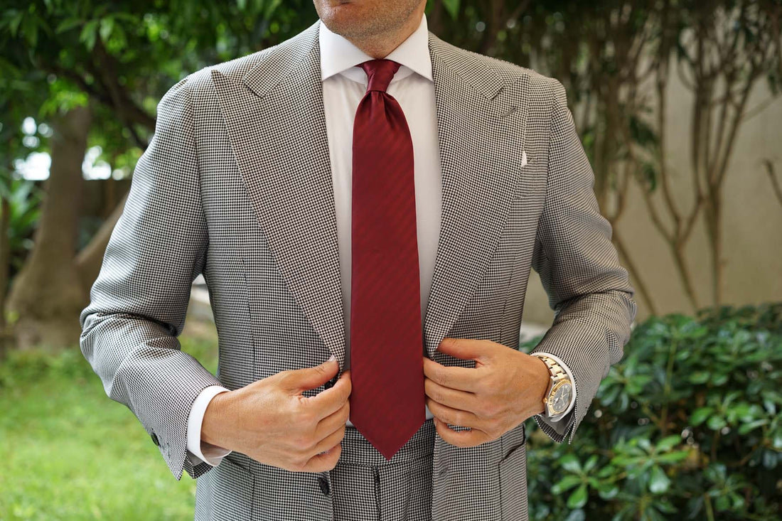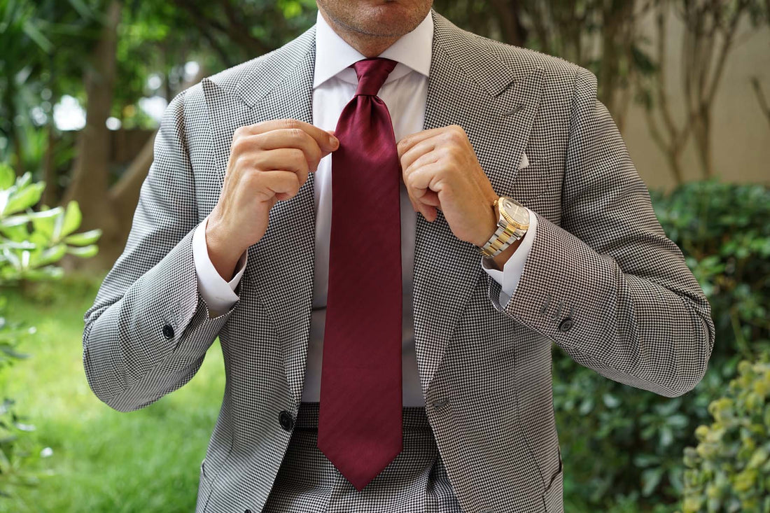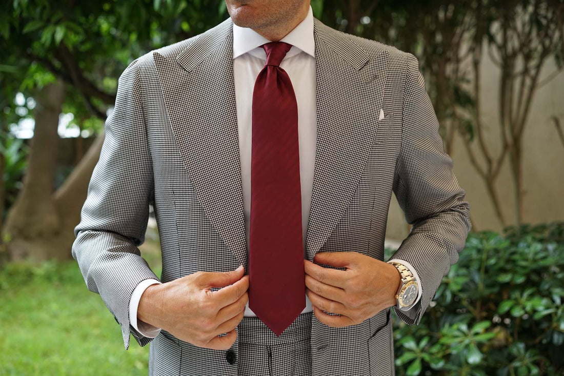 The Merlot Wine Striped Necktie is a full-bodied and well-balanced bit of tailoring presented in a rich and lustrous cabernet colour, sure to stand up against the most stringent of tests. Containing aromas of currants, pomegranate skins and gushing cranberry. Piquant acidity stabilises the necktie nicely with the robust tannins. Deep red linens, laden with a deluxe thread, charred fabric, roasted satin and mulled humour.