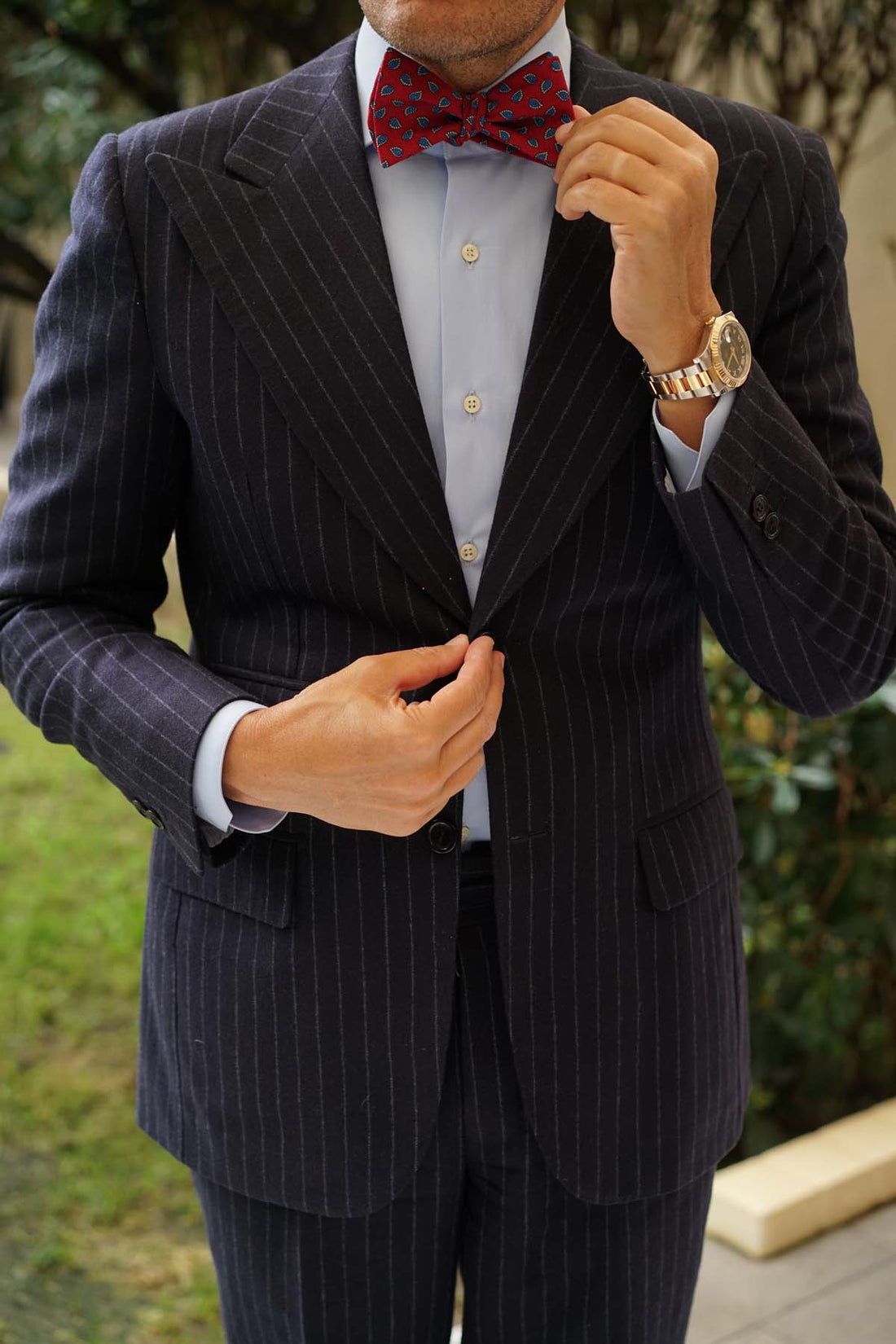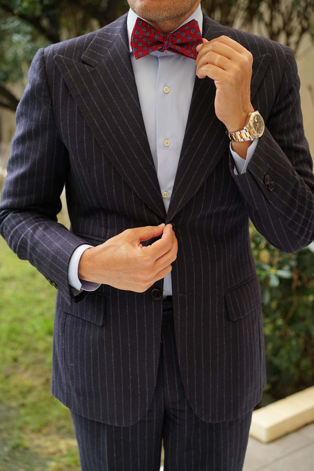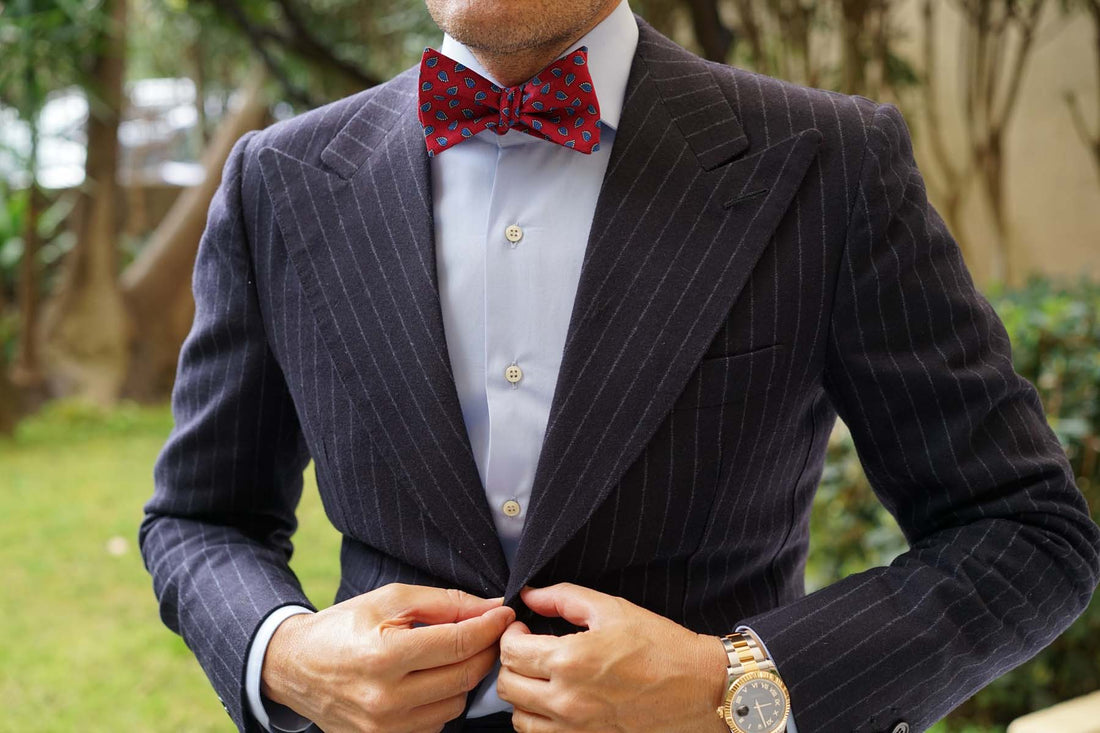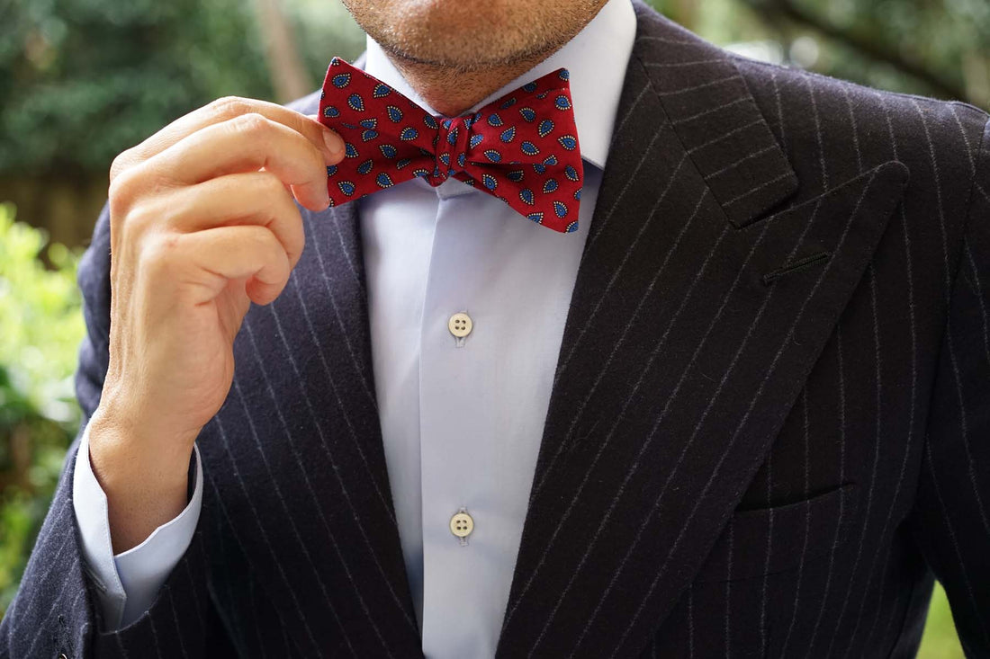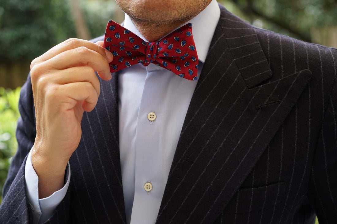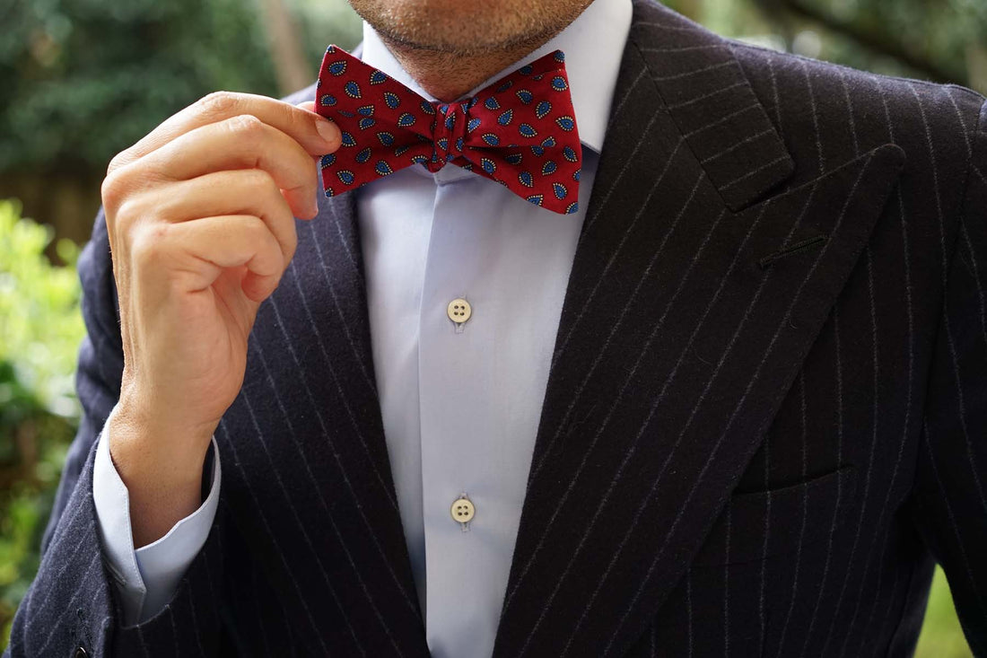 Hand-stitched and tailored with expertise, this Milano Burgundy Red Paisley Self Tie Bow Tie showcases the label’s dedication to superior quality. The indulgent wine hues of burgundy are met with ebullient blue and yellow paisley teardrop features for an artistic outlook. Designed exclusively by the Brothers at OTAA, this handsome self tie bow tie offers an accomplished accent to your formal outfits.