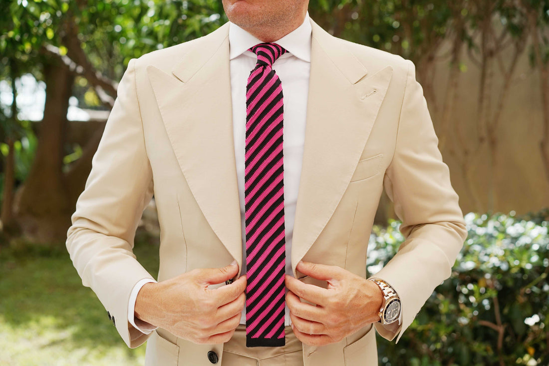 This ebullient knitted tie features a diagonal striped design with pink and black features an a luxurious textured body. Tailored to perfection, this tie features a square-cut finish and superior quality. Wear the Mr Rhames Black & Pink Striped Knitted Tie to boardroom meetings and off-duty events to elevate your looks with a textural benchmark.