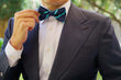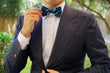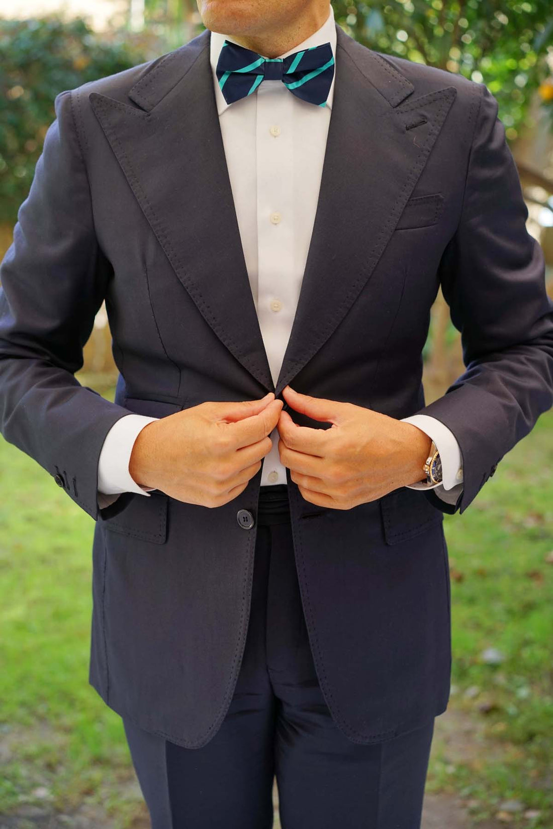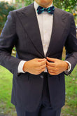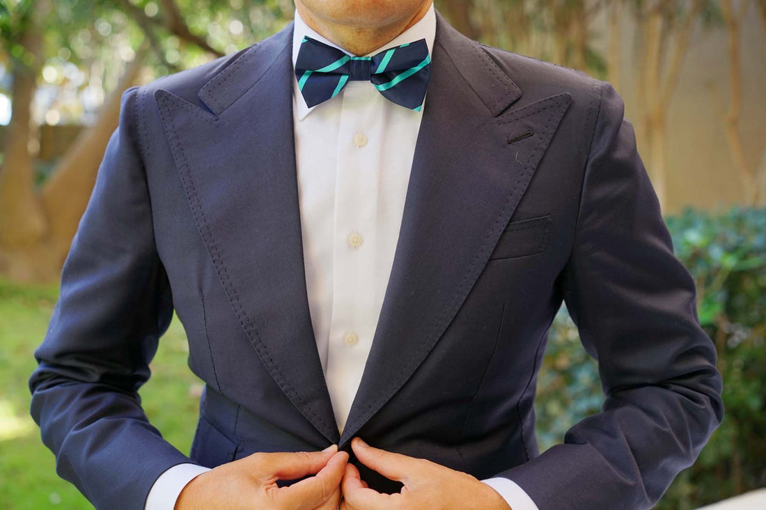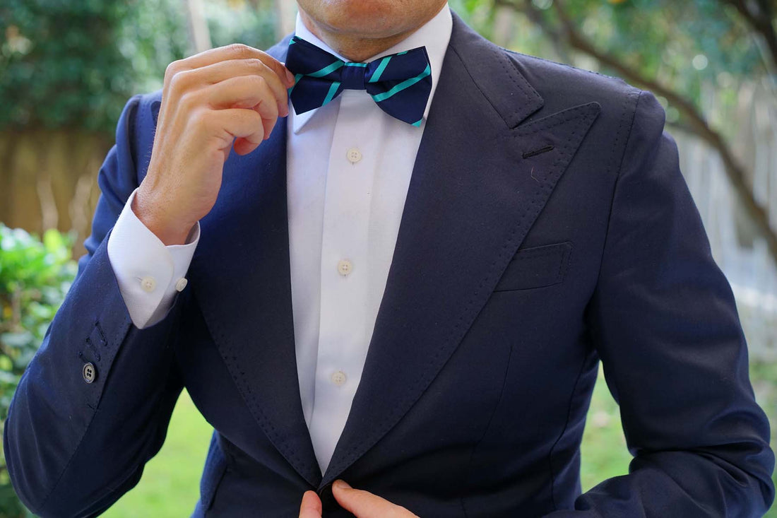 The Navy Blue Bow Tie with Striped Light Blue is a striking yet classy design. The thin pre-tied bow tie look suits the simple design and would be ideally worn with a 3 piece suit.