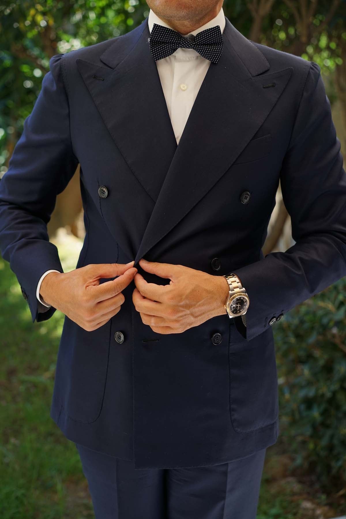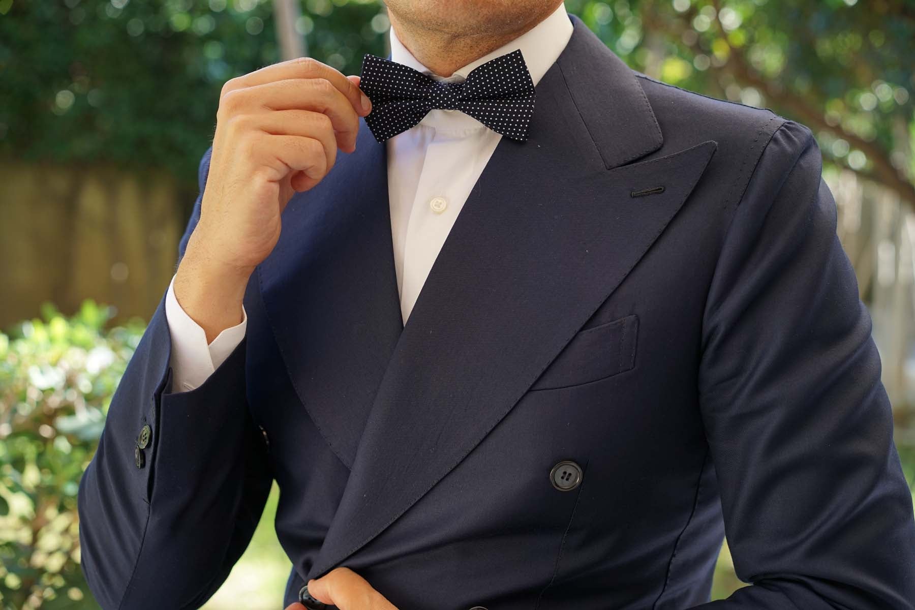 Menswear style is all about the details, and this simple polka dot print is sure to do the trick. Made from soft, breathable cotton, this Navy Blue Cotton with White Mini Polka Dots Bow Tie gives an updated spin on a classic print.
